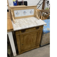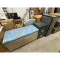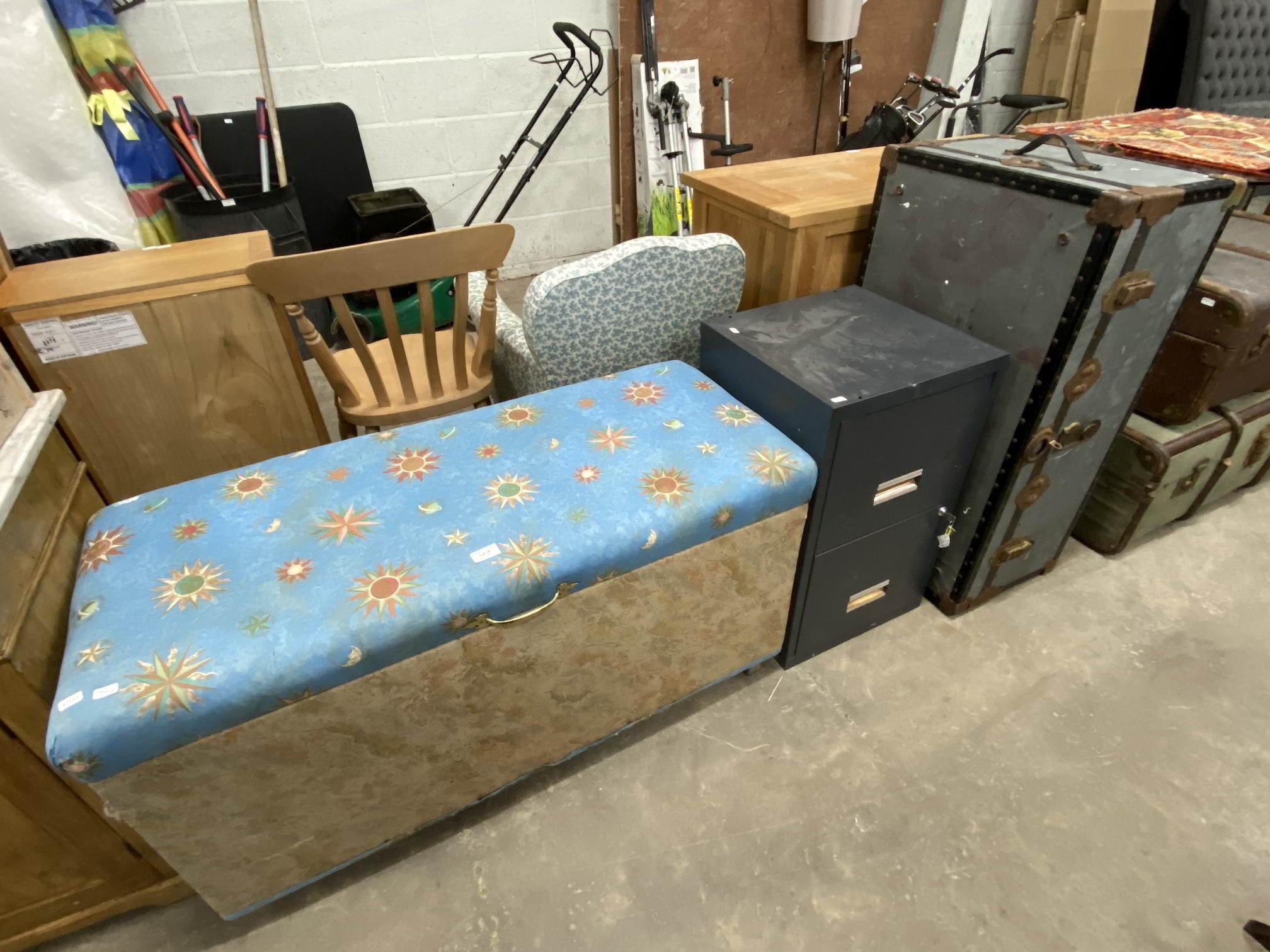 Blanket box 56H 110W 45D, metal two drawer filing cabinet with keys 67H 40W 40D and an aluminium bound trunk 36H 92W 51D