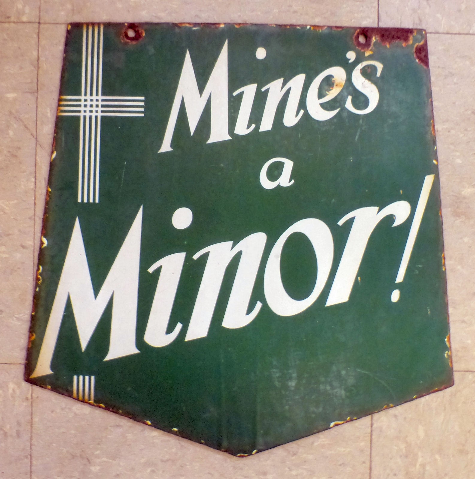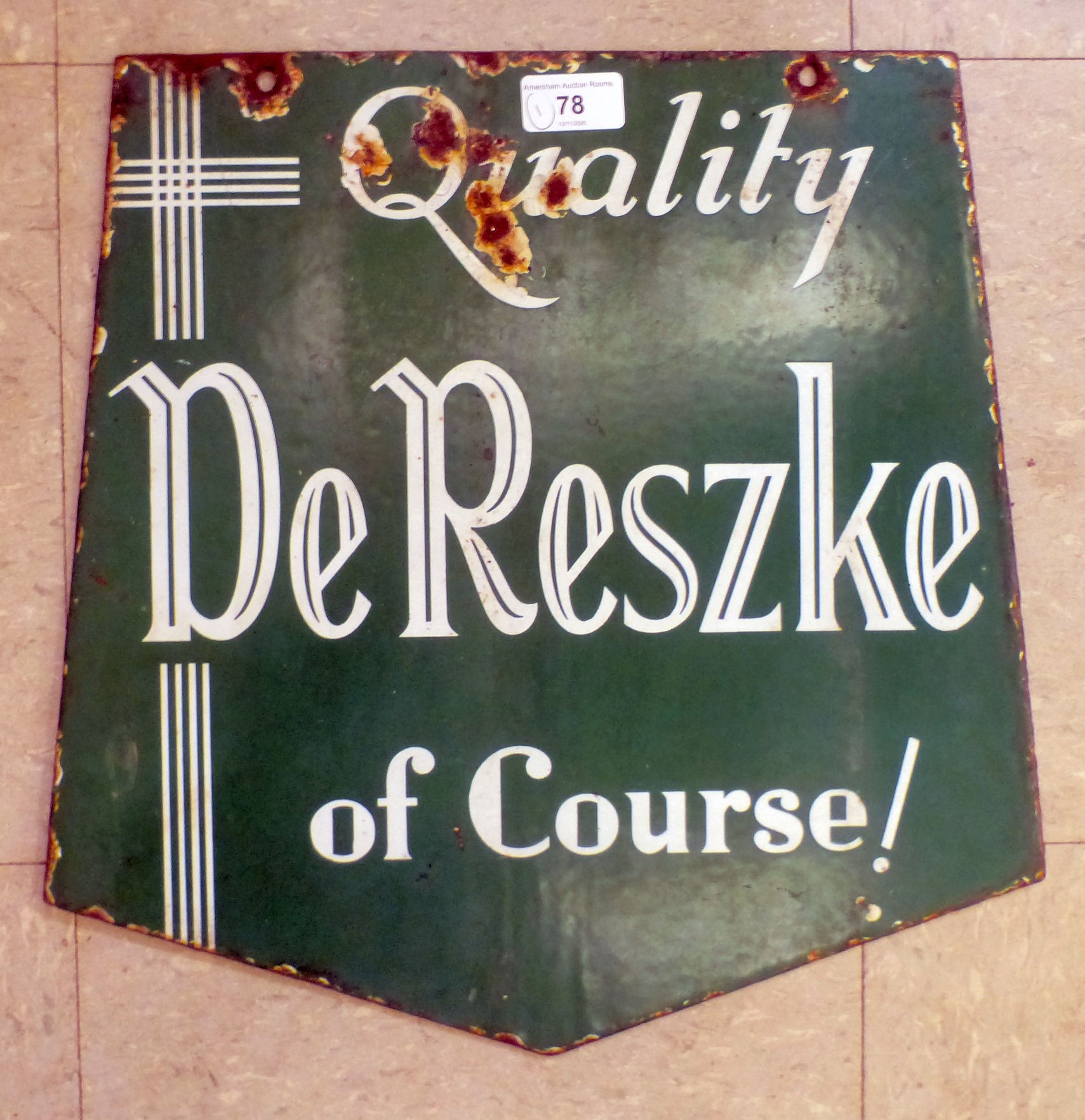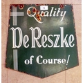 A vintage two sided white on green enamelled sign 'Mines a Minor!' and 'Quality de Reszke of Course' on the obverse 14" x 15"