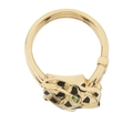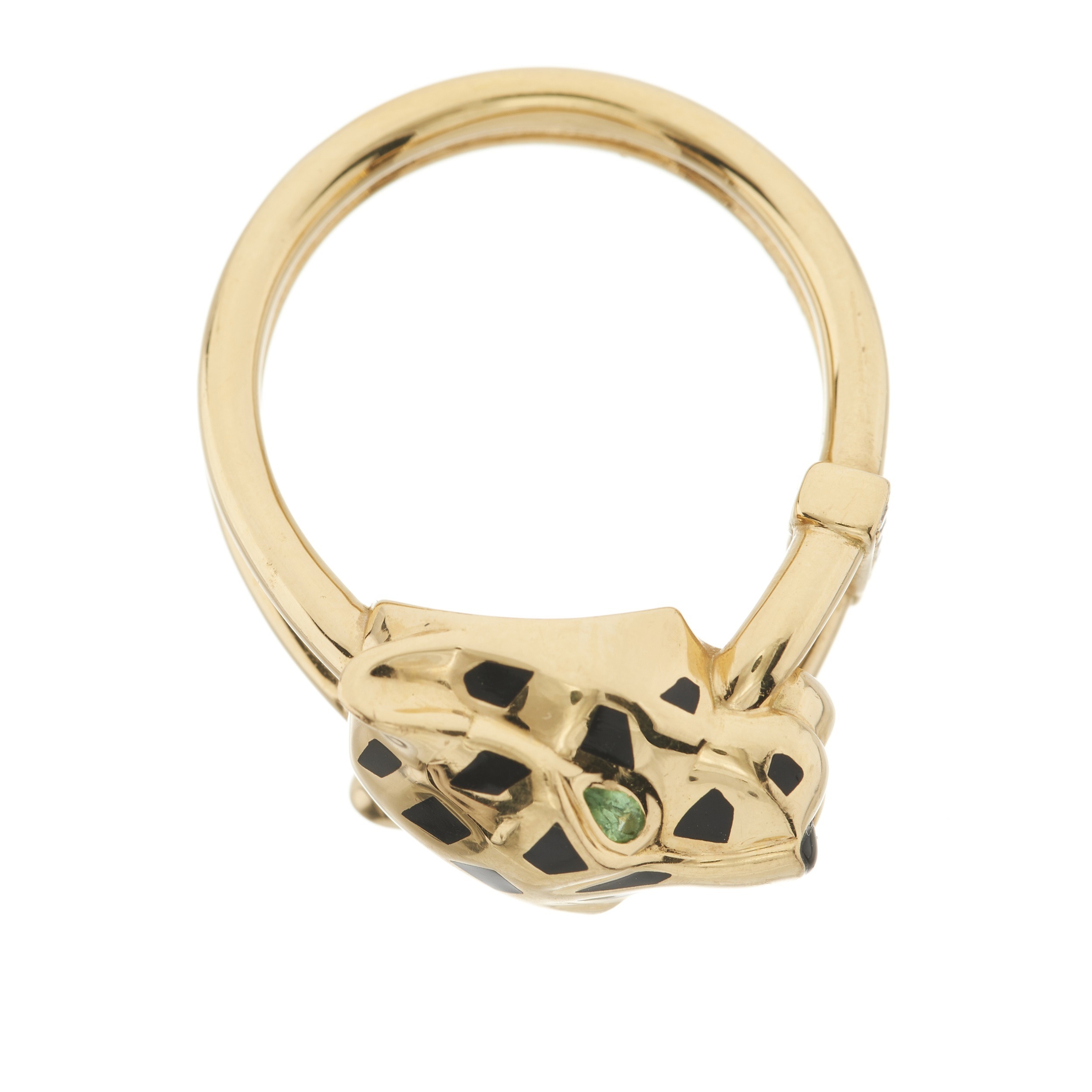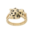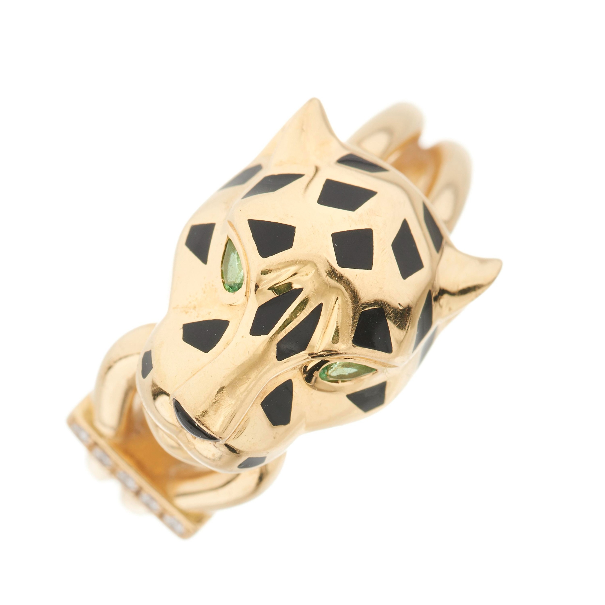 Cartier, an 18ct gold brilliant-cut diamond and black lacquer Panthere de Cartier ring, with green garnet eyes and onyx cabochon nose, signed Cartier, serial DIS768, Swiss convention marks, Cartier size 50, ring size K, with maker's case, certificate and photocopy of original purchase receipt, 8.8g