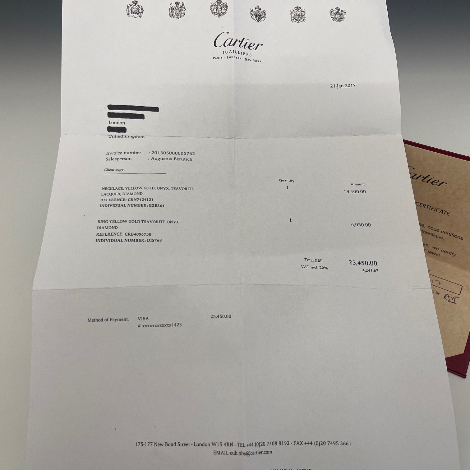 Overall good condition Moderate general wear, surface scratches to band Green garnets in good condition, good clarity and well matched Diamonds bright, lively and well matched, good condition Enamel in good condition, no chips or scratches Copy of original purchase receipt dated 21-Jan-2017 for an amount of £6,050 (incl. VAT) Maker's certificate dated 21.01.17 Clients are advised to view and inspect items before bidding and they must satisfy themselves as to the condition of every lot