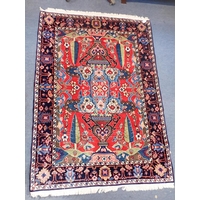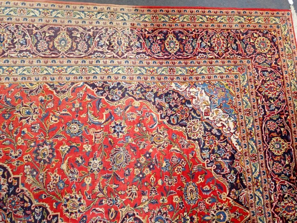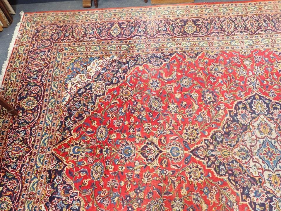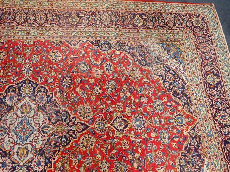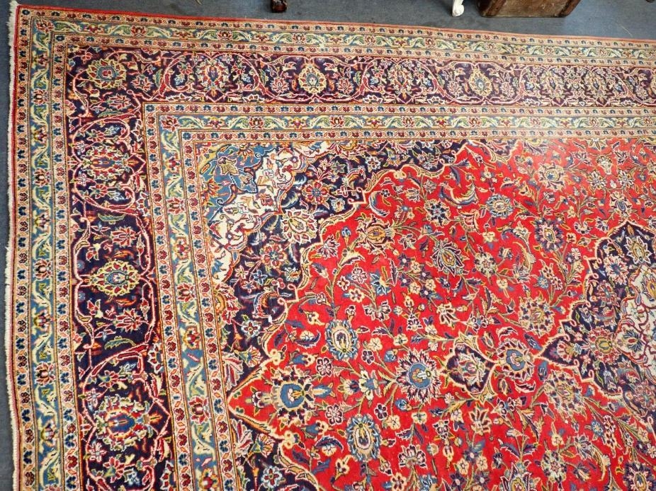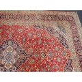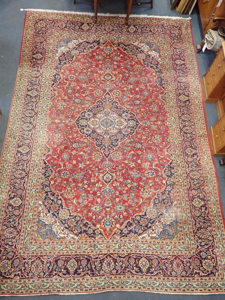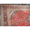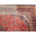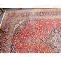 A LARGE RED GROUND RUG OF KASHAN DESIGN280 x 416cm plus fringes (wear, unevenly faded)