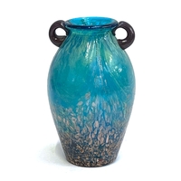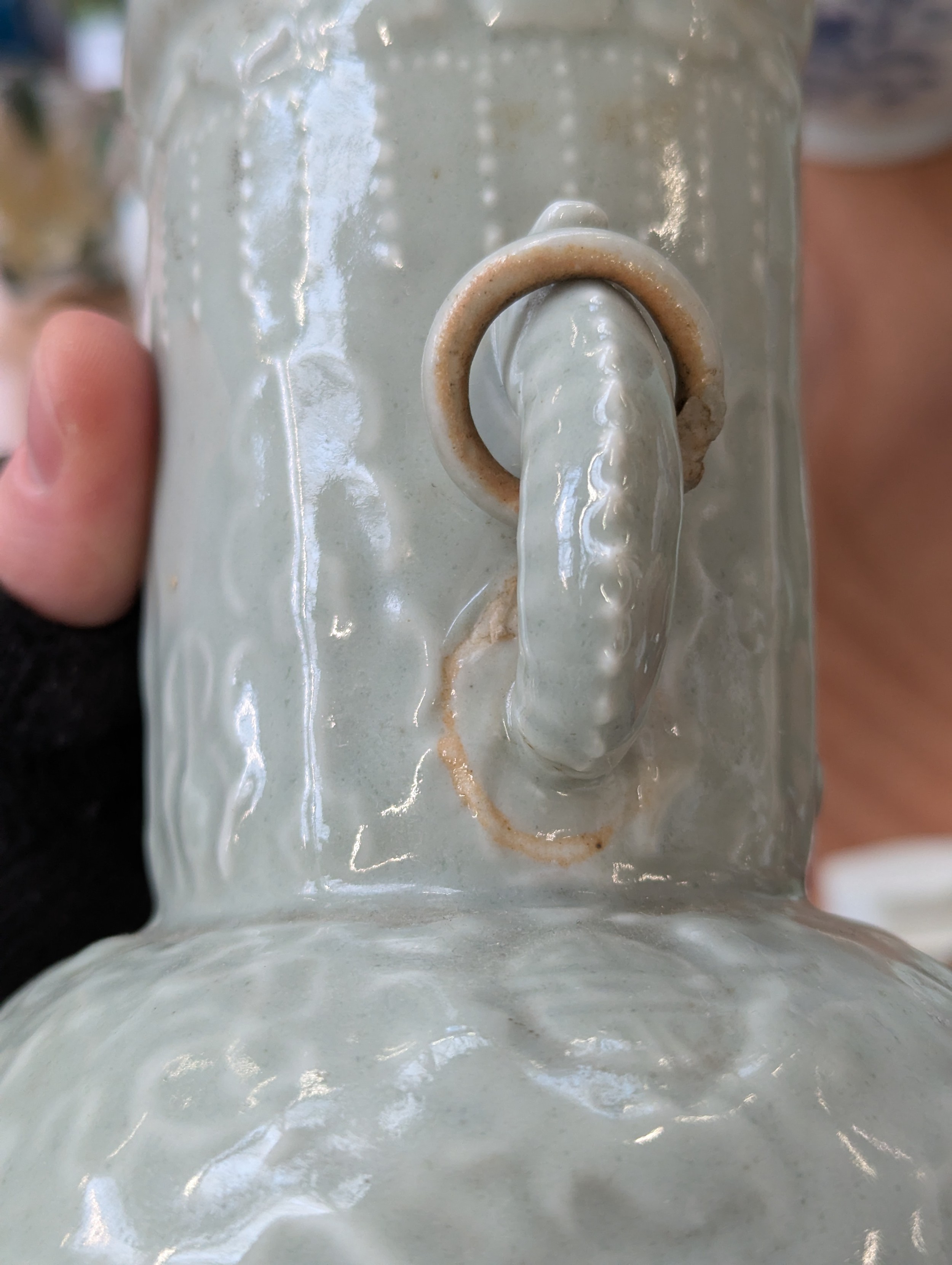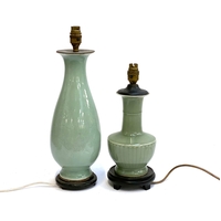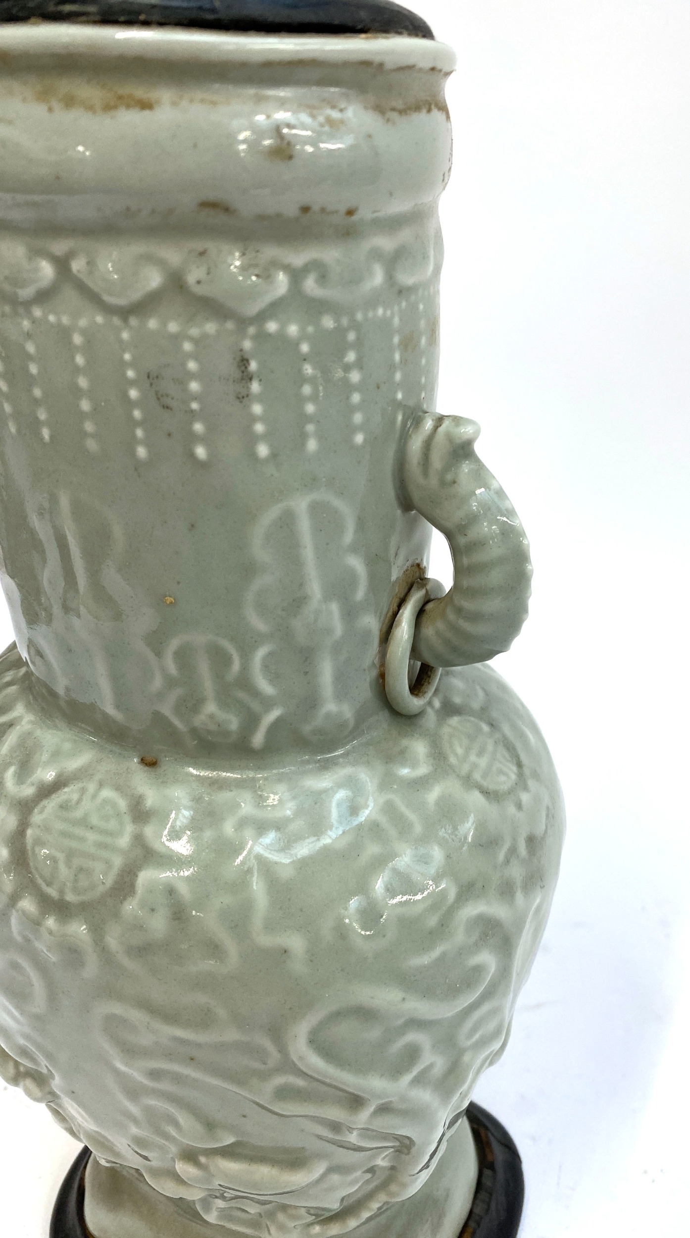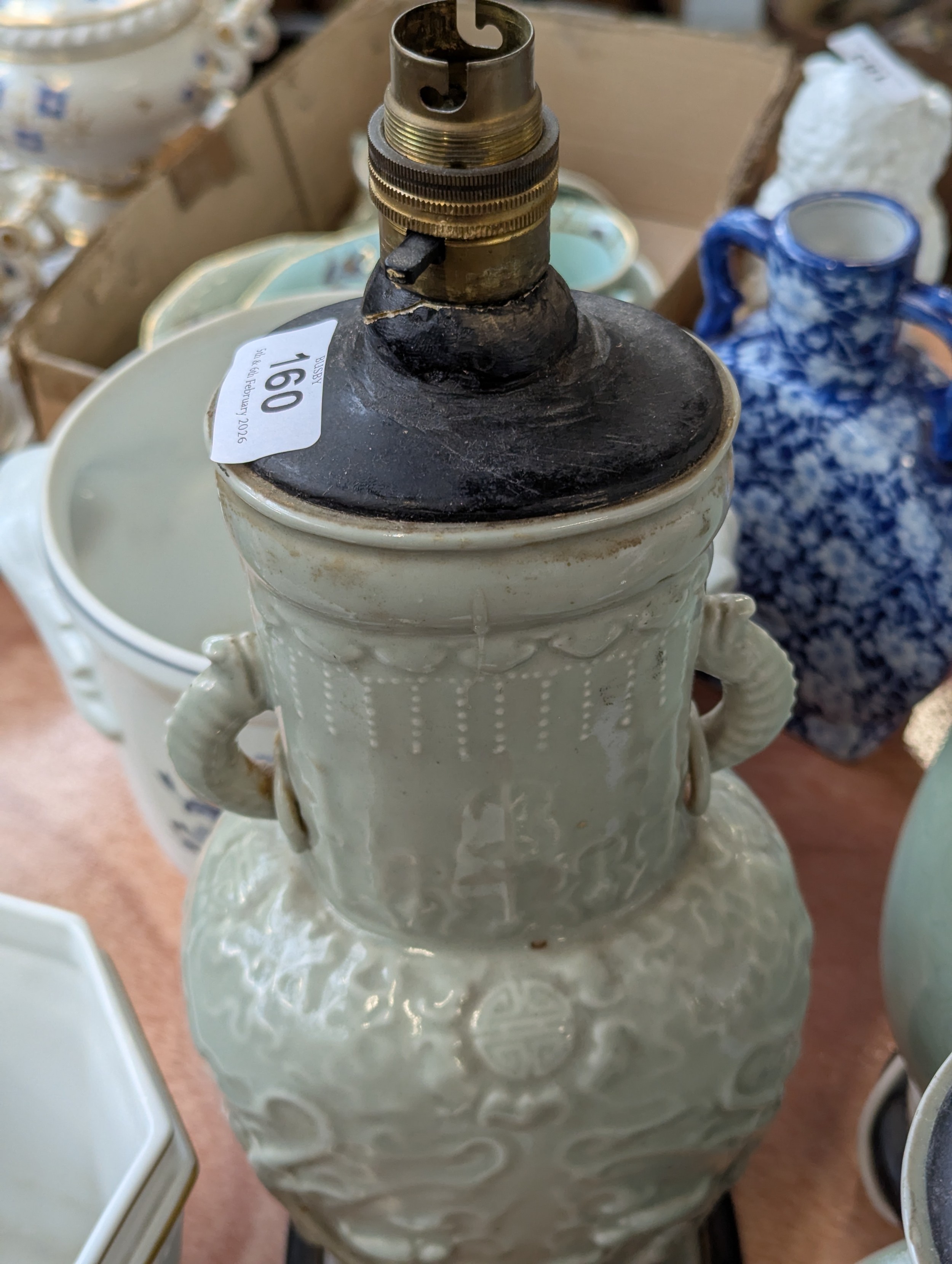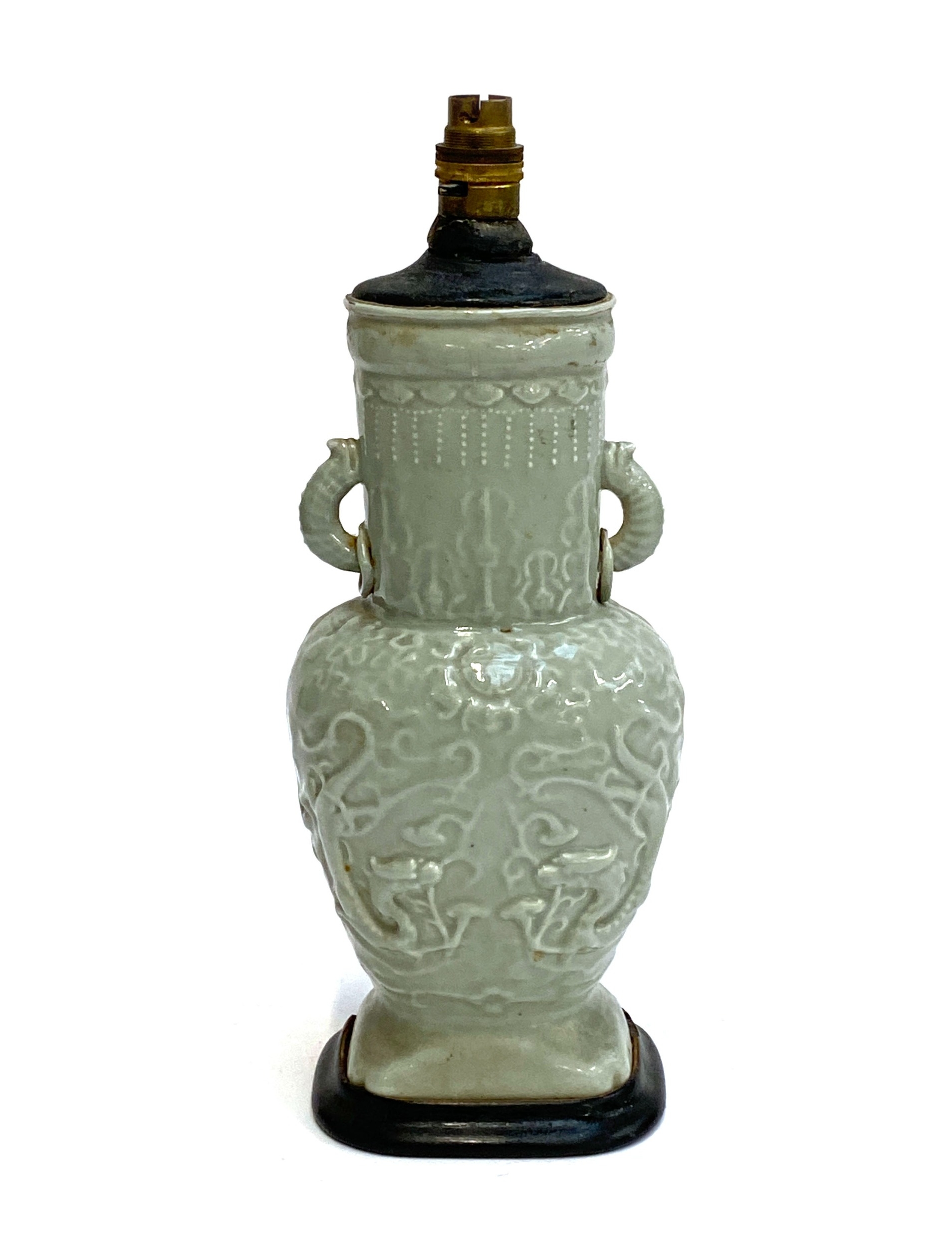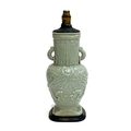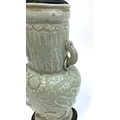 A Chinese twin handled celadon glazed vase converted for use as a table lamp, with twin dragon lug handles (one with loop AF), and central Shou medallion, the vase 31cm high excluding fittings