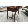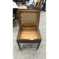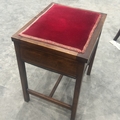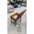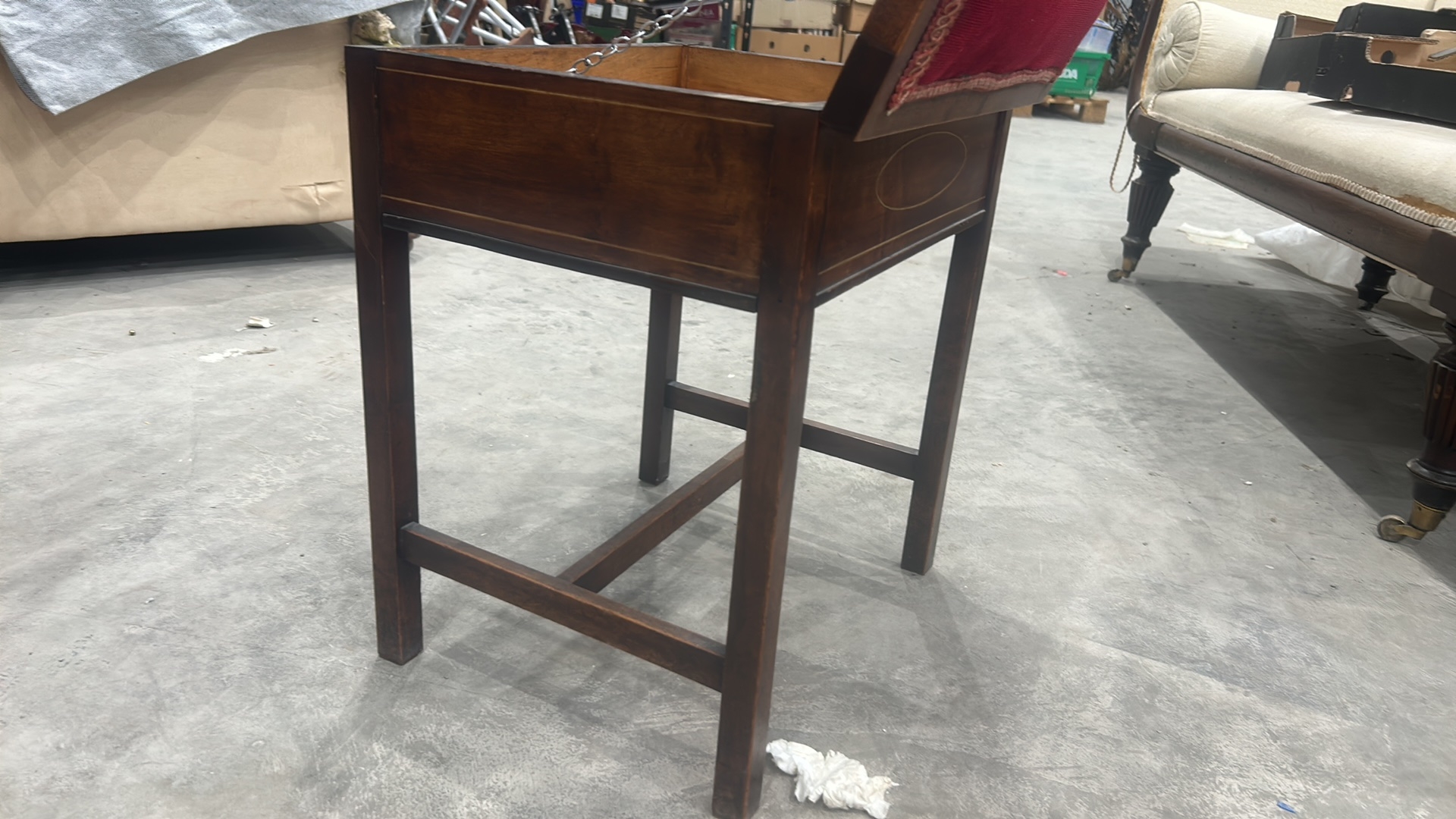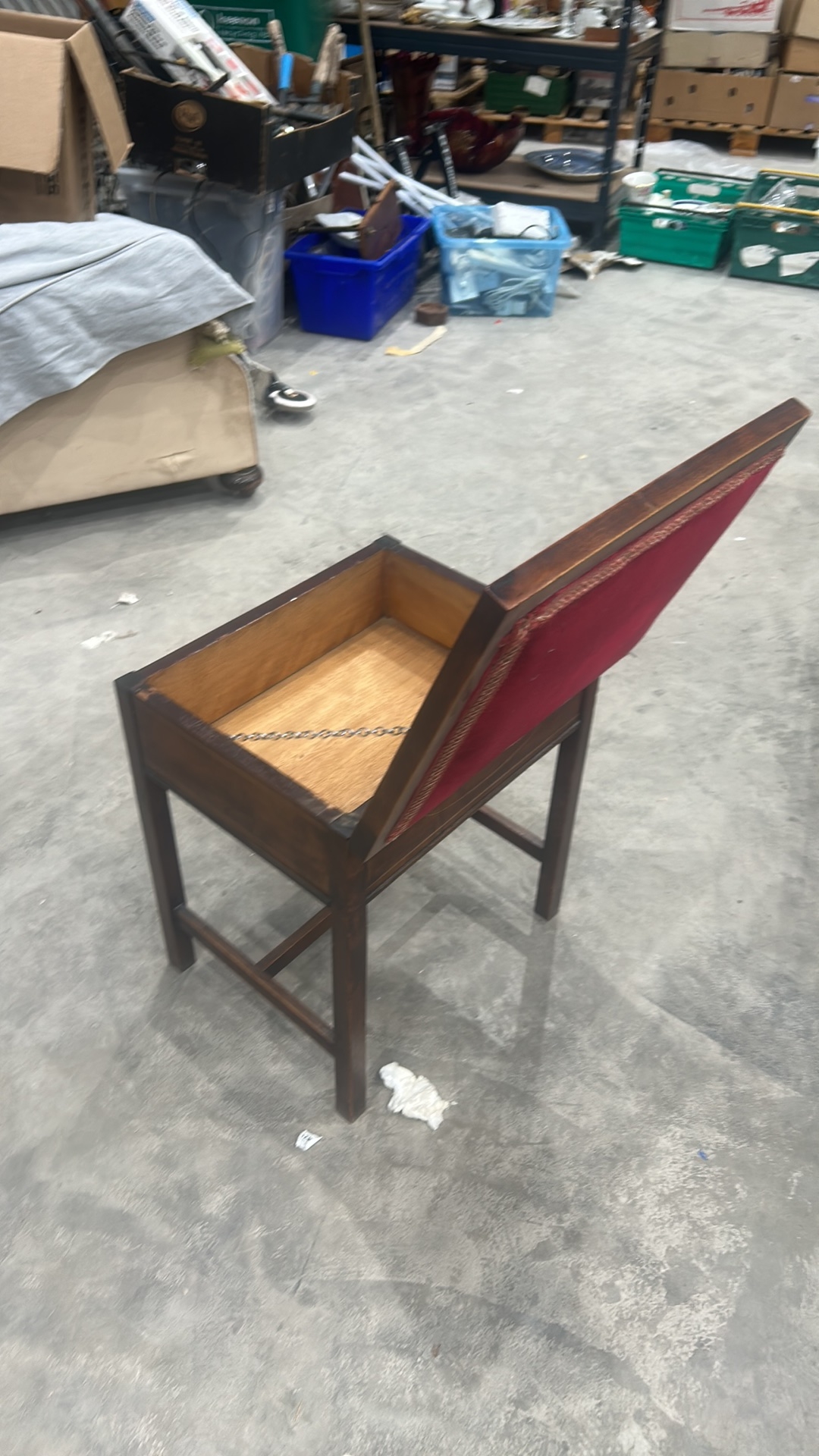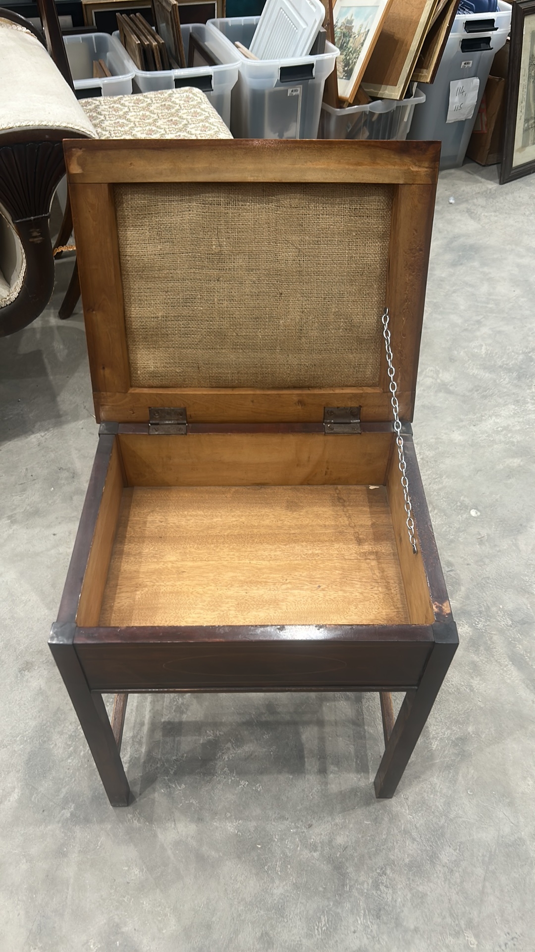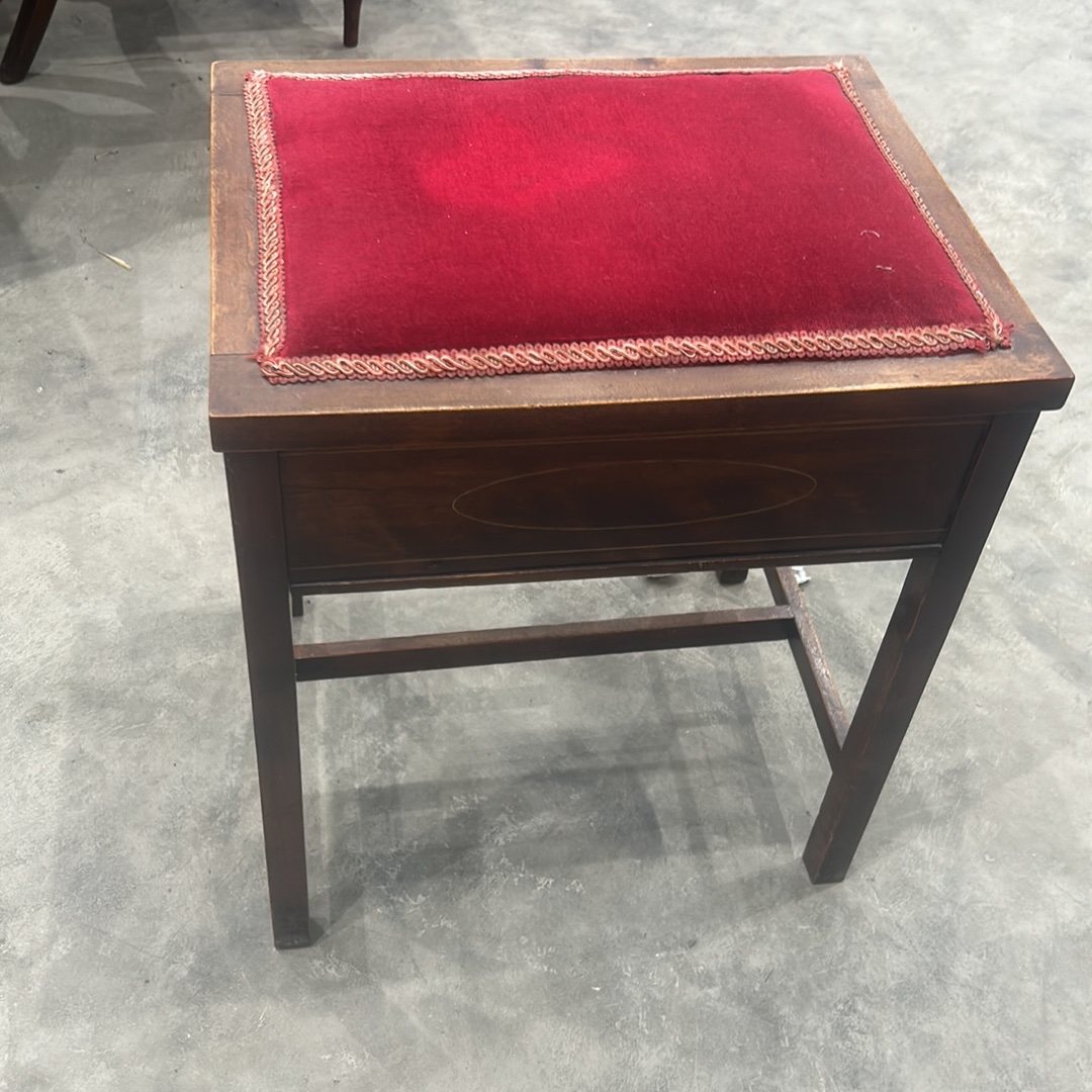 Edwardian mahogany hinged-top music stool, red velvet upholstered seat lifting to a box compartment, on square legs with stretchers and oval line inlay to the frieze.