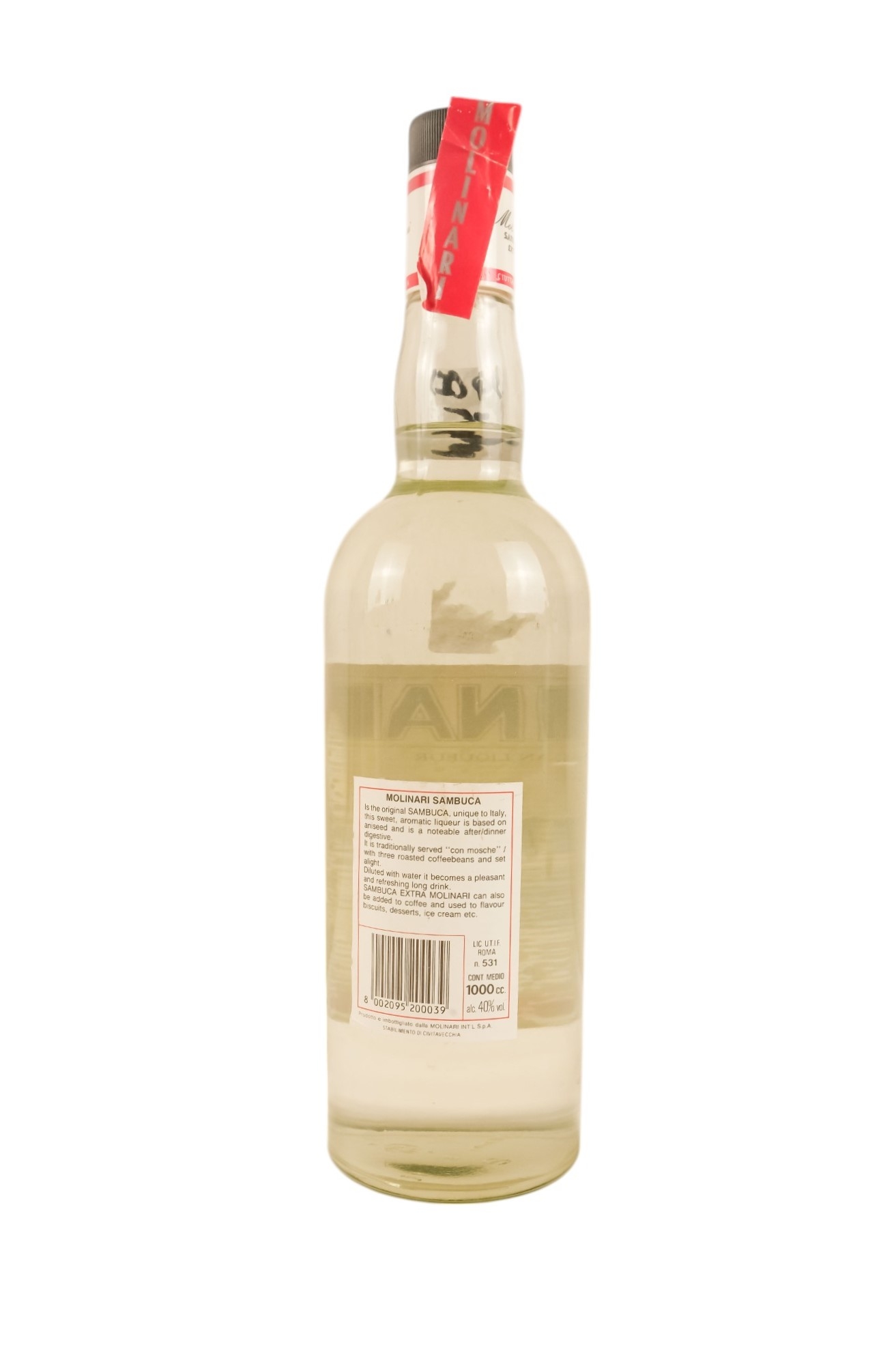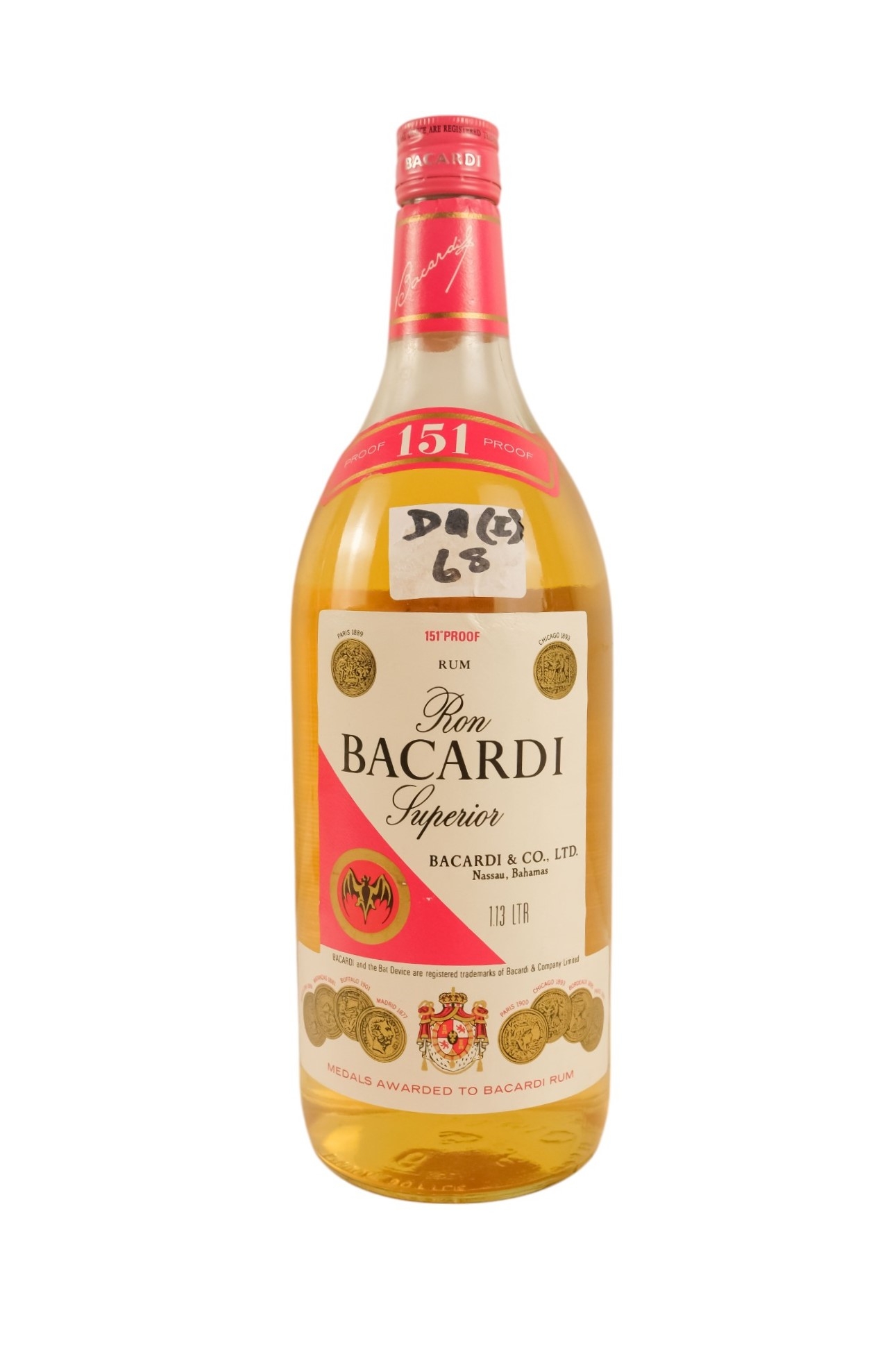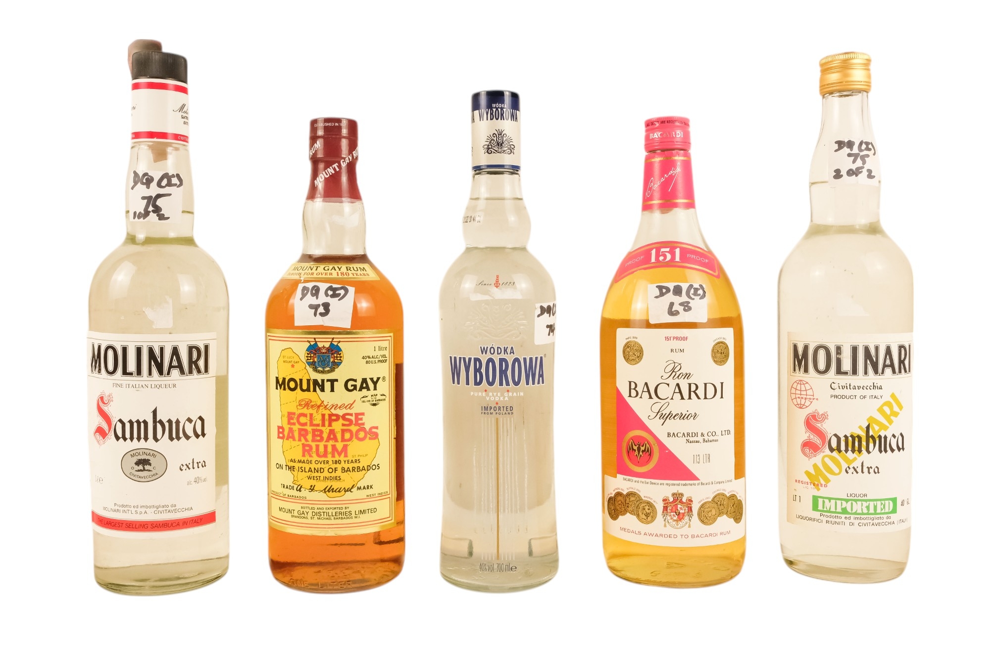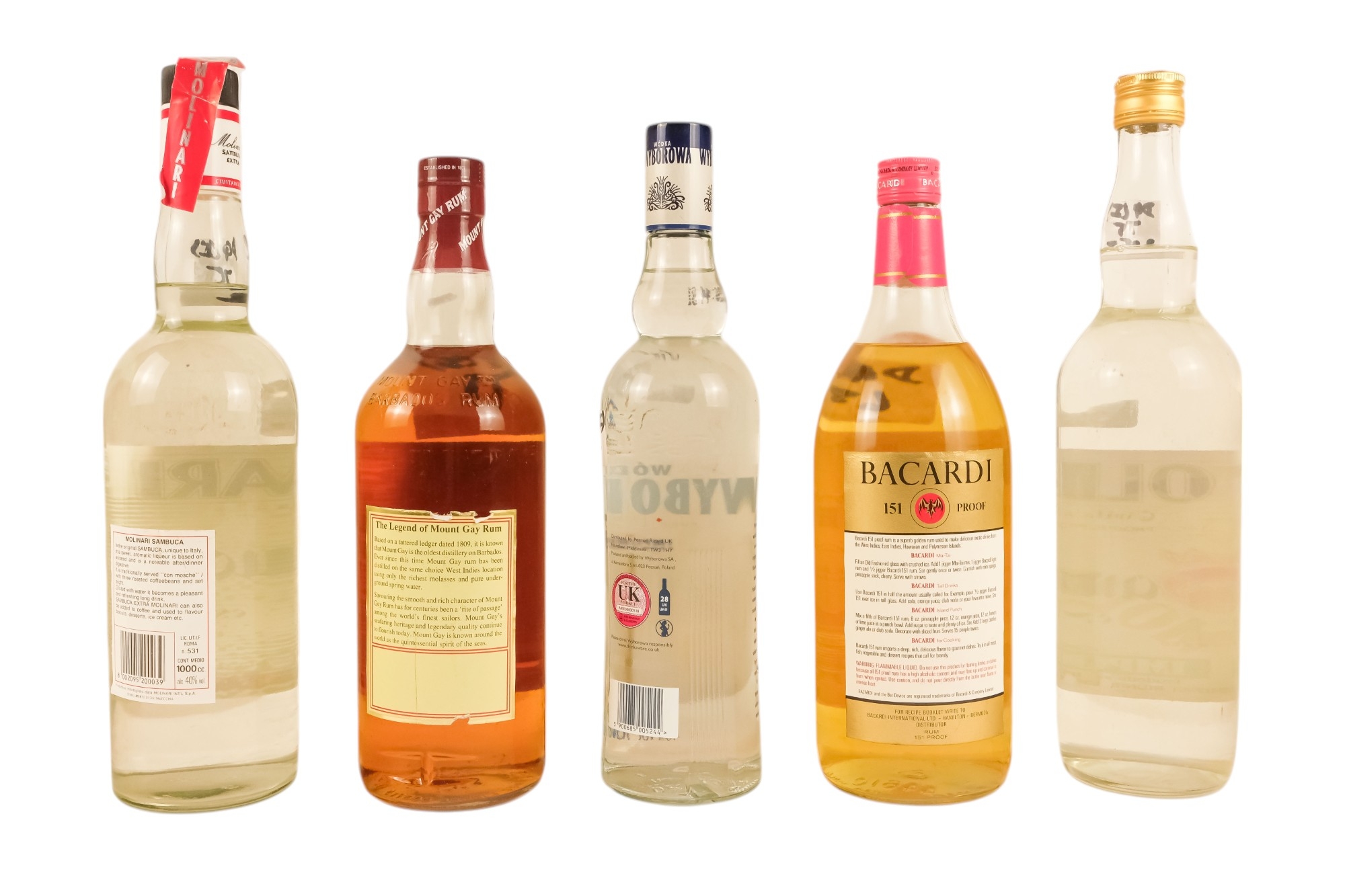 A bottle of Barcardi Superior, 1.13lt - together with a bottle of Mount Gay Refined Eclipse Barbados rum, 1 litre, two bottles of Molinari Sambuca Extra, each 1 litre and a bottle of Wyborowa vodka, 70cl.