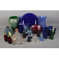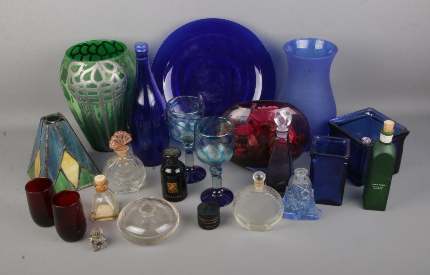 A collection of mostly modern coloured glassware to include stained glass lampshade, perfume bottles, Biba cosmetics, cranberry glass, etc.