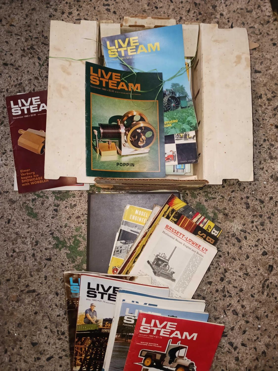 SMALL CARTON OF LIVE STEAM MAGAZINES, SCALEXTRIC MAGAZINES & VINTAGE BASSETT - LOWKE LTD CATALOGUES