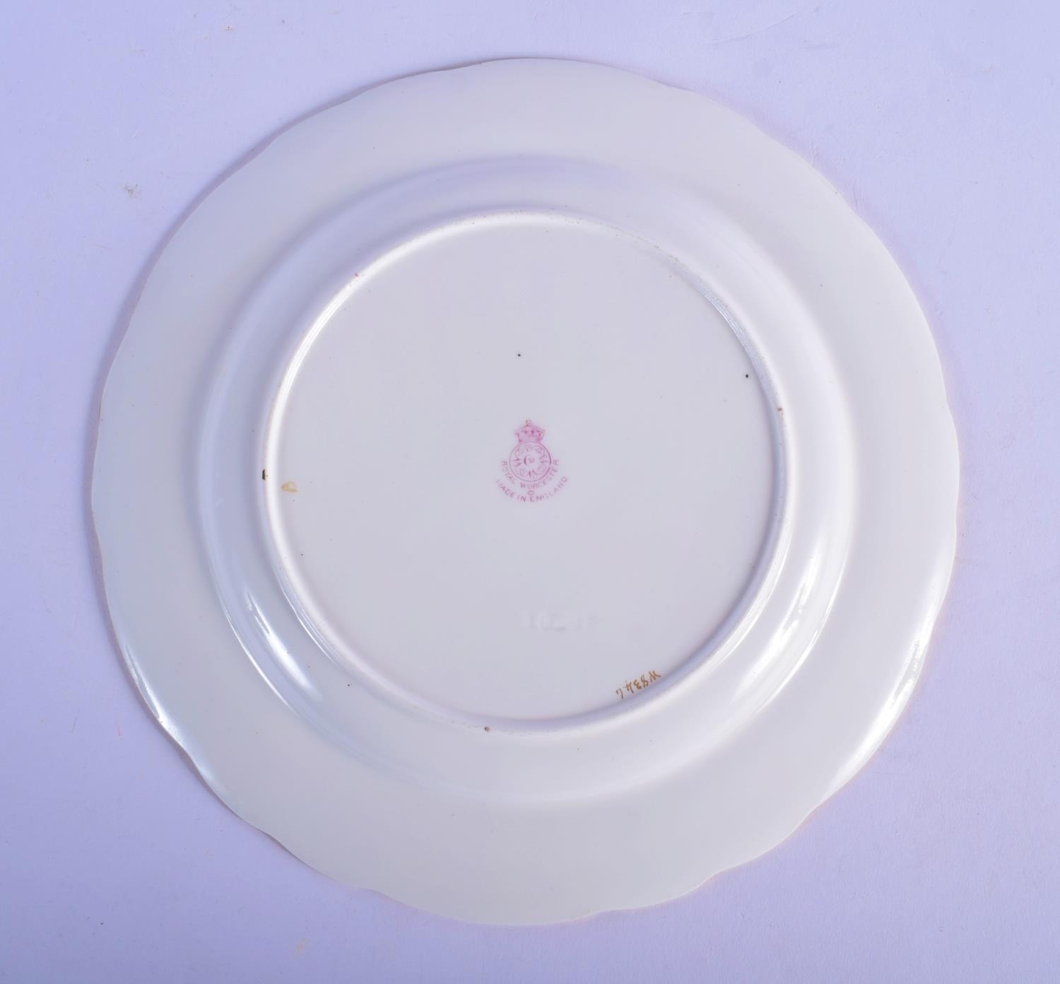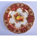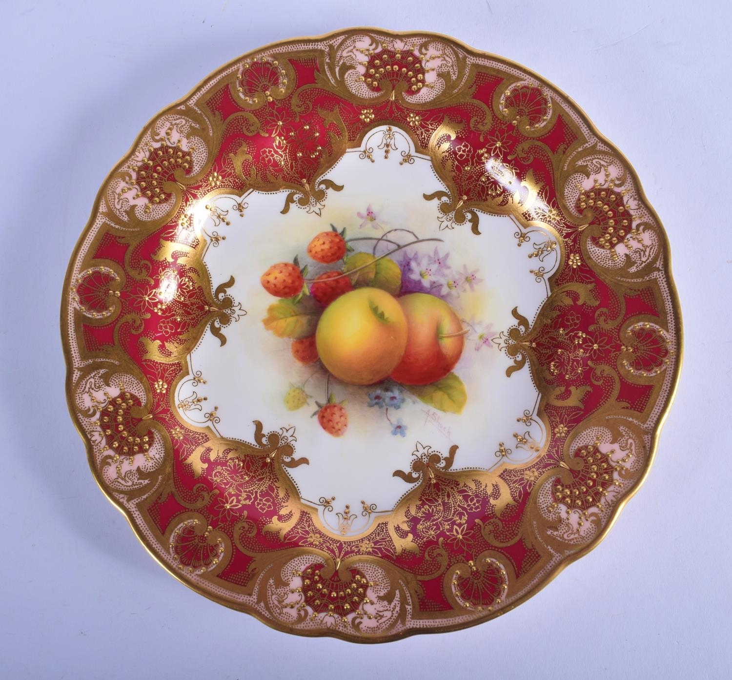 Royal Worcester fine plate with elaborate crimson and raised gilt border painted with fruit byA. Shuck, signed date code 1929. 23cm Diameter