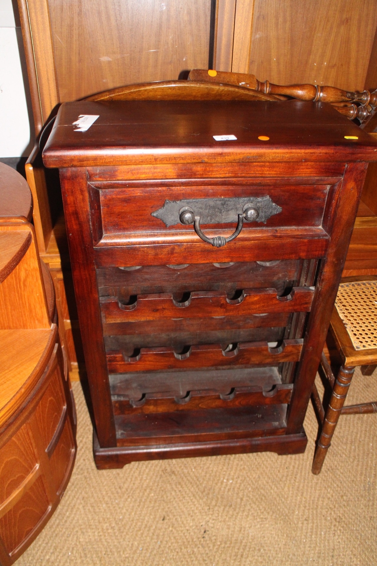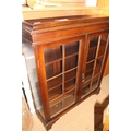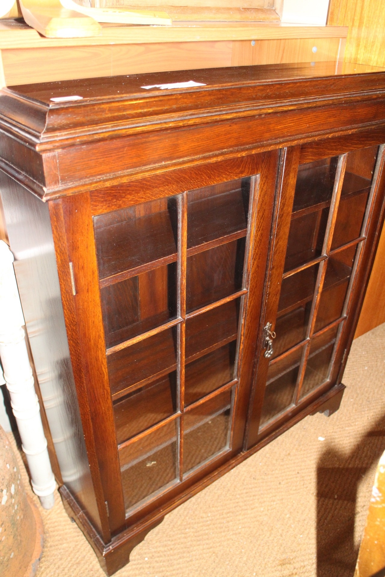 An oak two door glazed bookcase, 36" wide and a wooden wine rack fitted drawer over, 24" wide