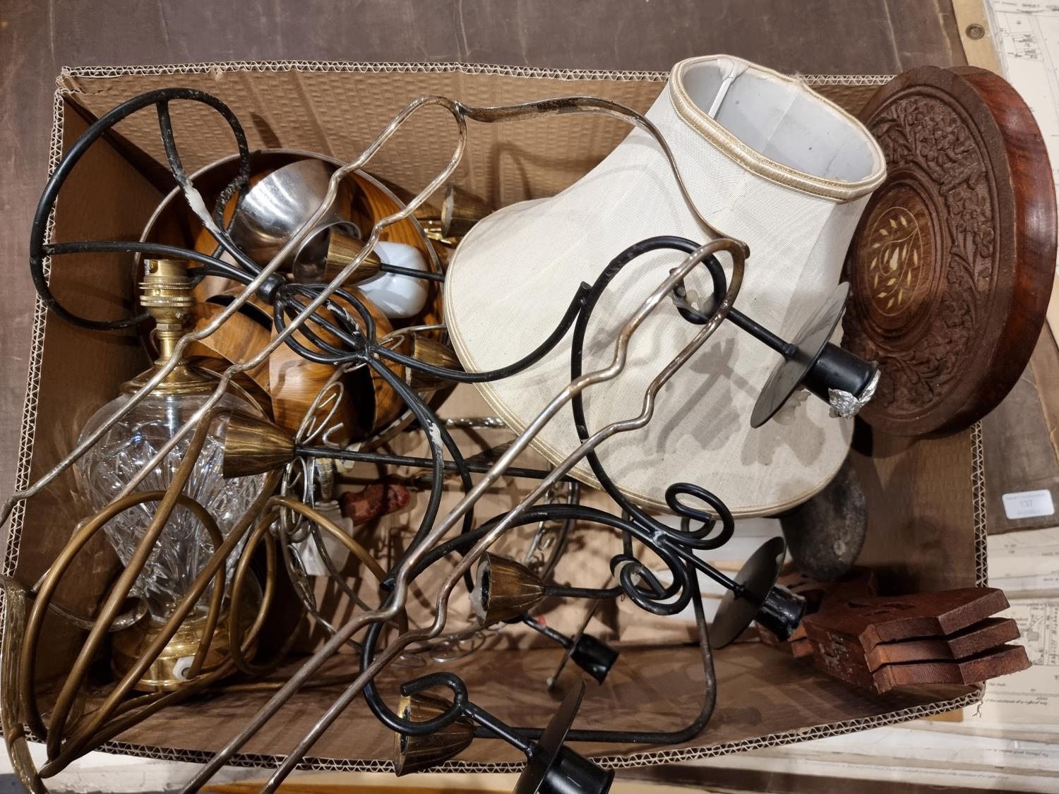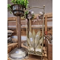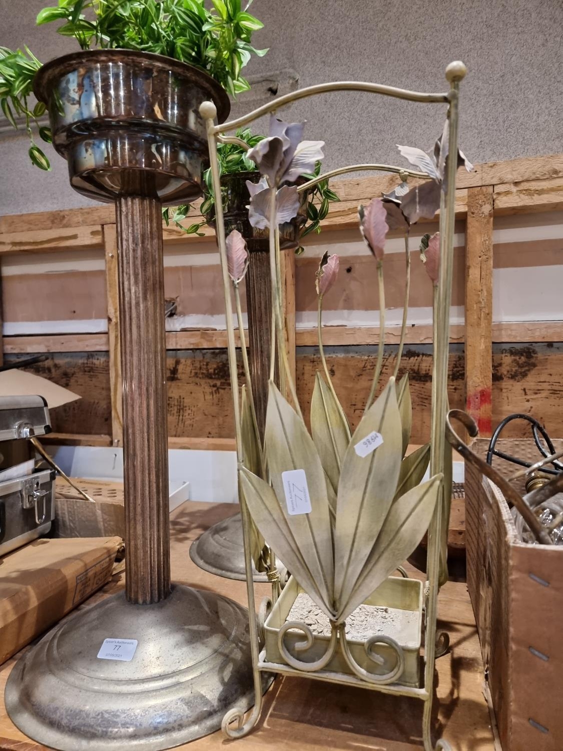 A pair of plated plant stands together with a floral umbrella stand, candlestick holders and glass table lamp.