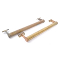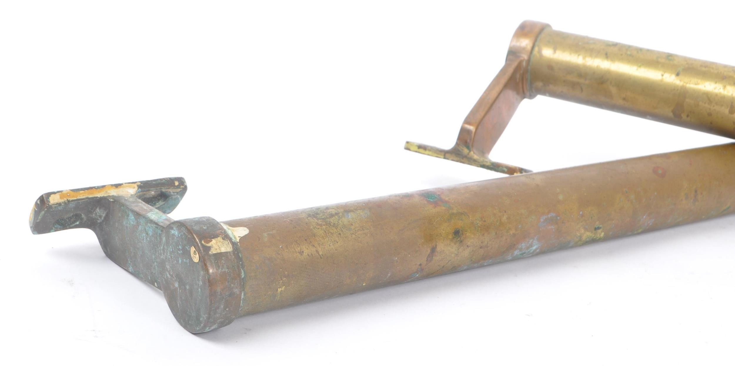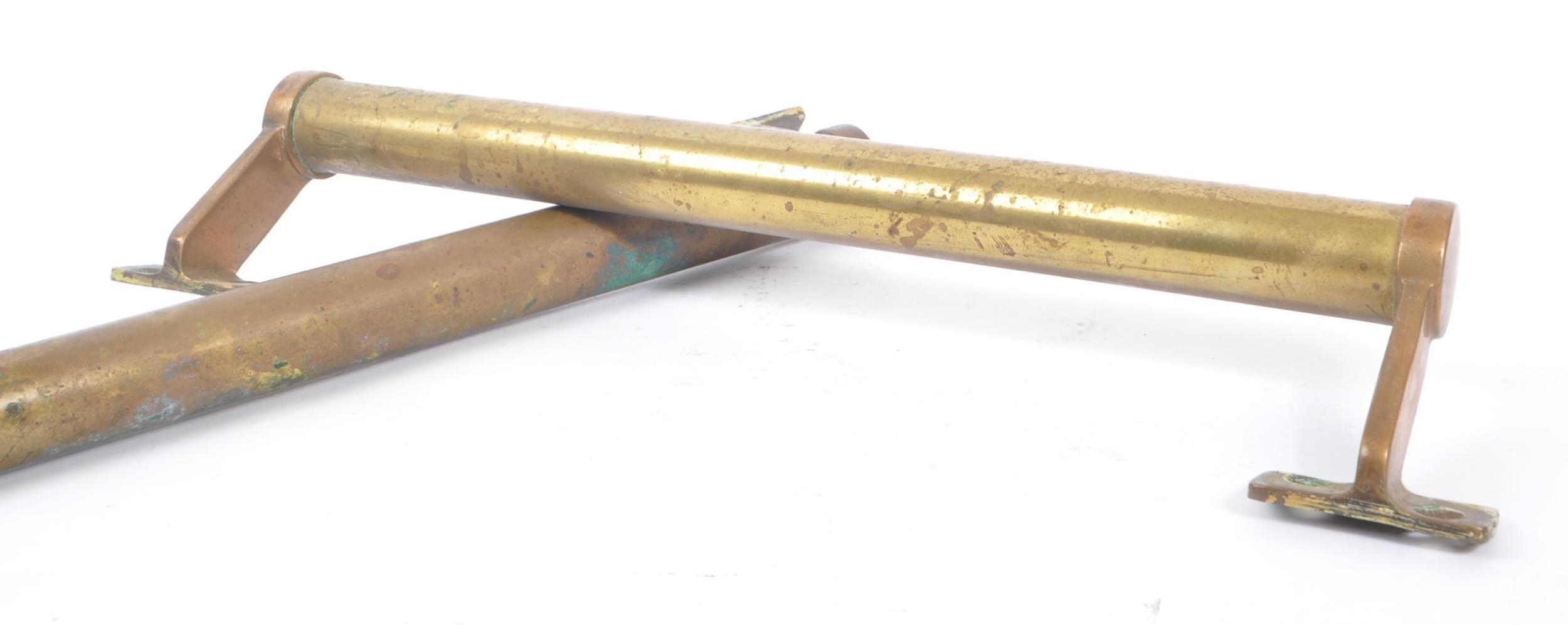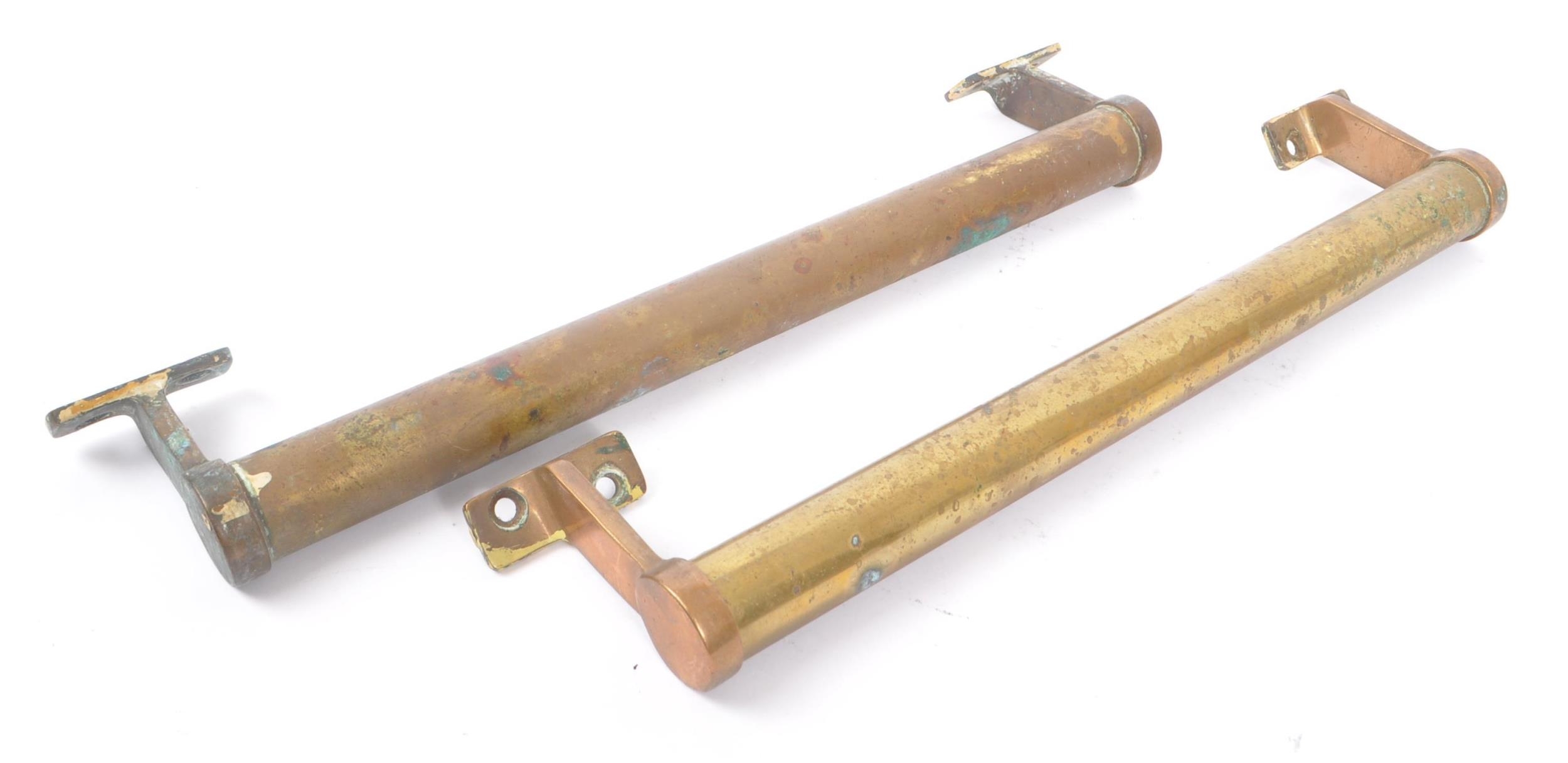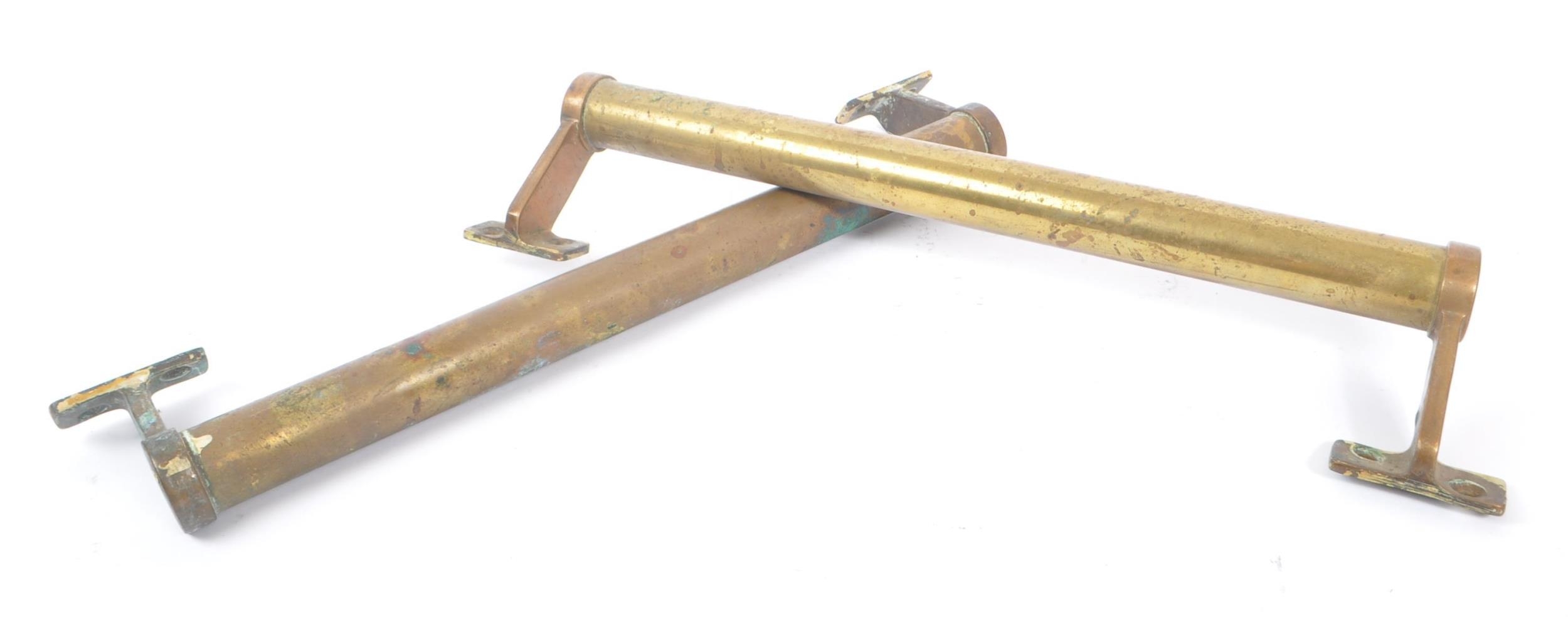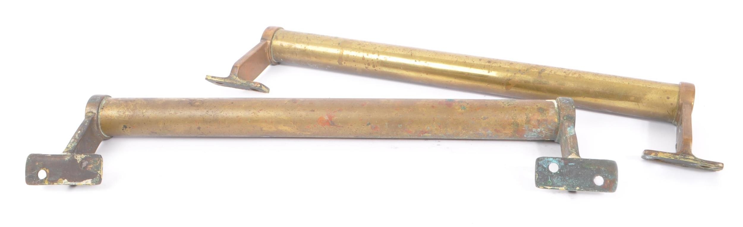 A pair of 19th century brass large door handles. Of circular / cylindrical form with fixings to end. Measures approx. 43cm long.