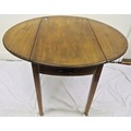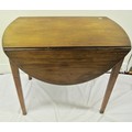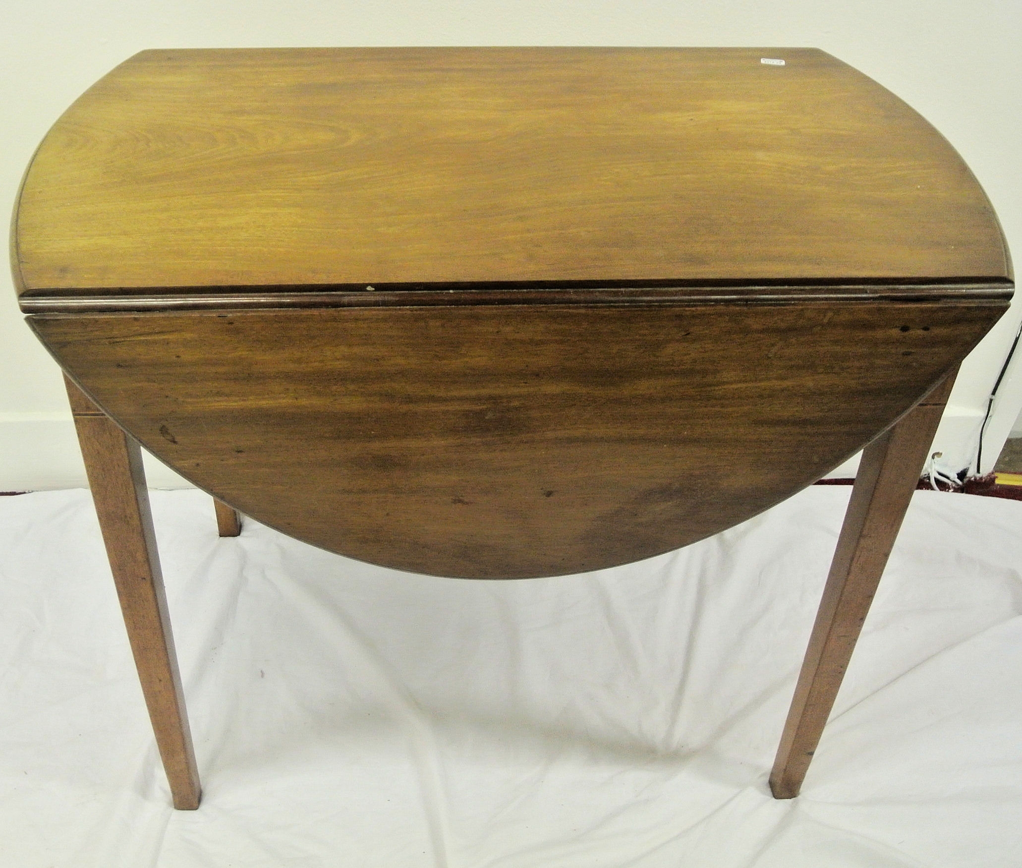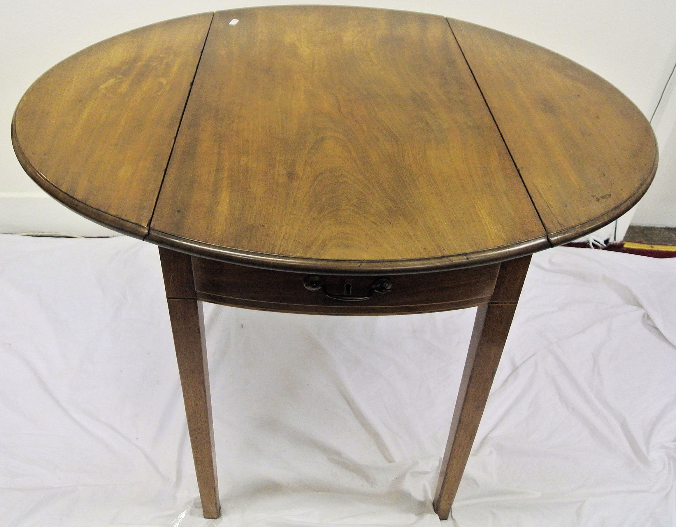 Edwardian mahogany pembroke table with D-shaped drop leaves, pull-out supports, bowed frieze drawer with brass drop handle, with string and ebony inlay, on square tapering legs