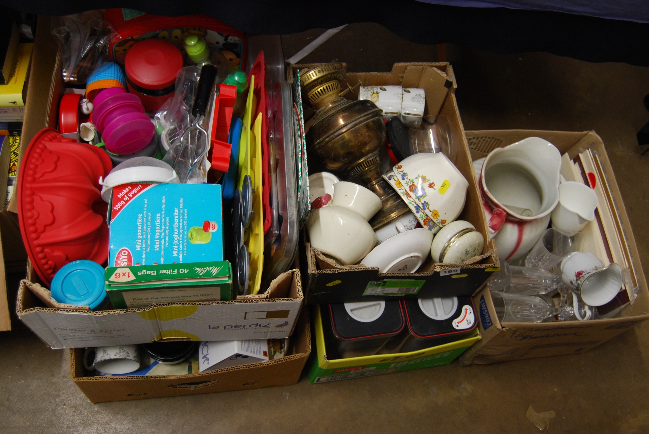 5 BOXES OF MISCELLANEOUS CHINA, GLASSWARE, KITCHEN EFFECTS, ETC