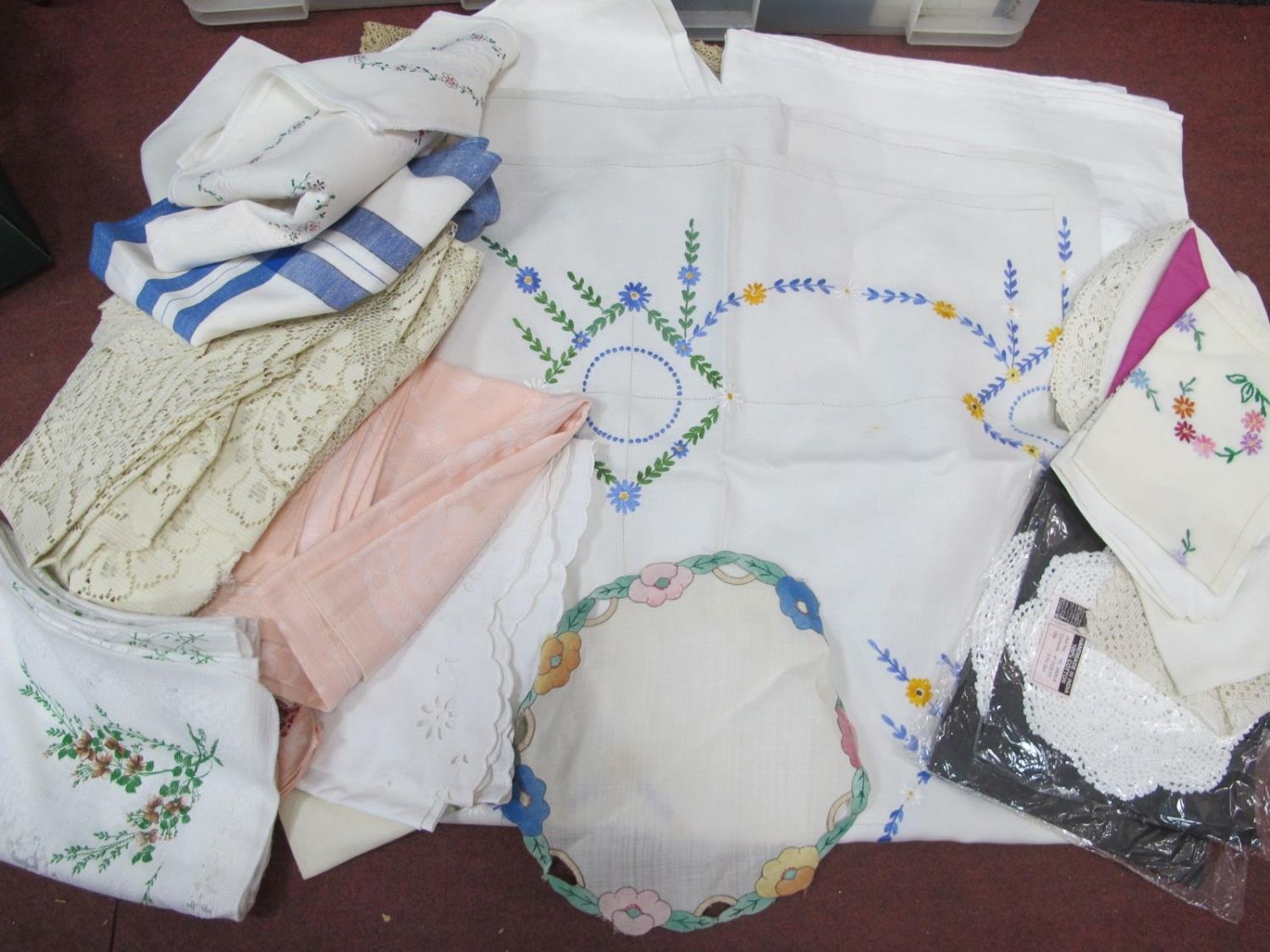 Crocheted, Embroidered and Damask Table Linen:- One Box.