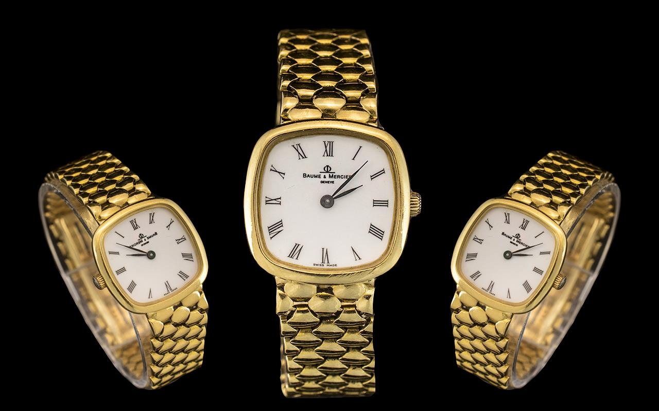 Baume Mercier Ladies 18ct Gold Bracelet Watch, hallmark for 18ct - 750. Features a concealed clasp, mesh bracelet and white porcelain dial. Number 18608-9 and 1731752. Total weight 42.6 grams, est. gold weight 35 grams. All aspects of condition as new. Working at time of Cataloging.