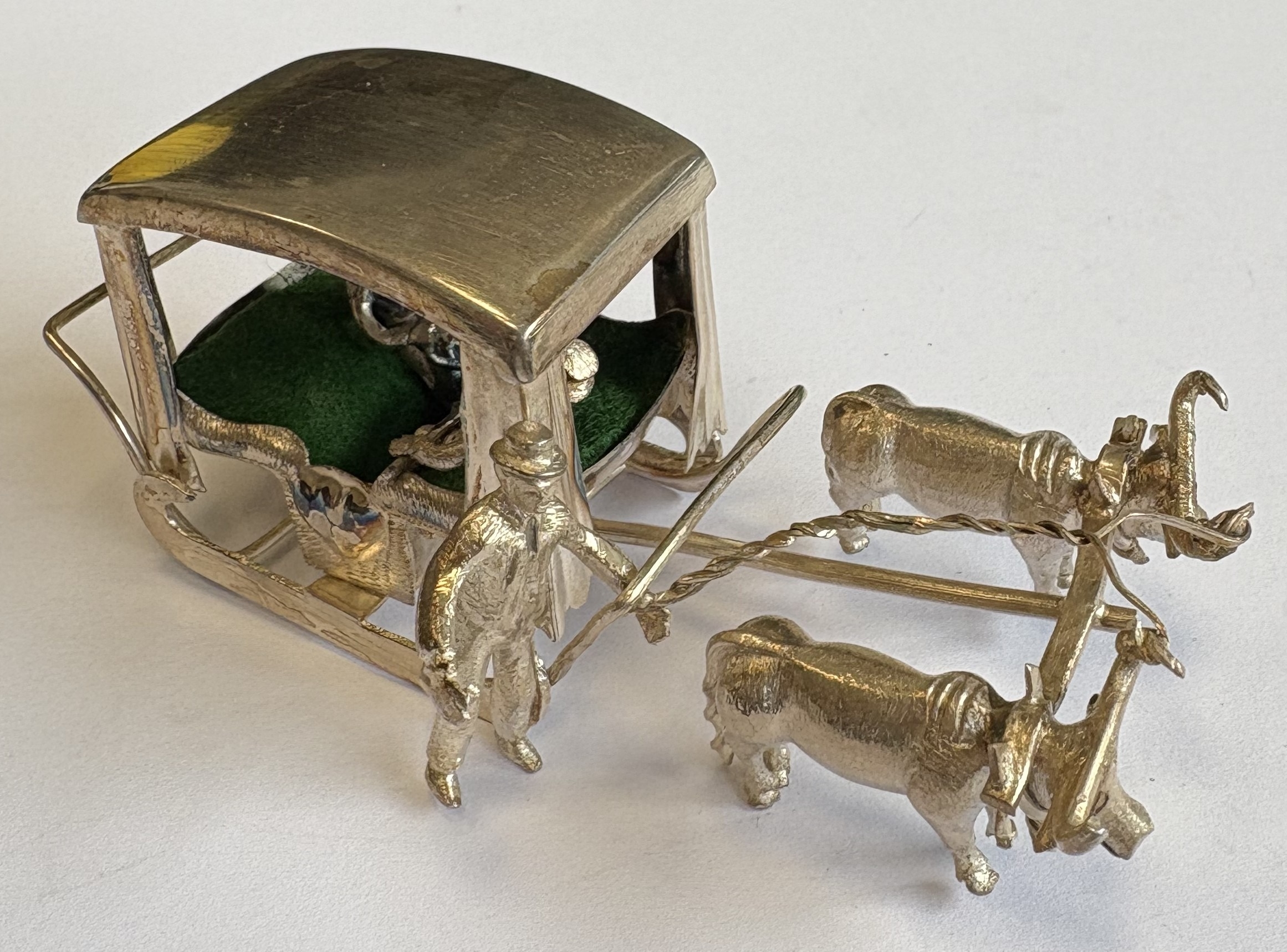 A heavy Continental silver table toy in the form of a bull ridden carriage. Approx. 60 grams. Est. £40 - £50.