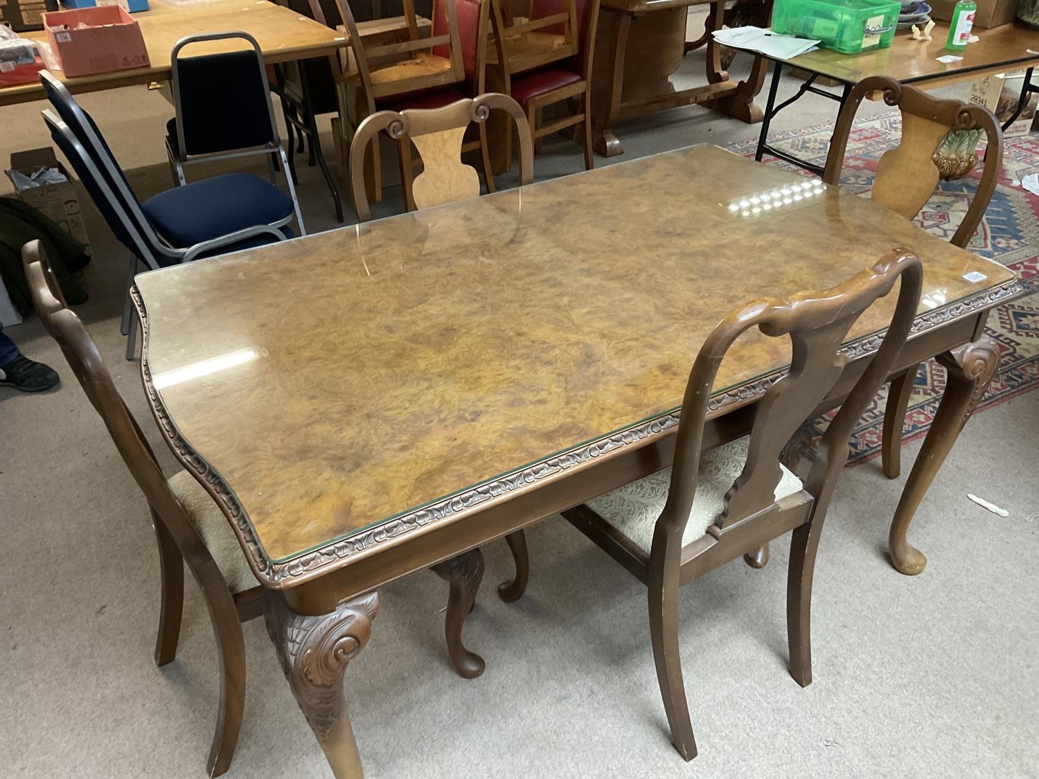 A 1920s butt walnut dining table with 4 matching dining chairs.