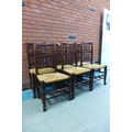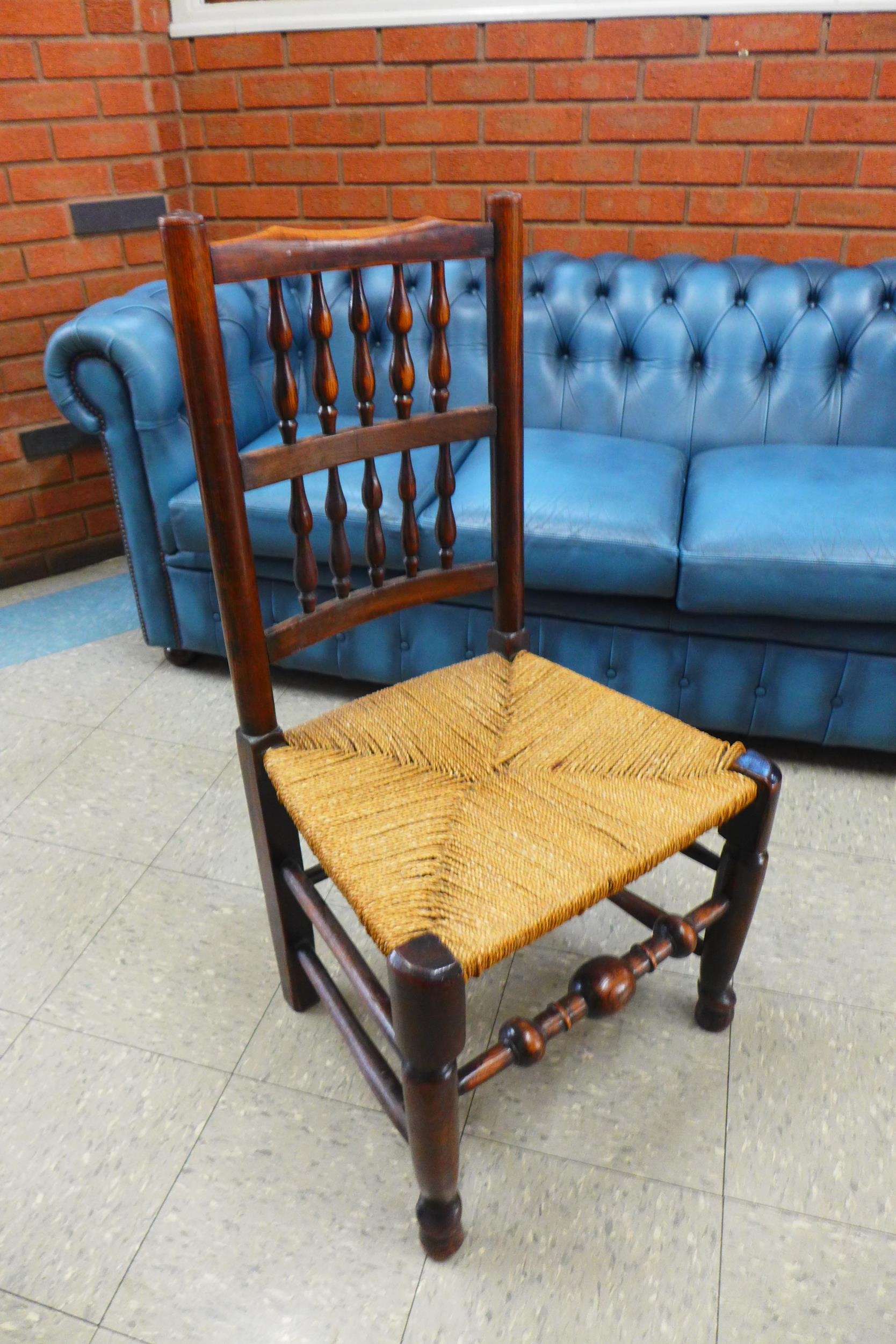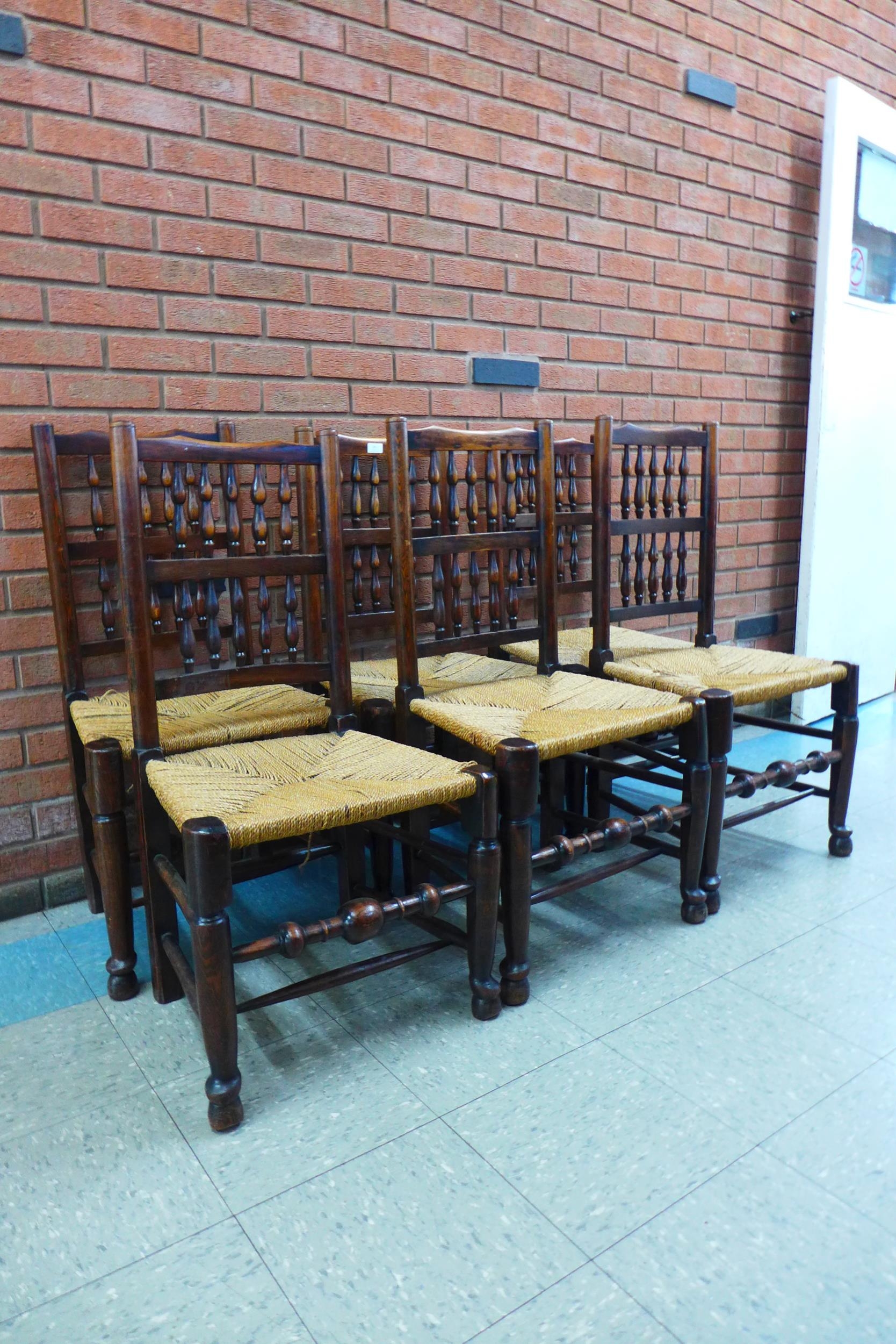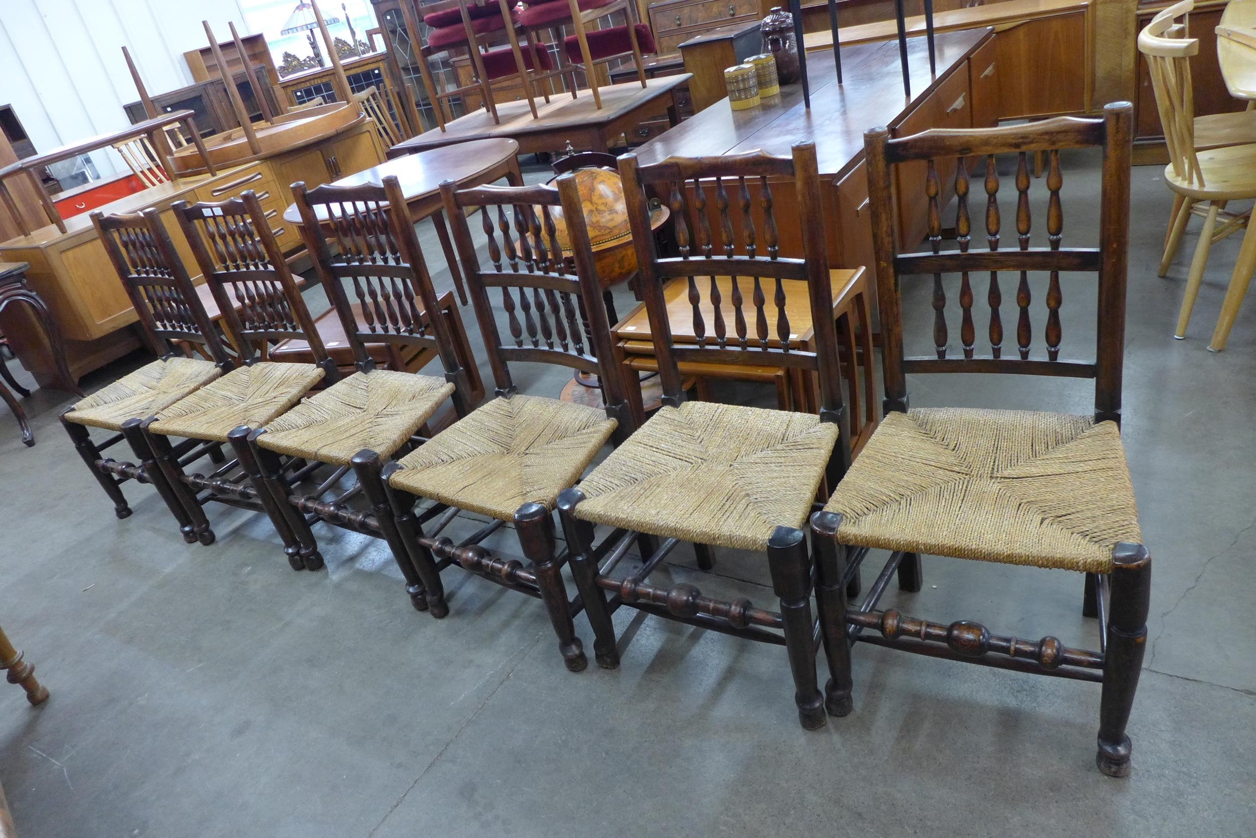 A set of six Georg III style elm and ash spindle back rush seated chairs