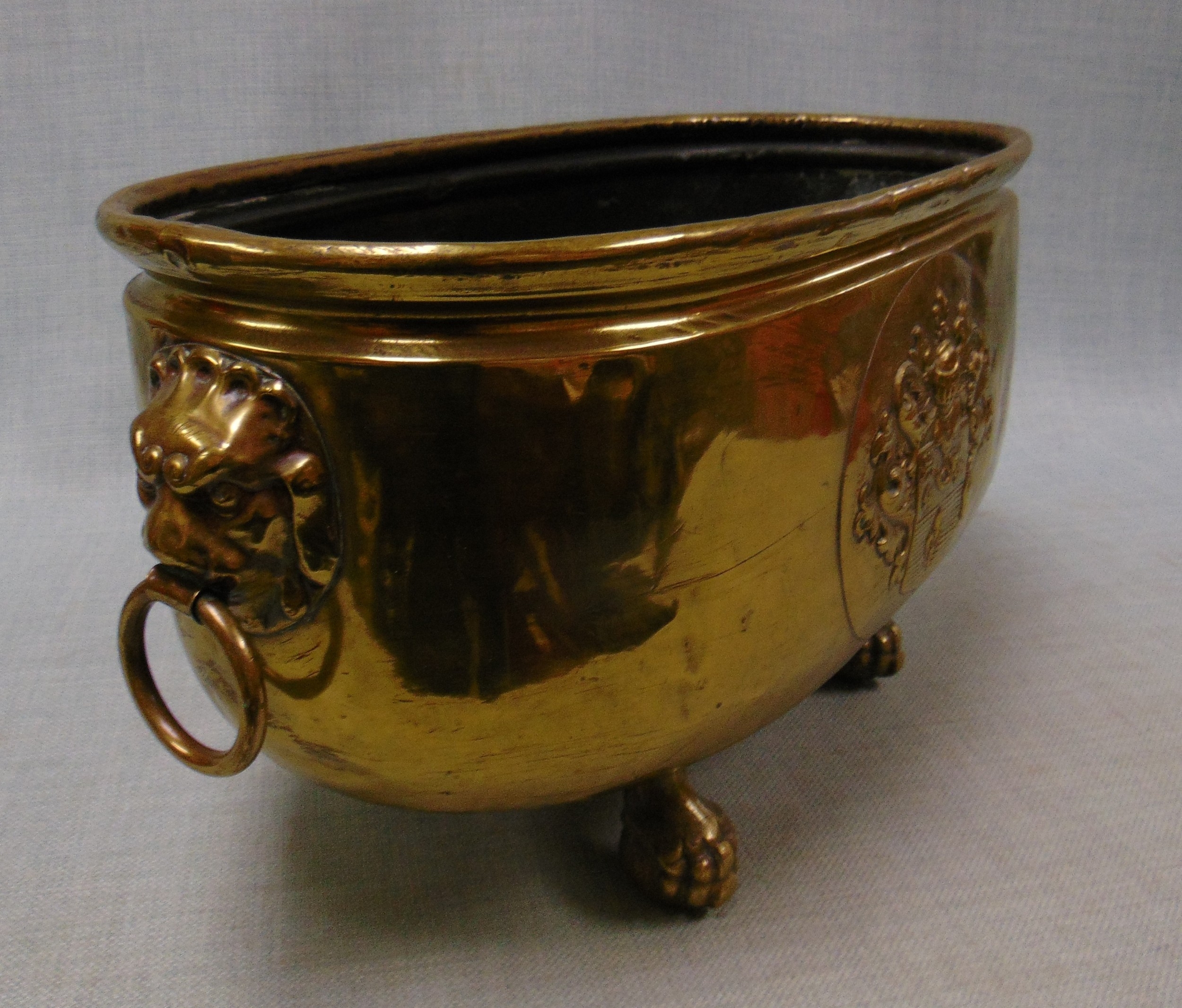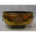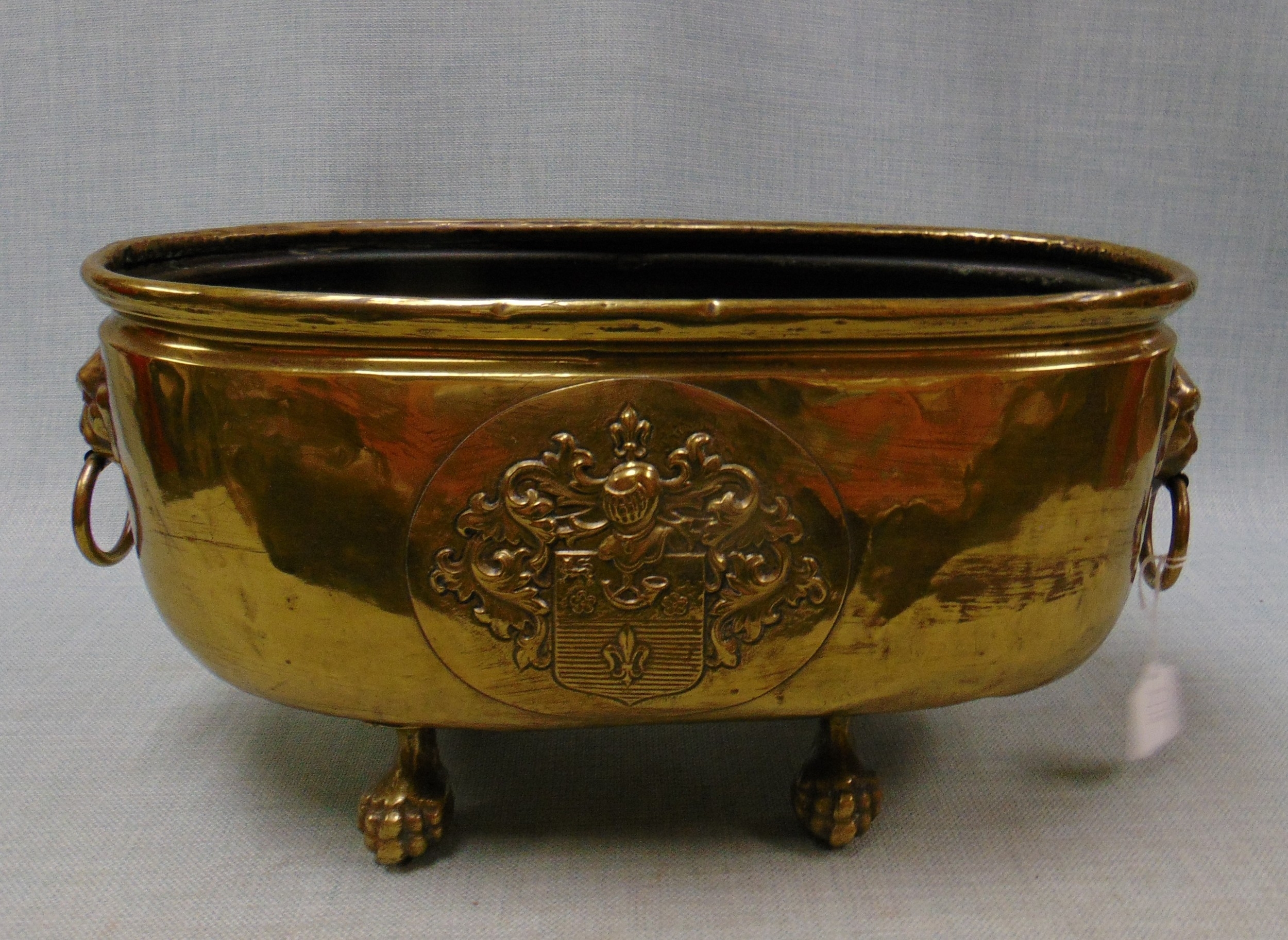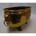 Brass oval from jardiniere, having lion mask handles.