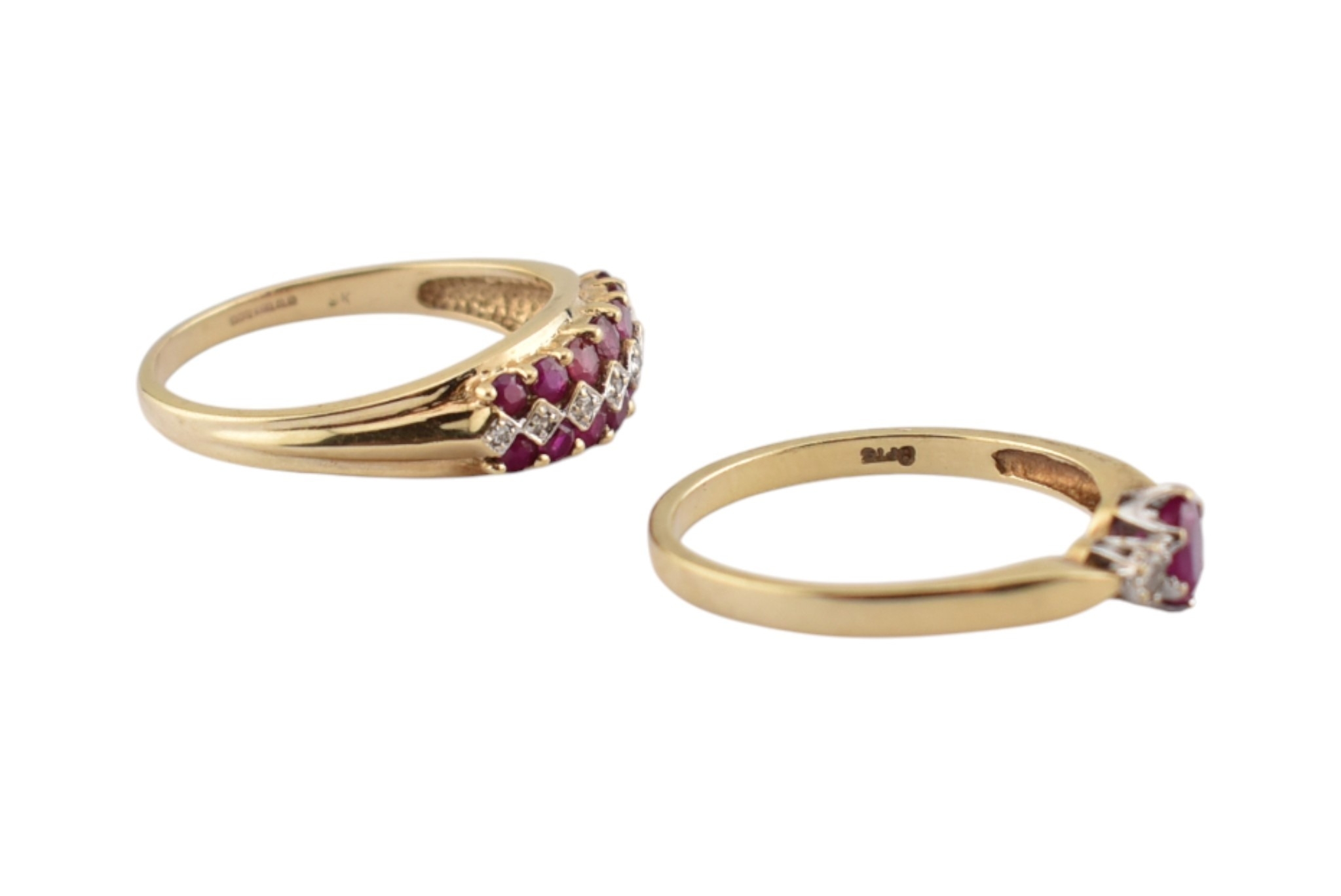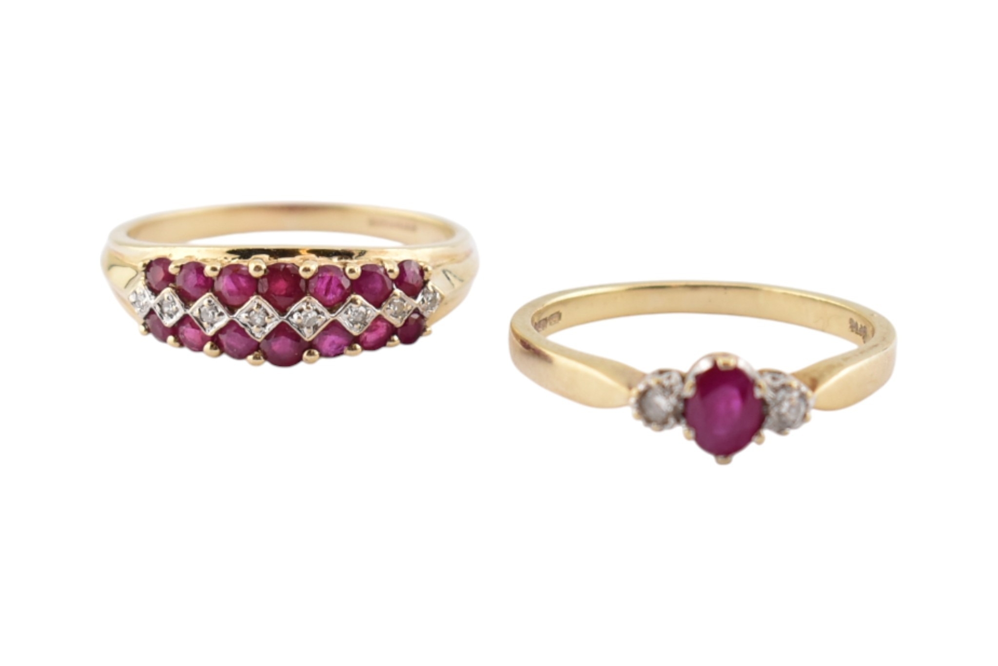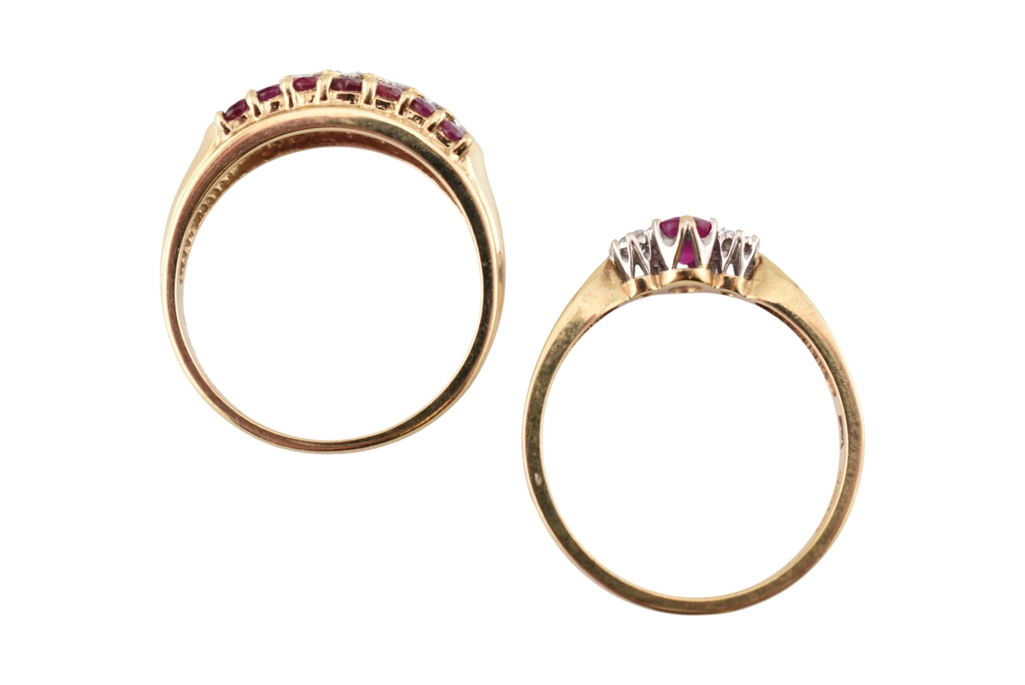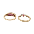 Two hallmarked 9ct gold ruby and diamond rings. Weight 5.6g. Both size T