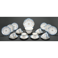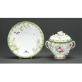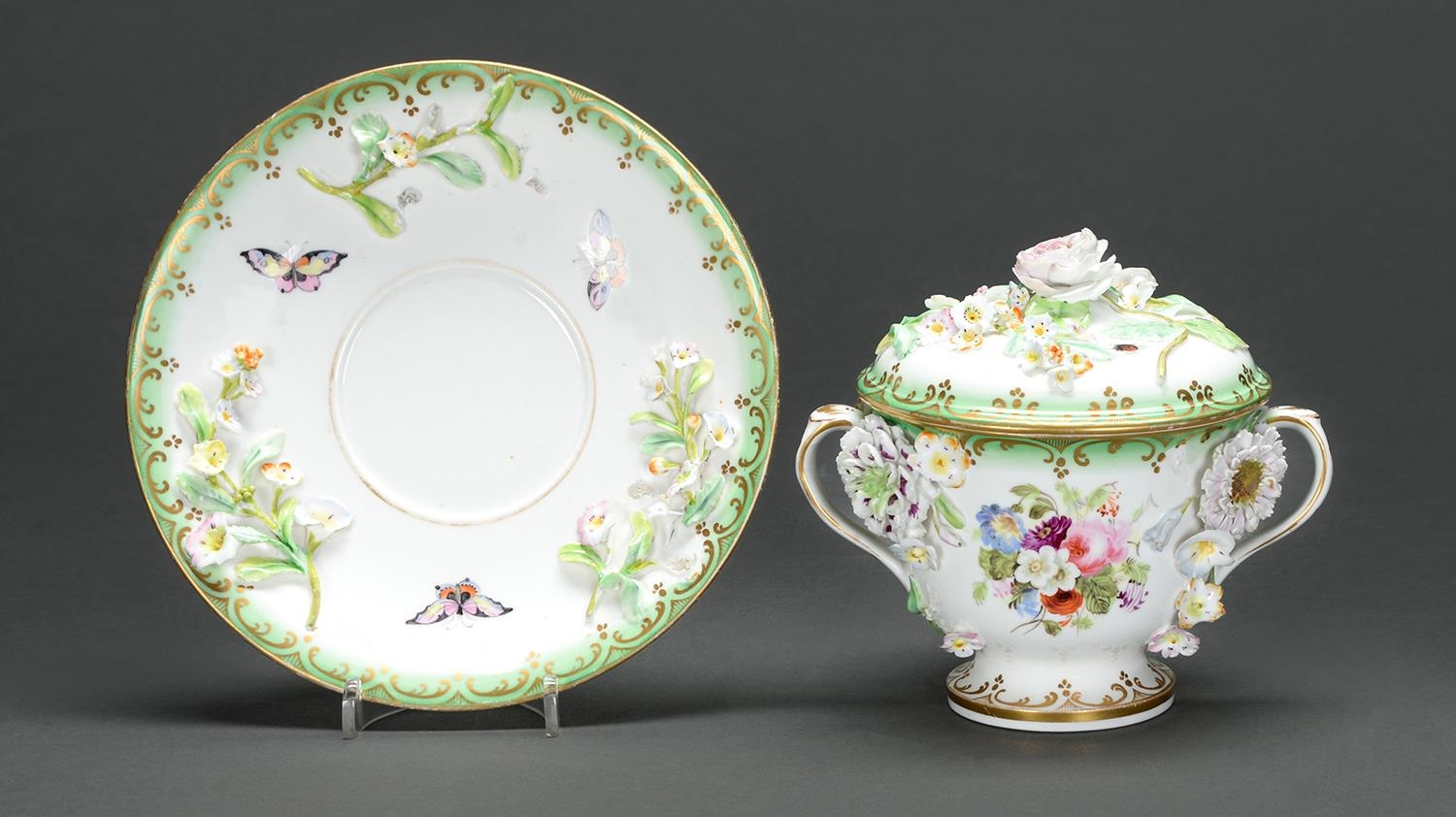 A Staffordshire floral encrusted two handed cup, cover and stand, c1840, painted with butterflies in shaded green and gilt border, stand 17cm diam,