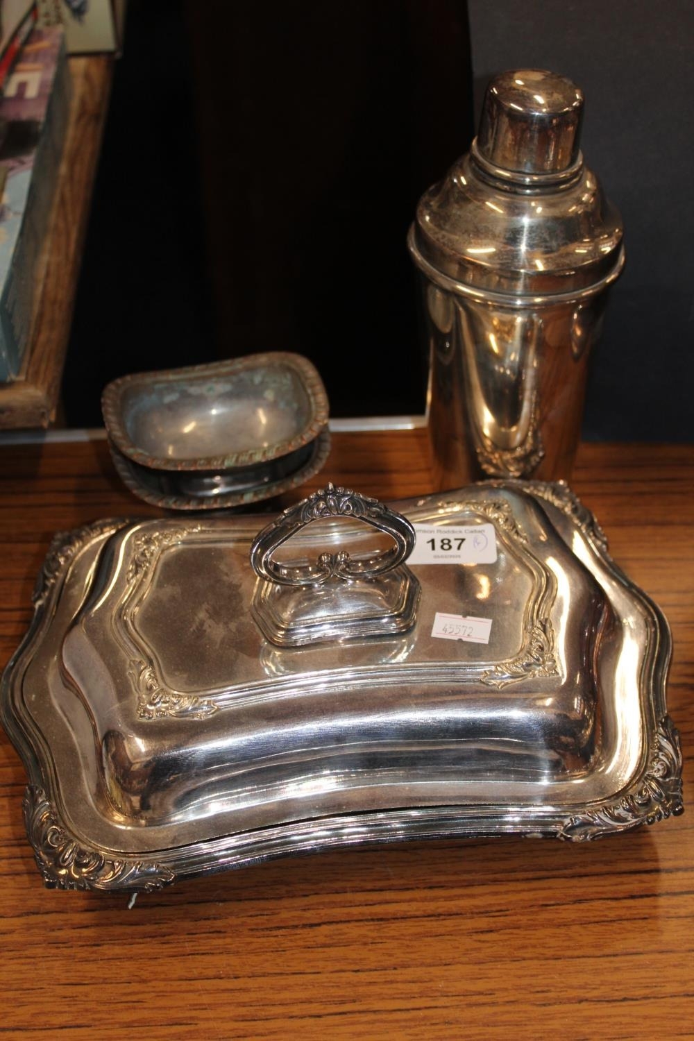 Silver-plated entrée dish and cover, a silver-plated cocktail shaker by P H V, and a pair of table salts.