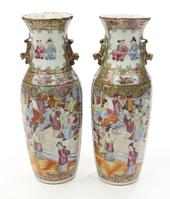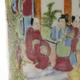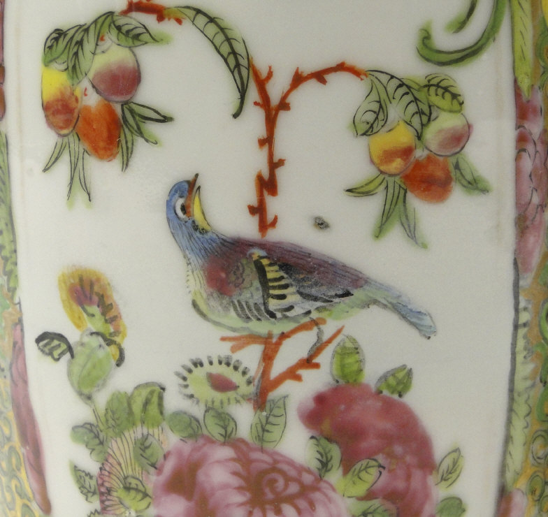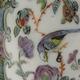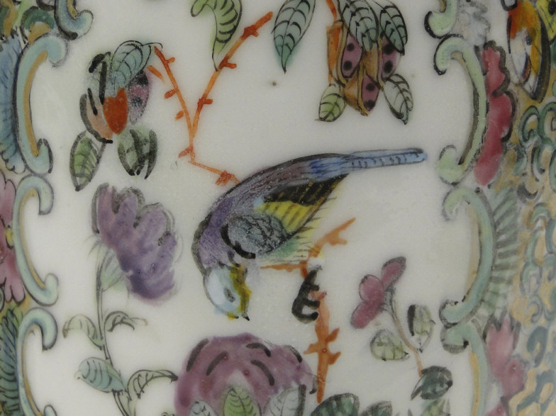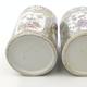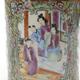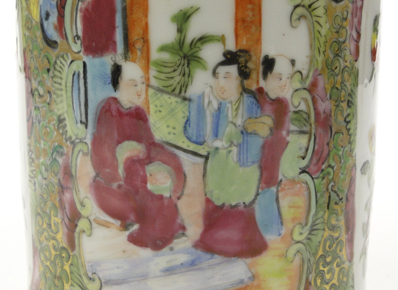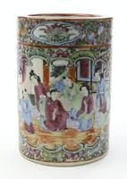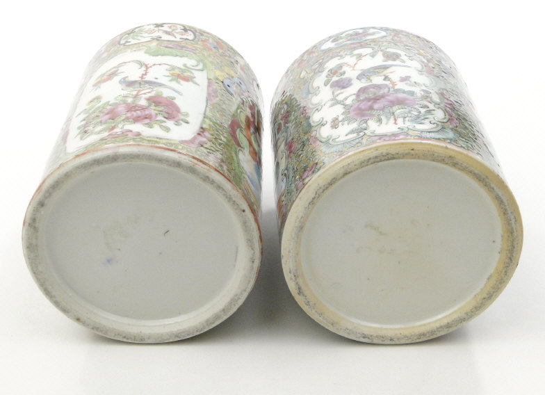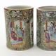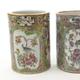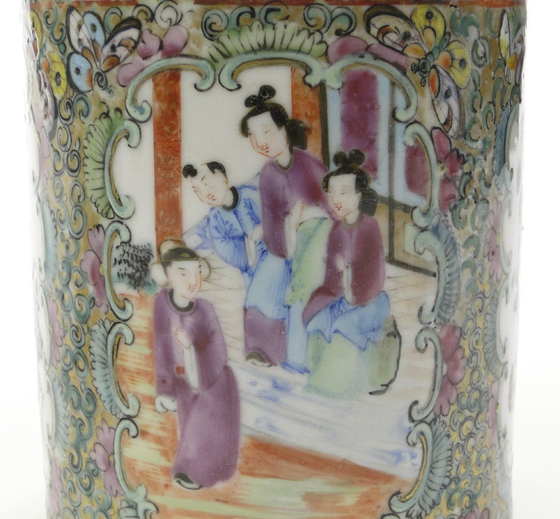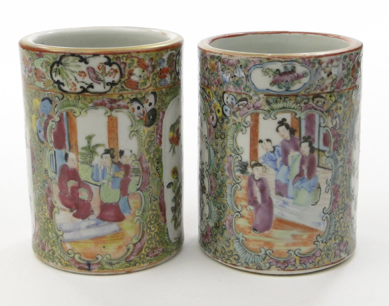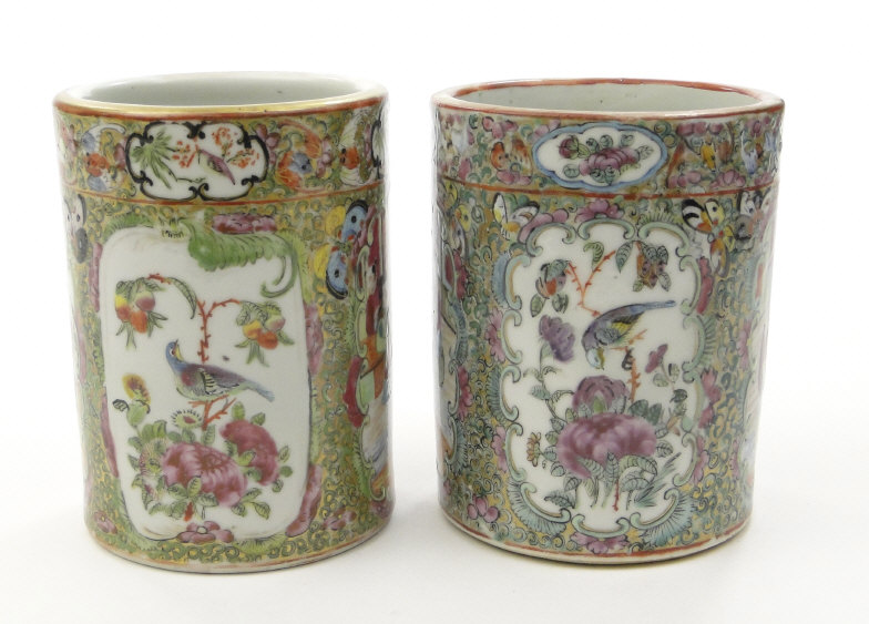 Two Cantonese porcelain brush pots, enamelled with panels of figures, butterflies and birds onto a floral ground, 13cm high