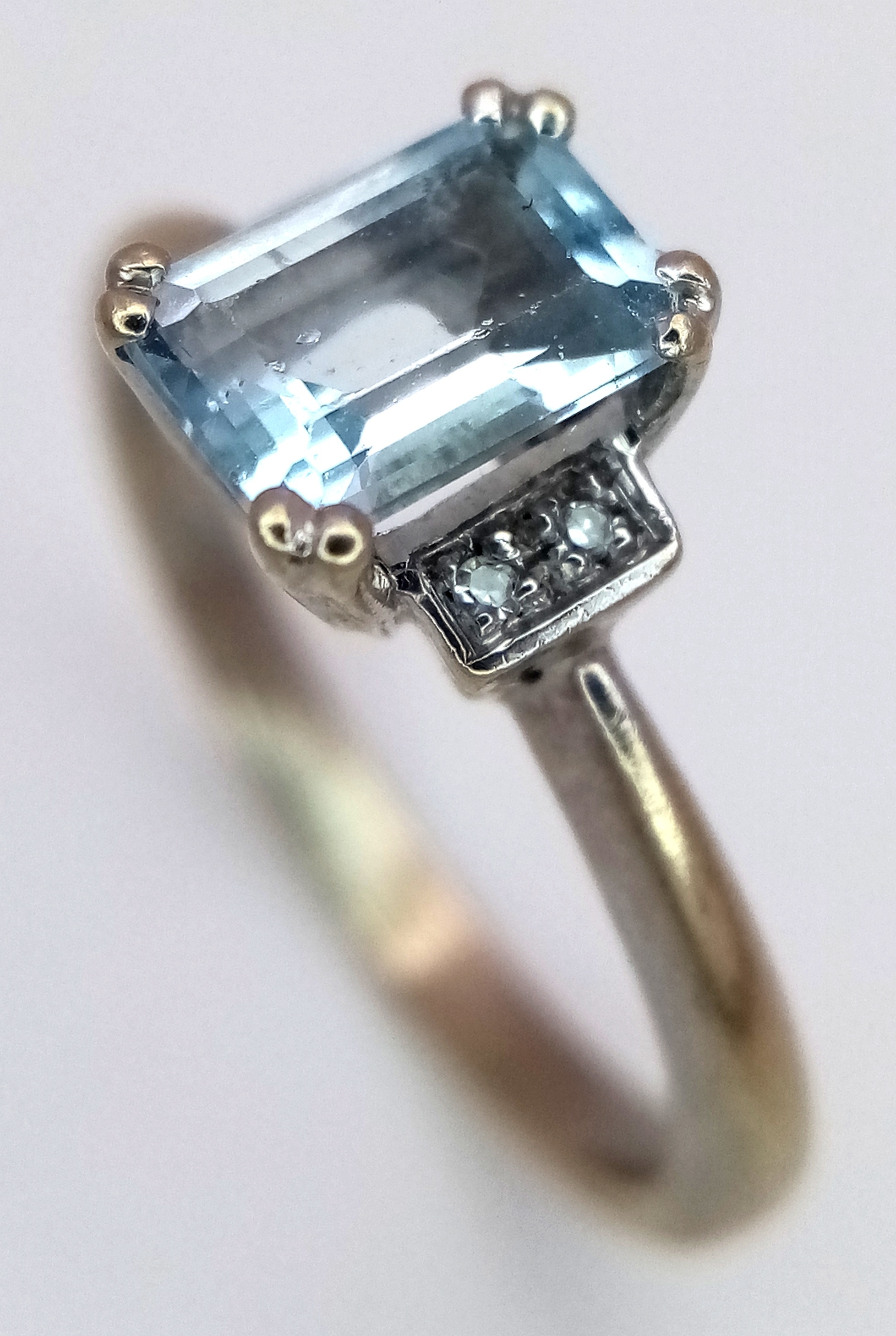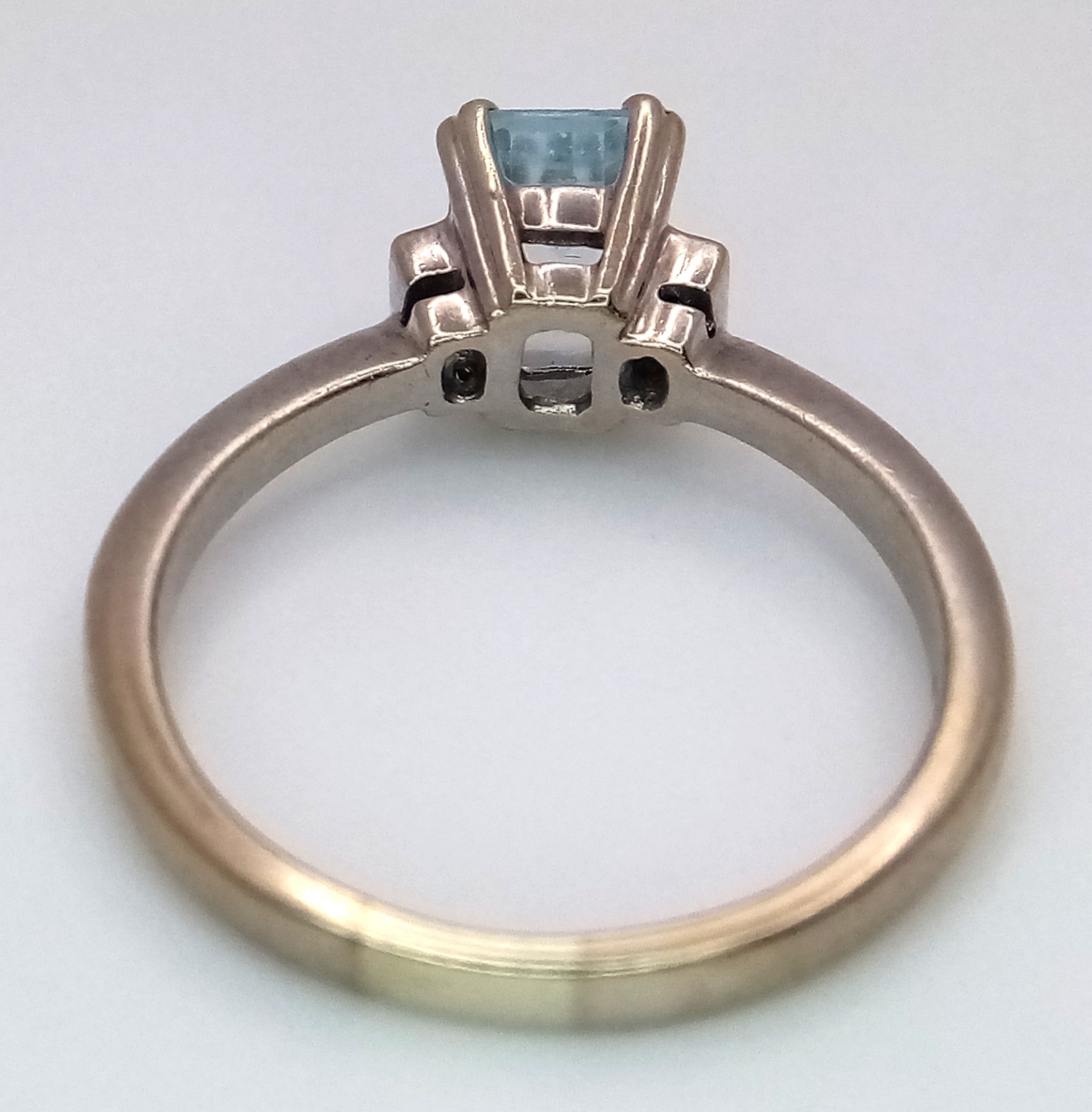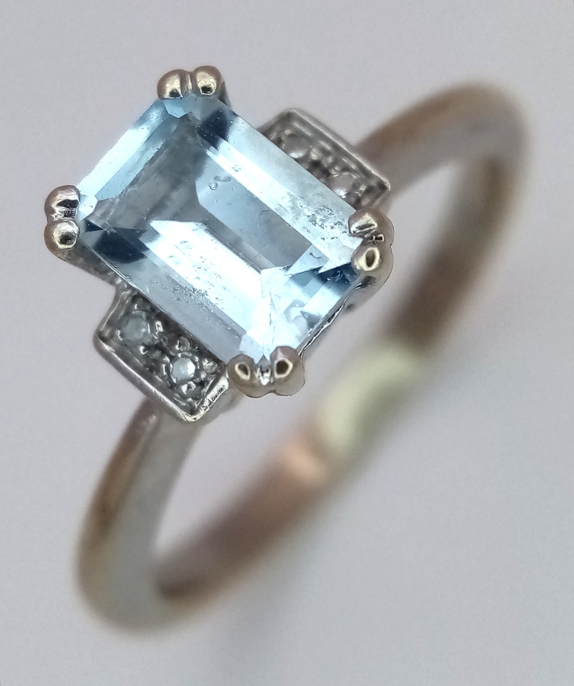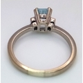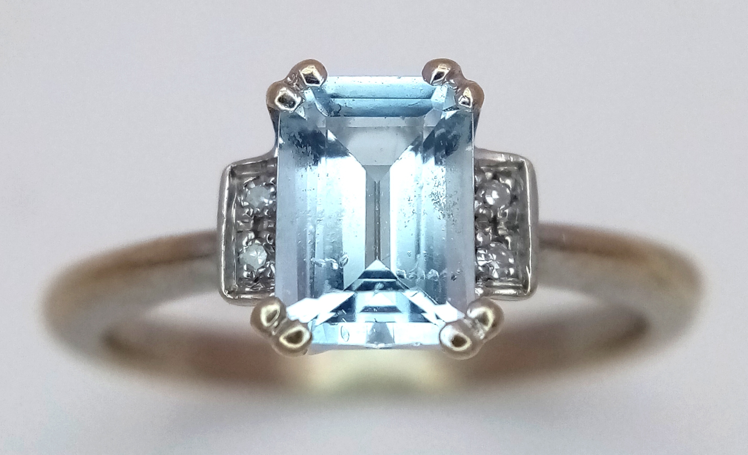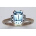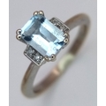 A 9K Yellow Gold Emerald Cut Blue Topaz and Diamond Ring. 1ct centre stone with diamond accents. Size M. 2.7g total weight.