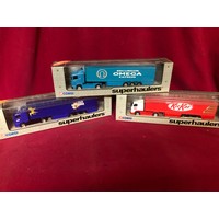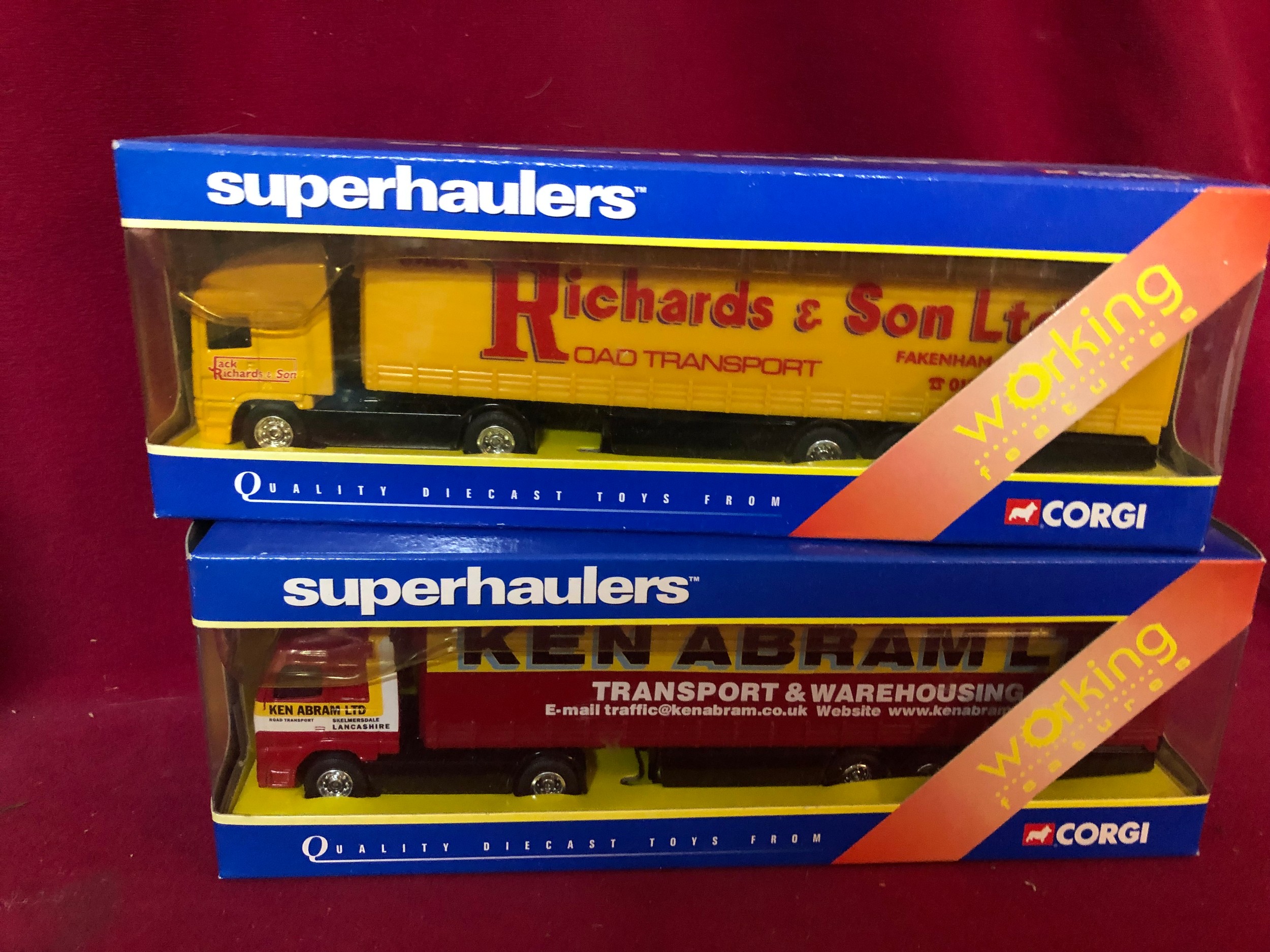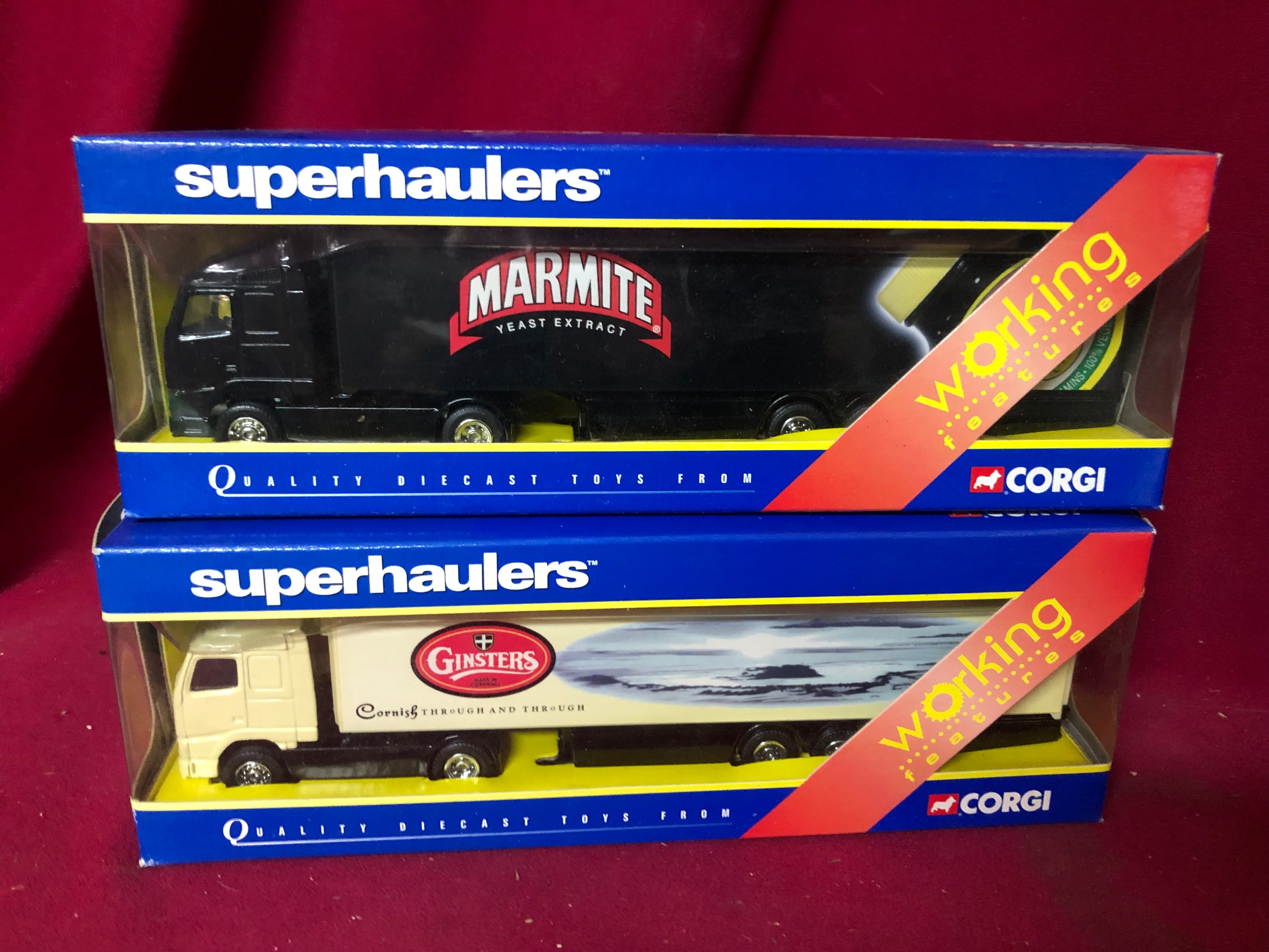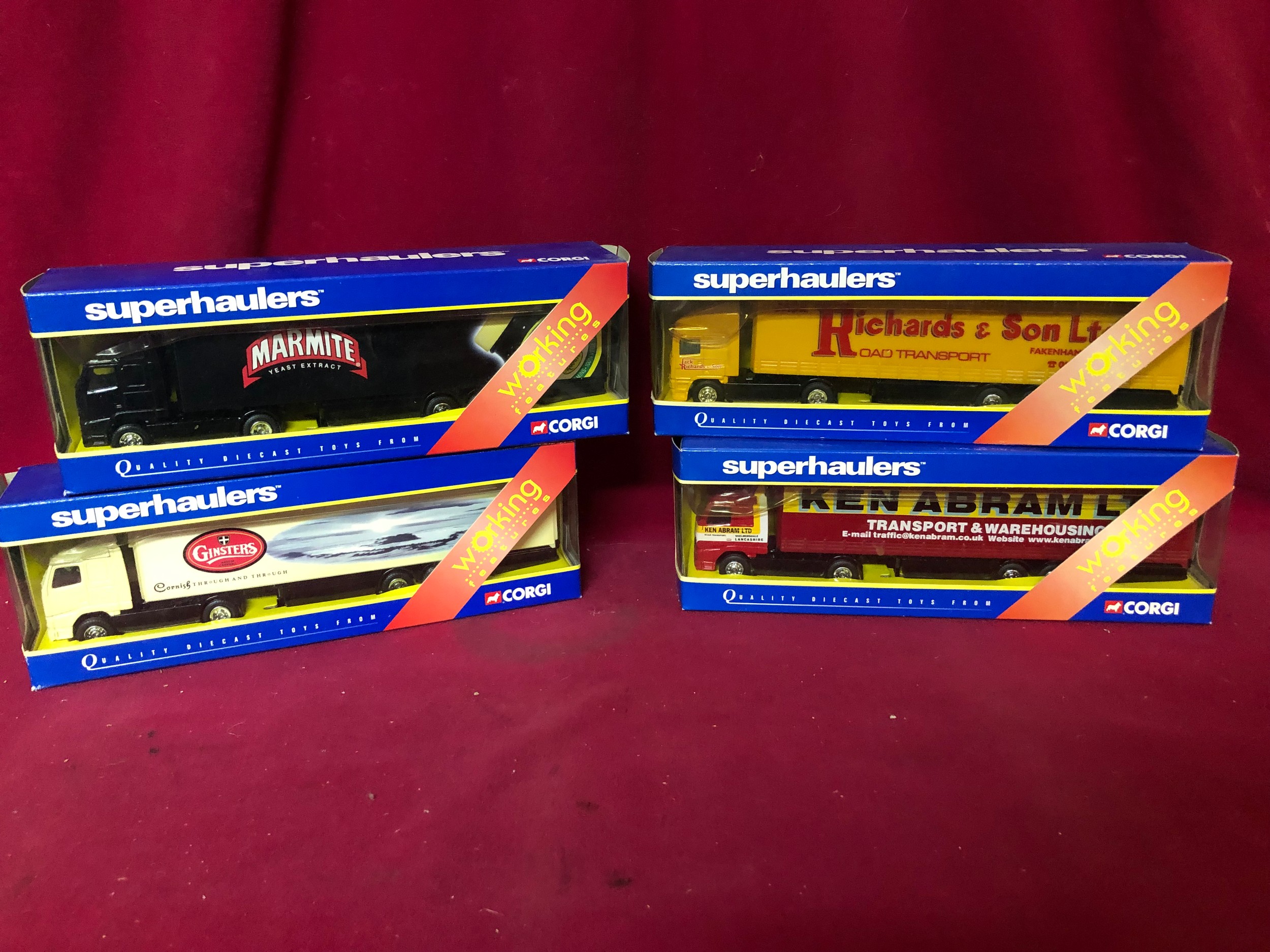 Selection of 4 Corgi superhauliers. A TY85717 Volvo box trailer - Ginsters, a TY86710 Volvo curtainsider - Ken Abrams, a TY86716 Volvo curtinaside - Marmite and a TY86803 ERF curtainside - Jack Richards and Sons