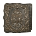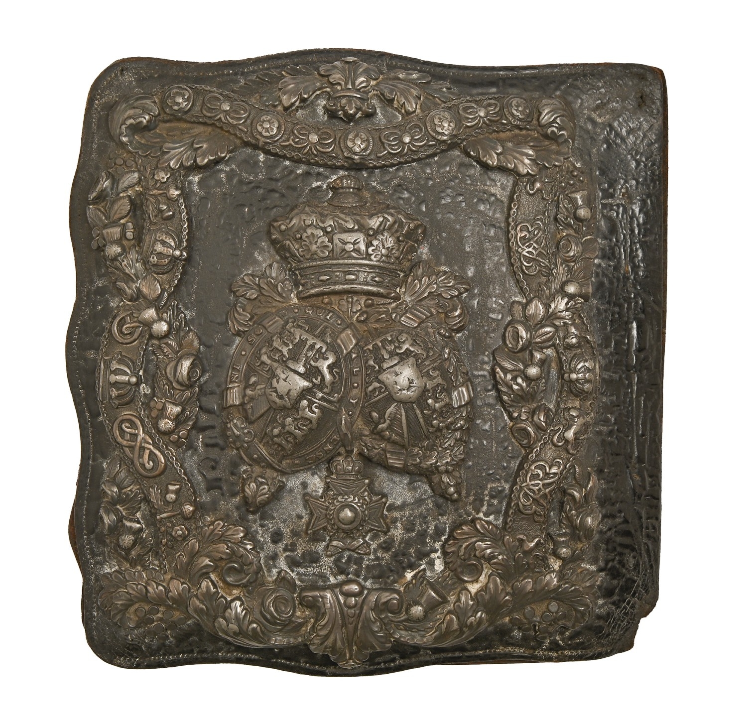 Royalty. A royal silver mounted black leather carriage horse harness blinder, with central high relief silver applique of the royal arms of George Prince Regent of England and Scotland accollée, the entwined border of ribbon with GR mirror cipher alternating with crown and intertwined with the emblematic foliage of the United Kingdom, all finely chased, 18 x 18cm