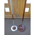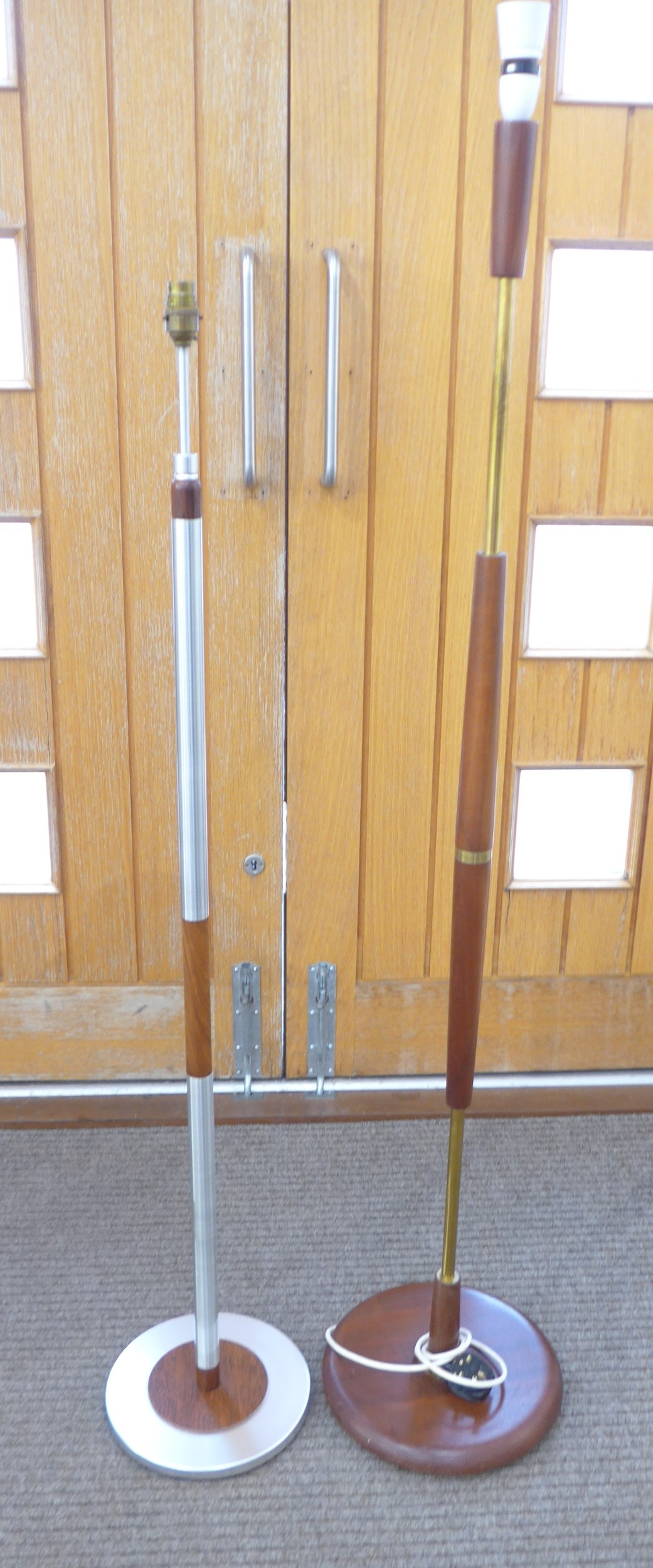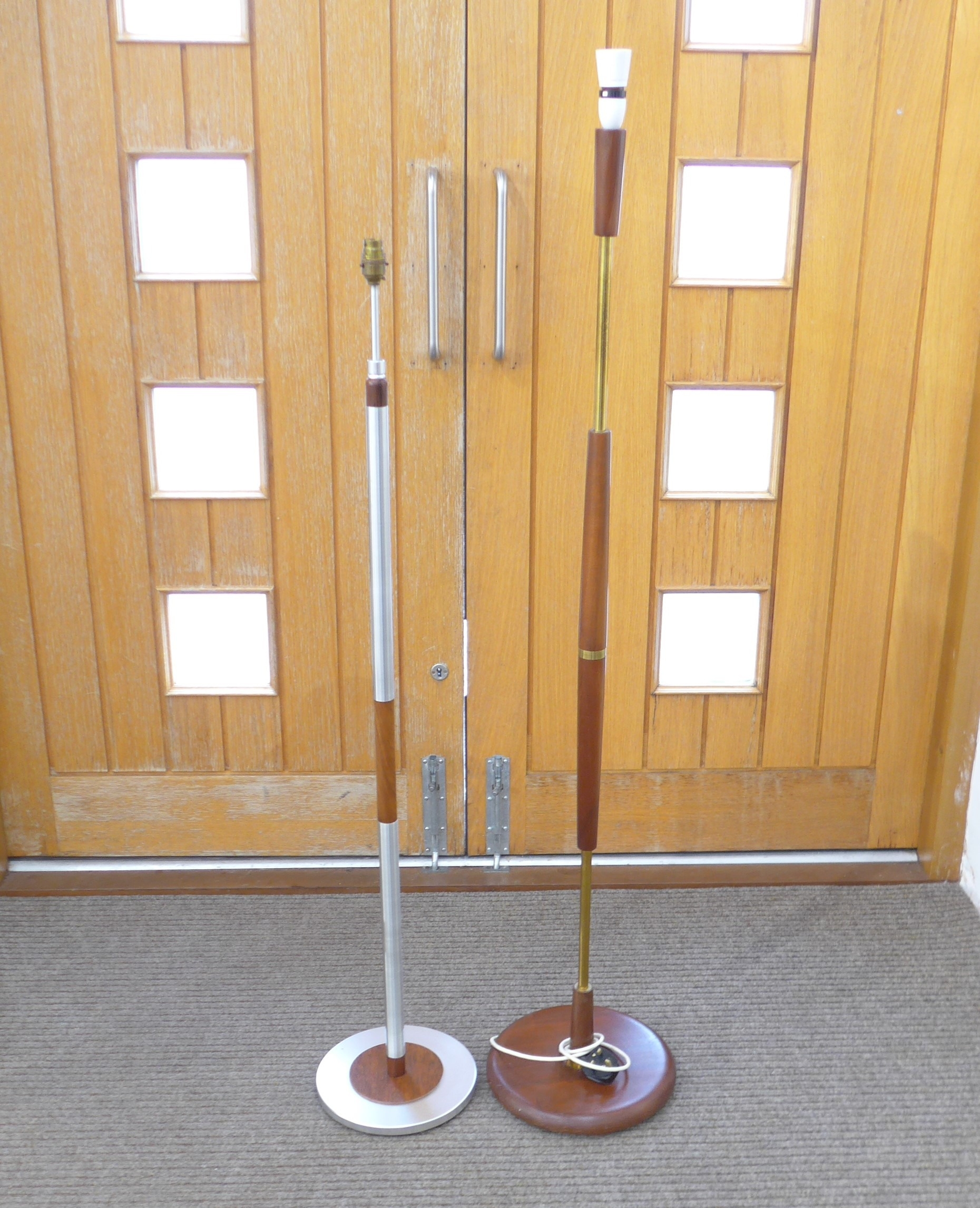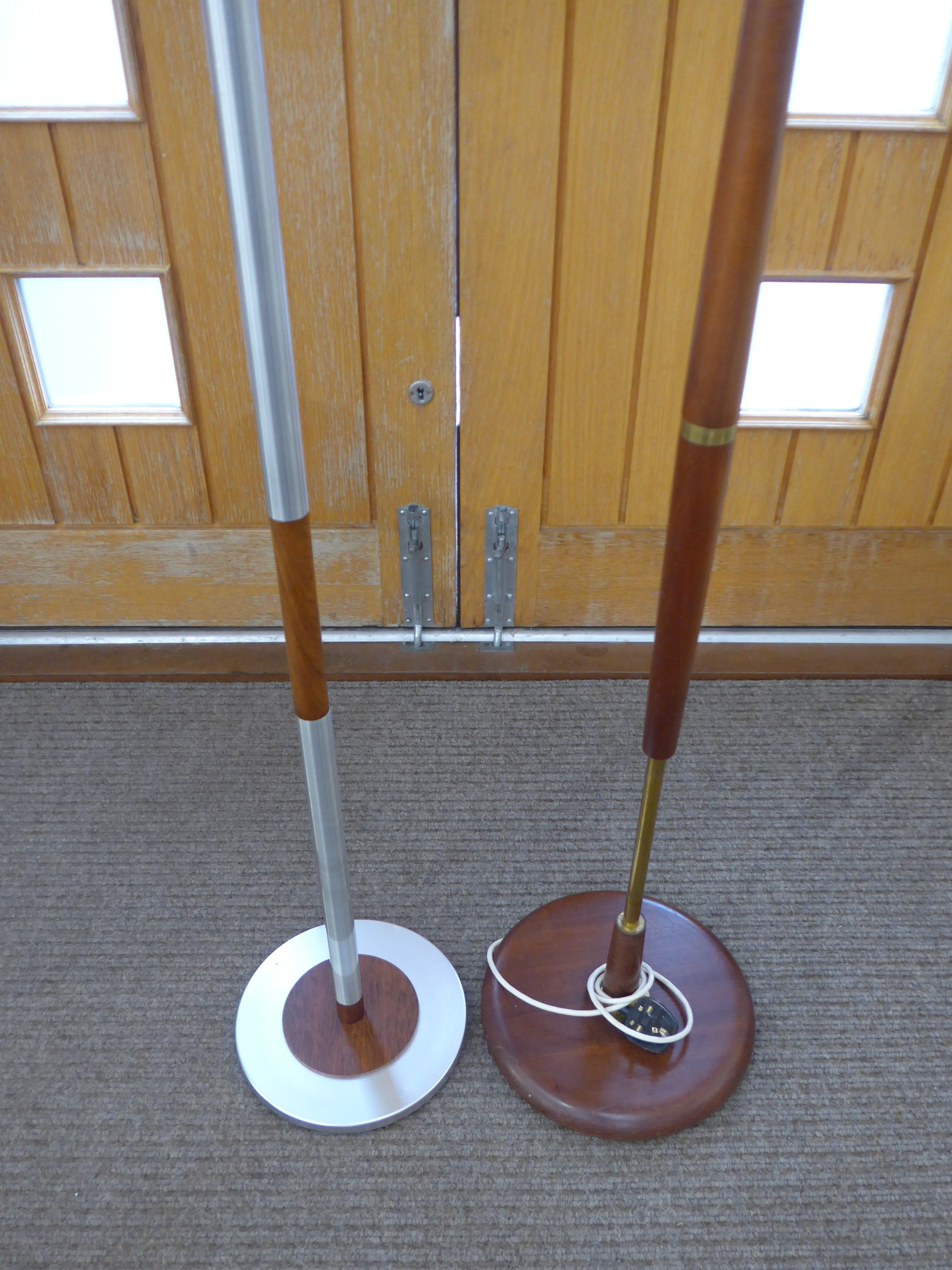 Two teak standard lamps, one teak/brass, one Danish teak/aluminium. Tallest 149.5cm