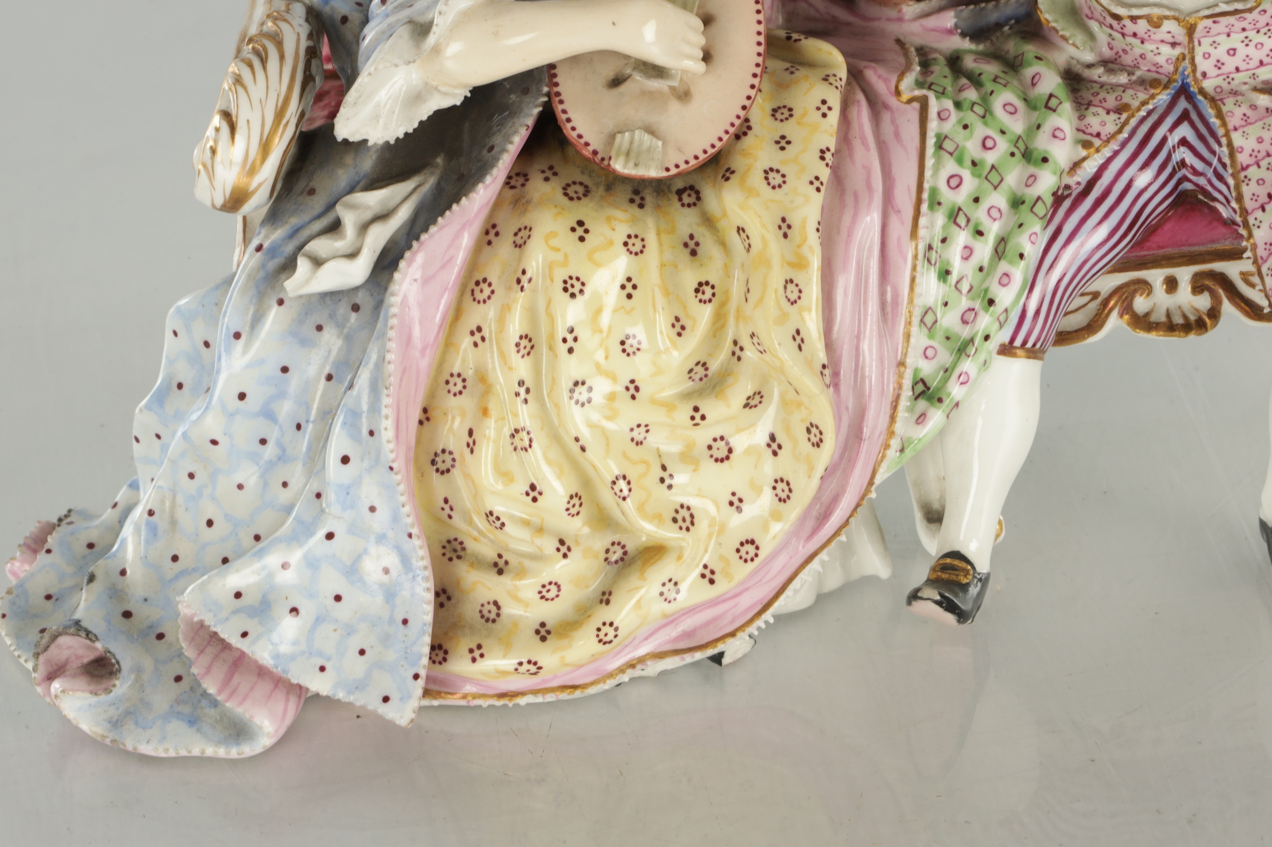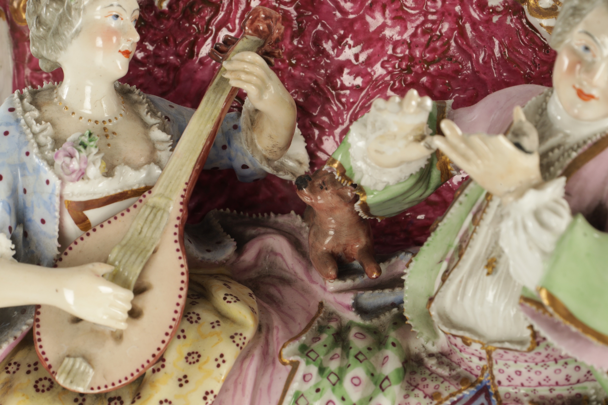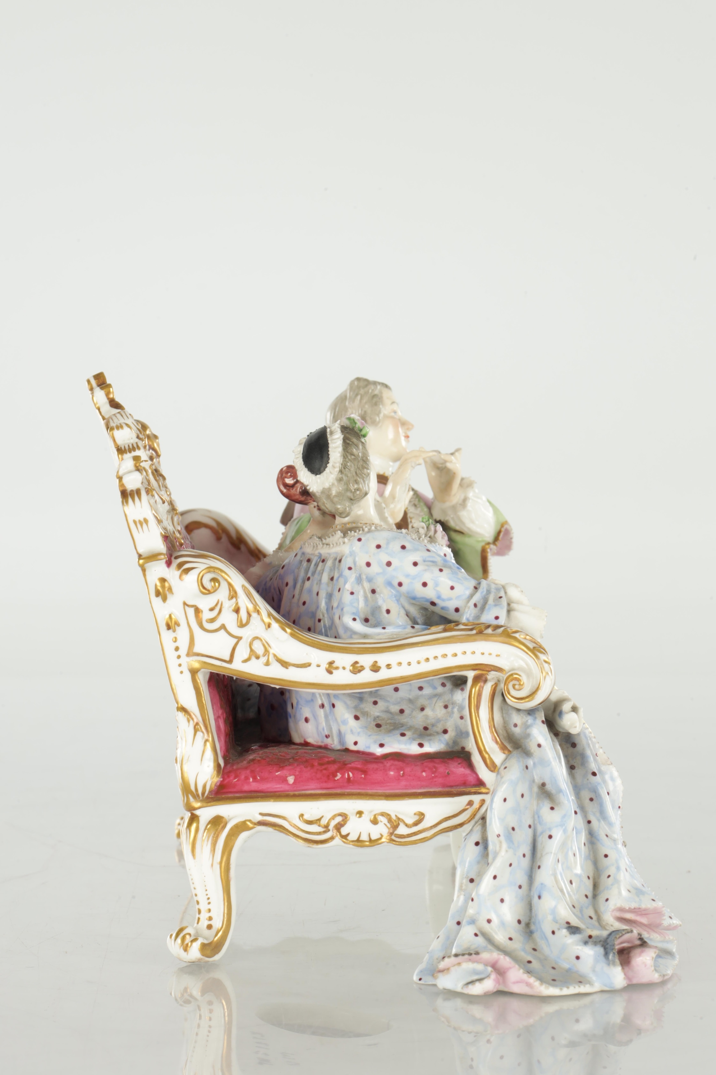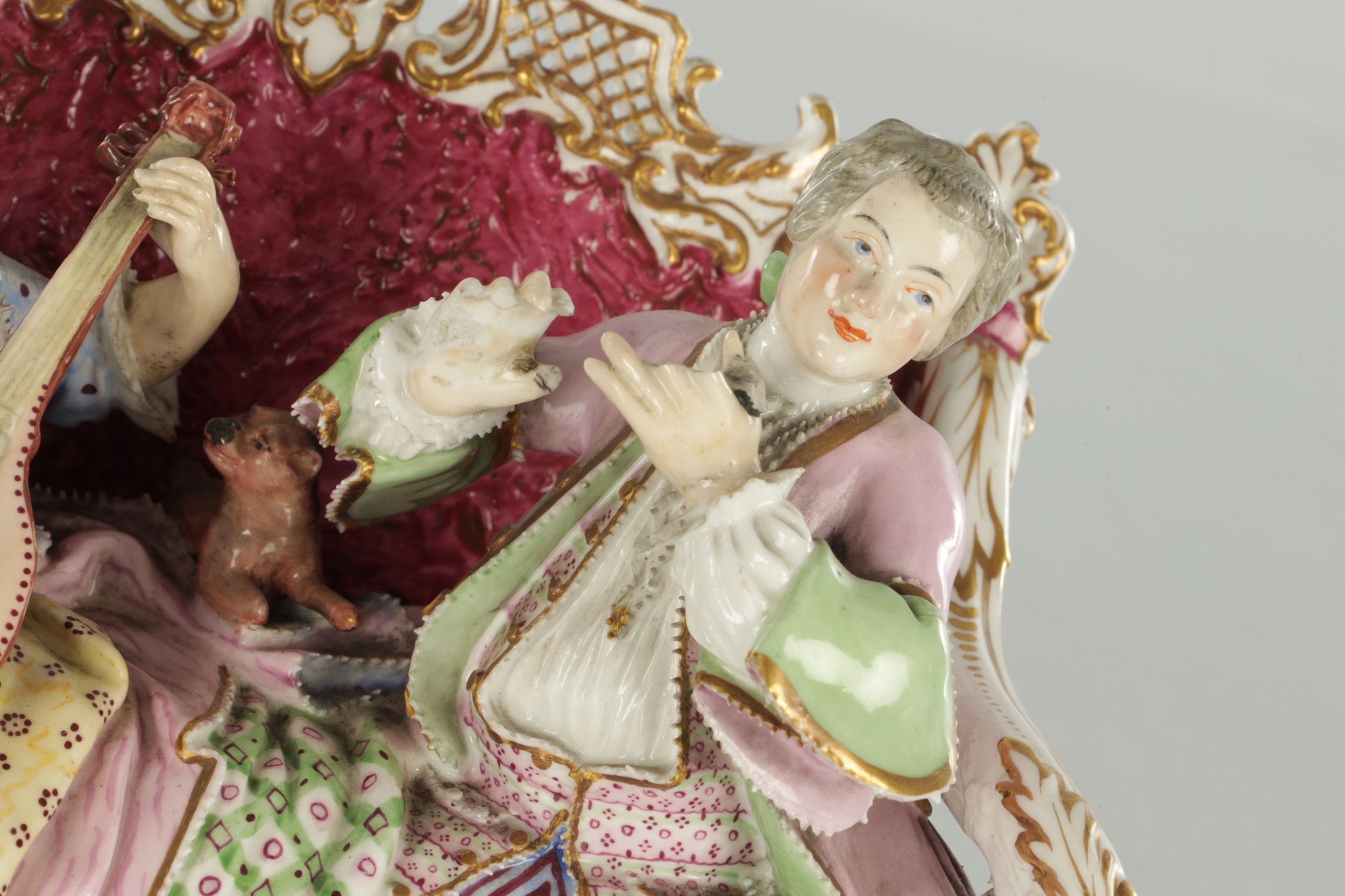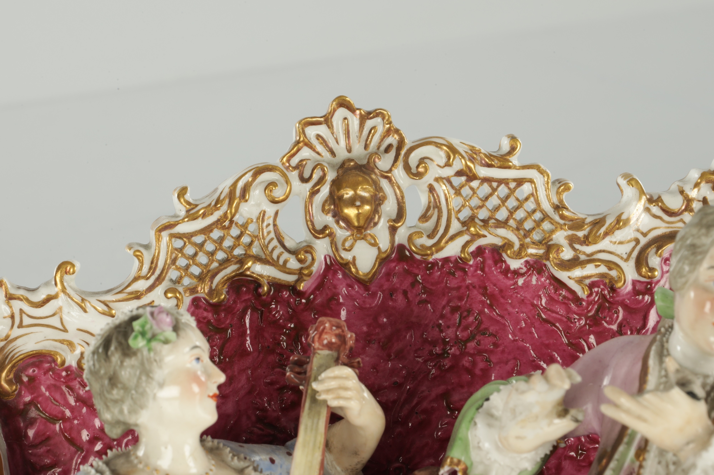 A LARGE LATE 19TH CENTURY MEISSEN-STYLE DRESDEN FIGURE GROUP OF MUSICIANS depicting a lady and gentleman seated on a French Rococo style settee dressed in elaborate coloured costume - indistinct mark beneath