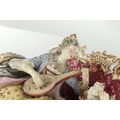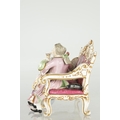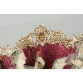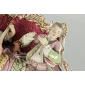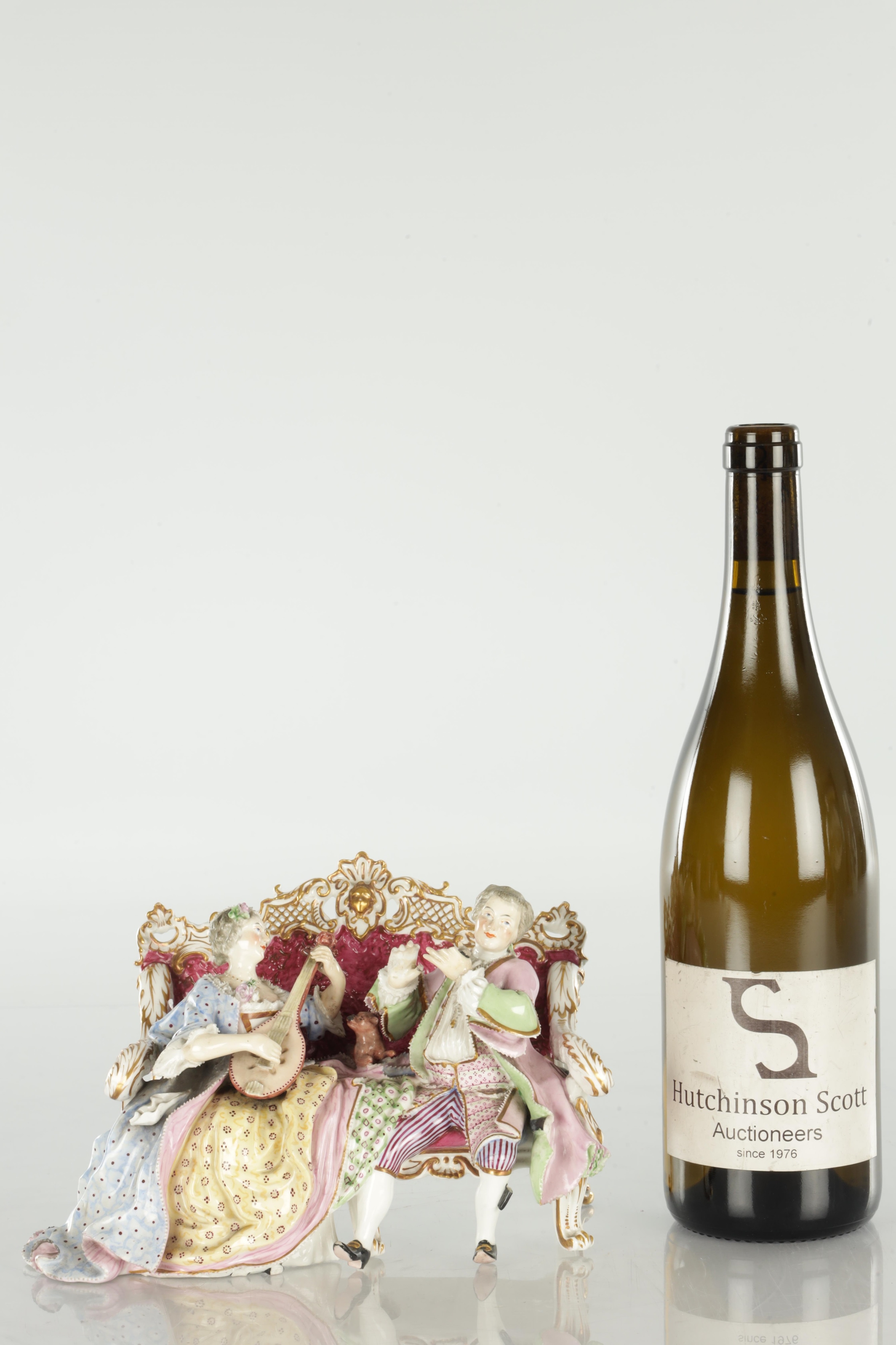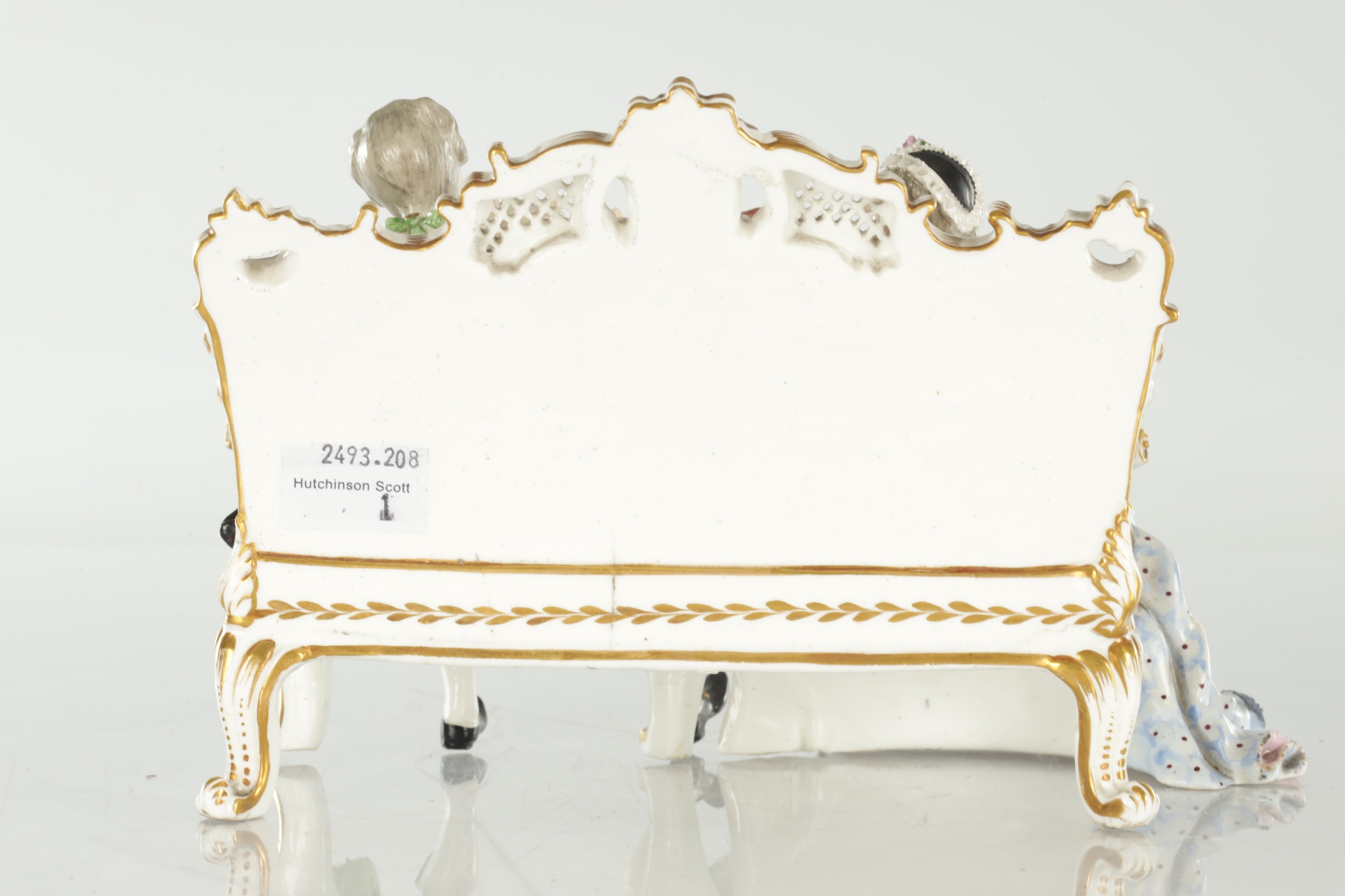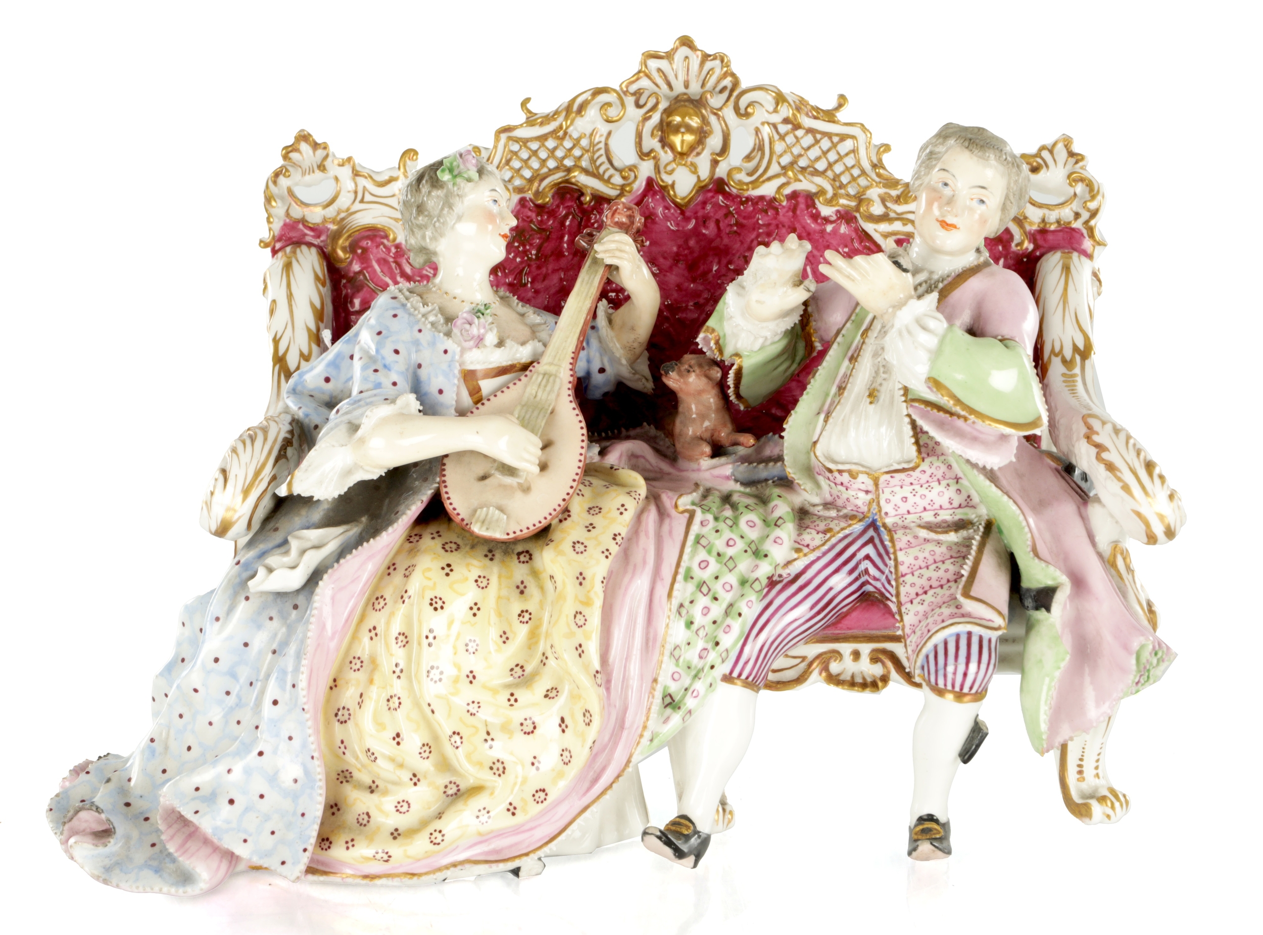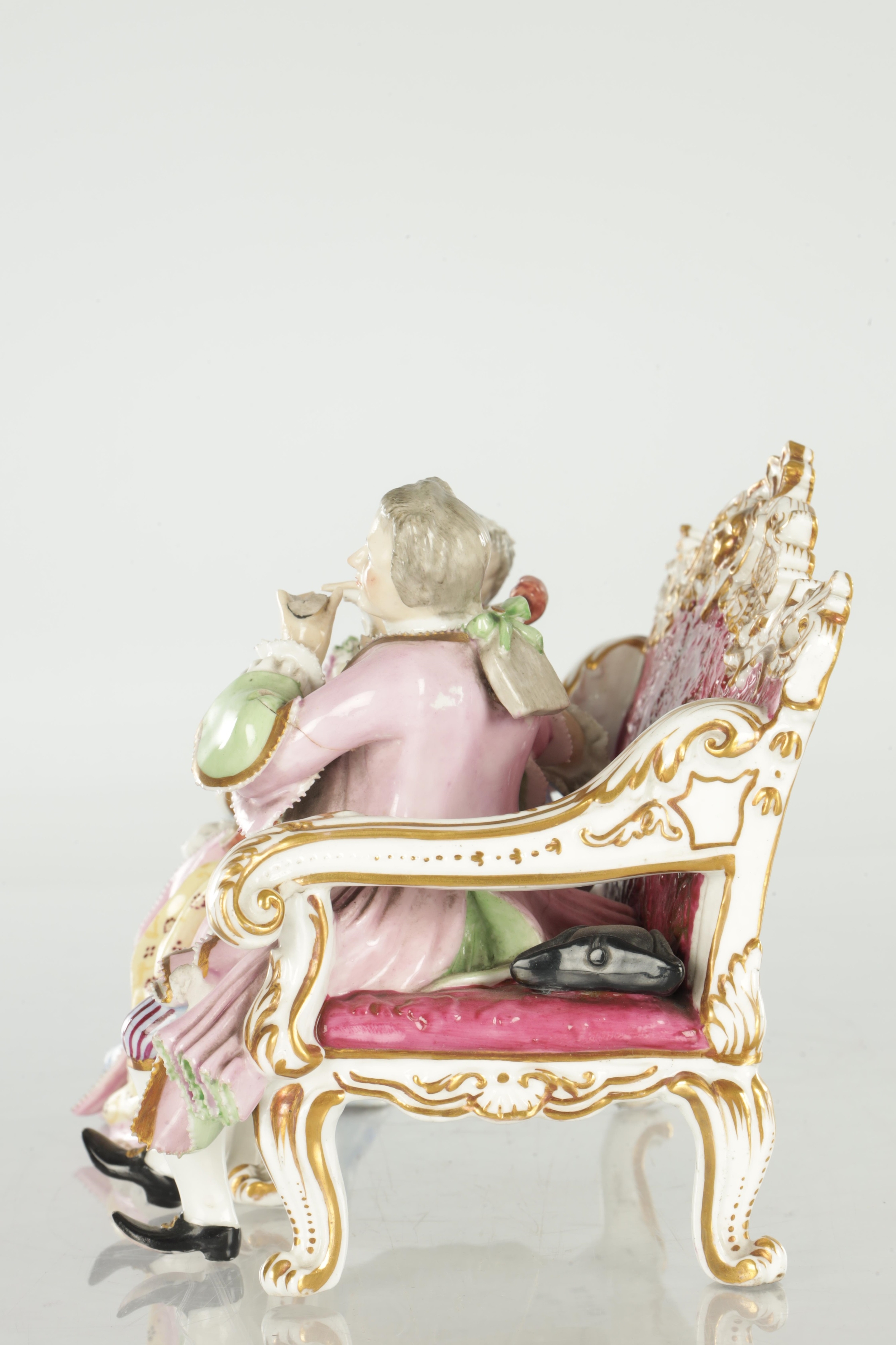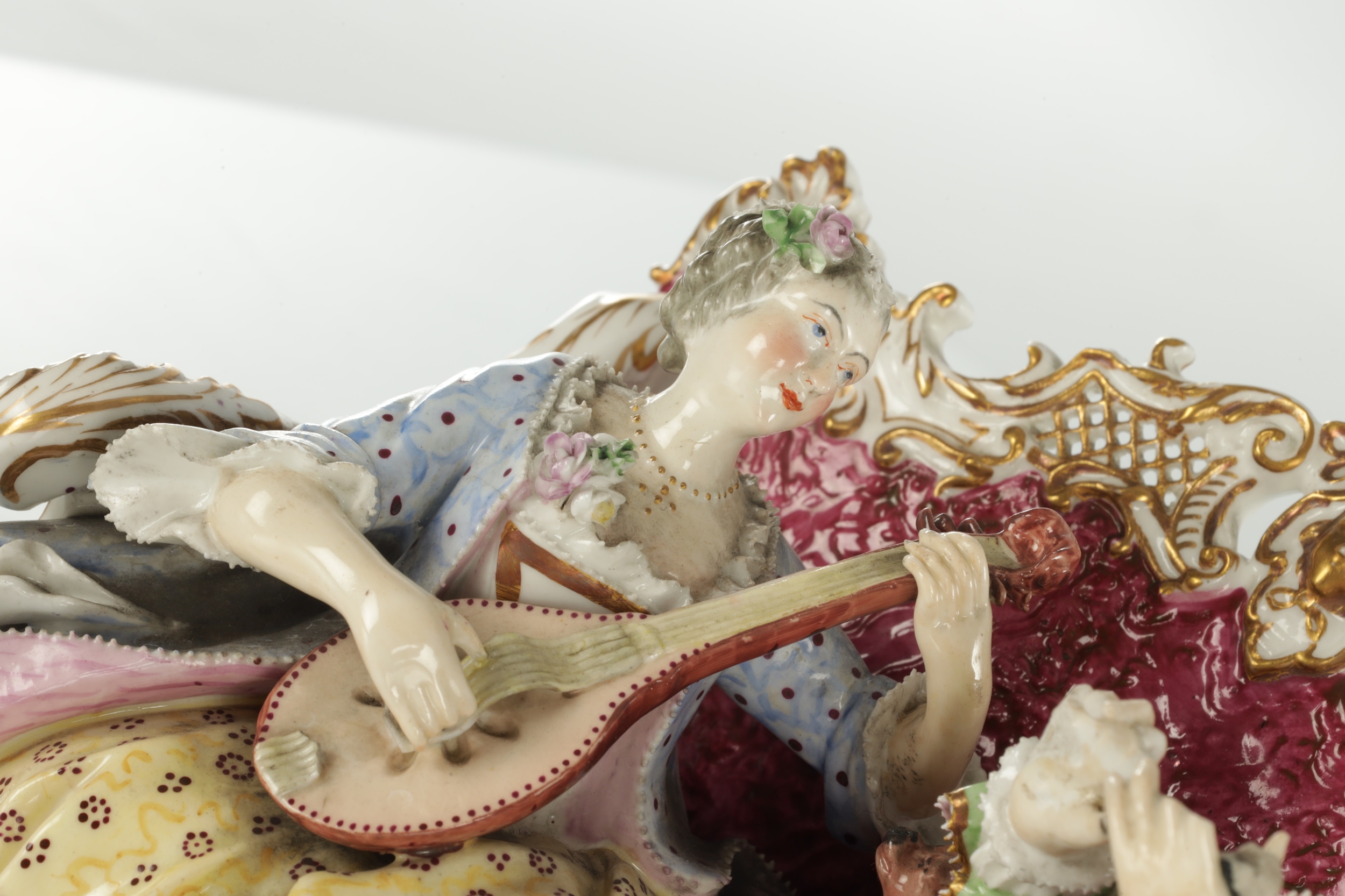 A LARGE LATE 19TH CENTURY MEISSEN-STYLE DRESDEN FIGURE GROUP OF MUSICIANS depicting a lady and gentleman seated on a French Rococo style settee dressed in elaborate coloured costume - indistinct mark beneath