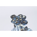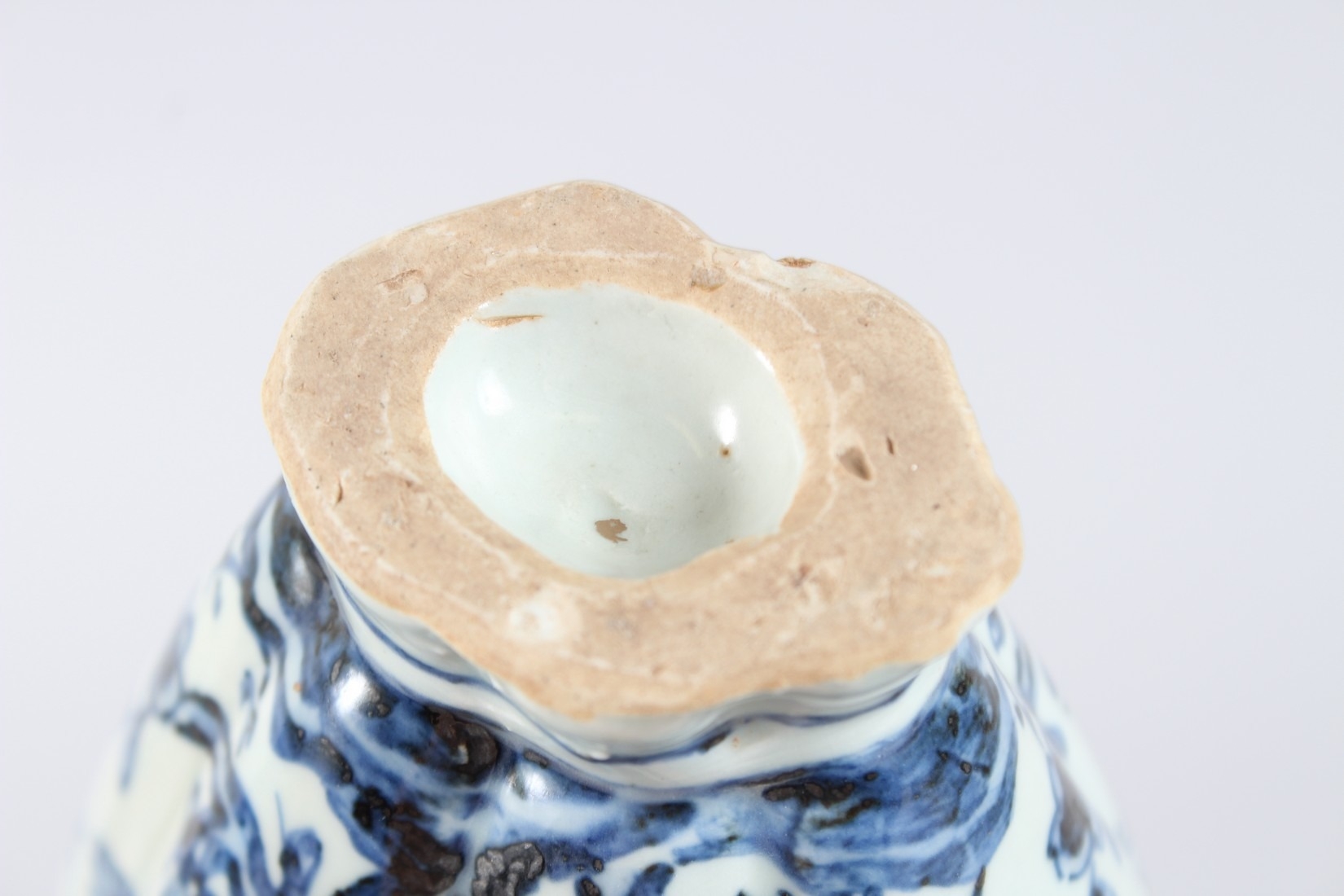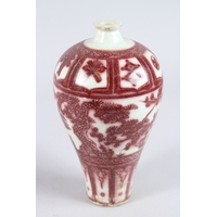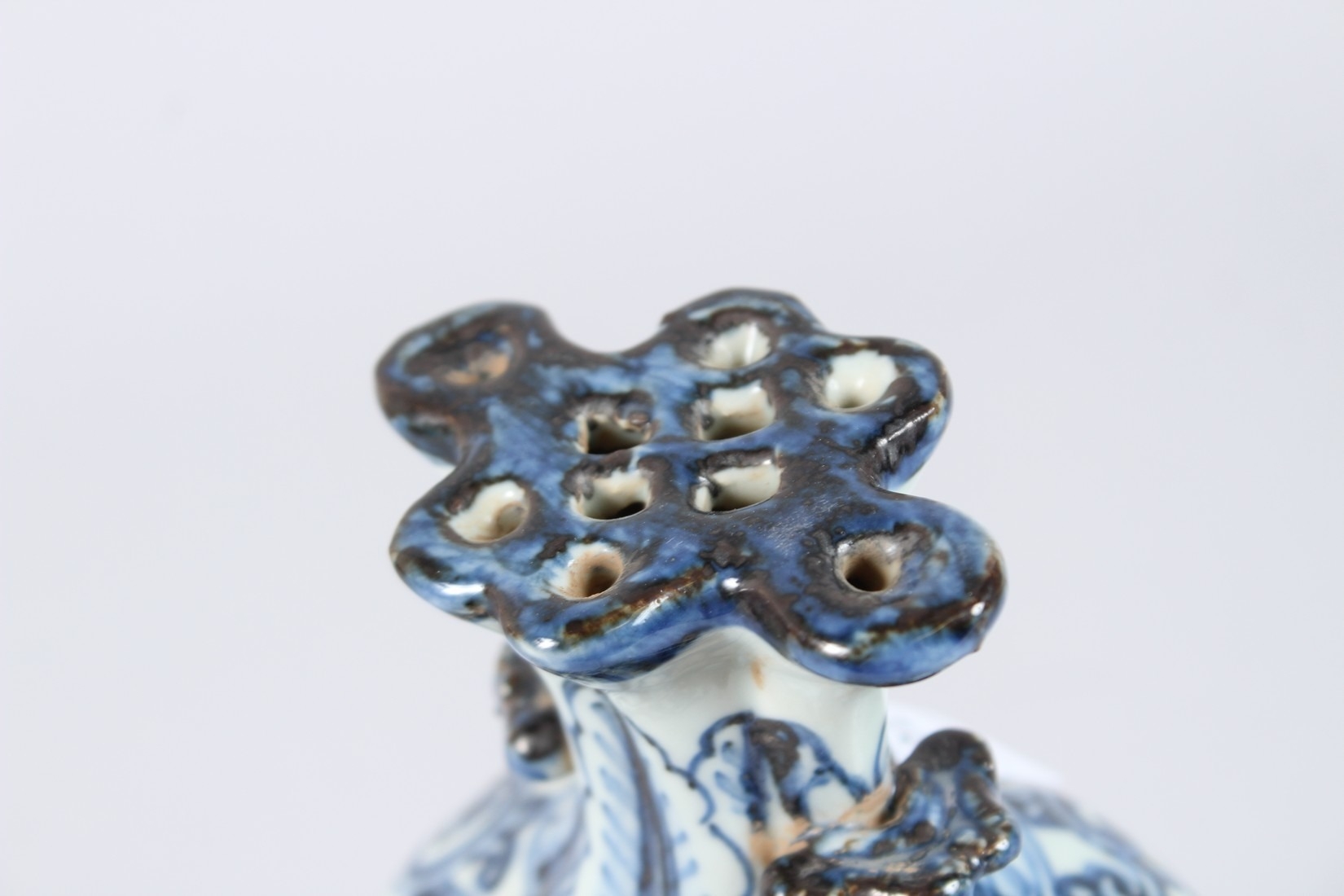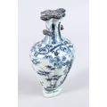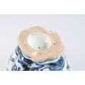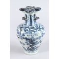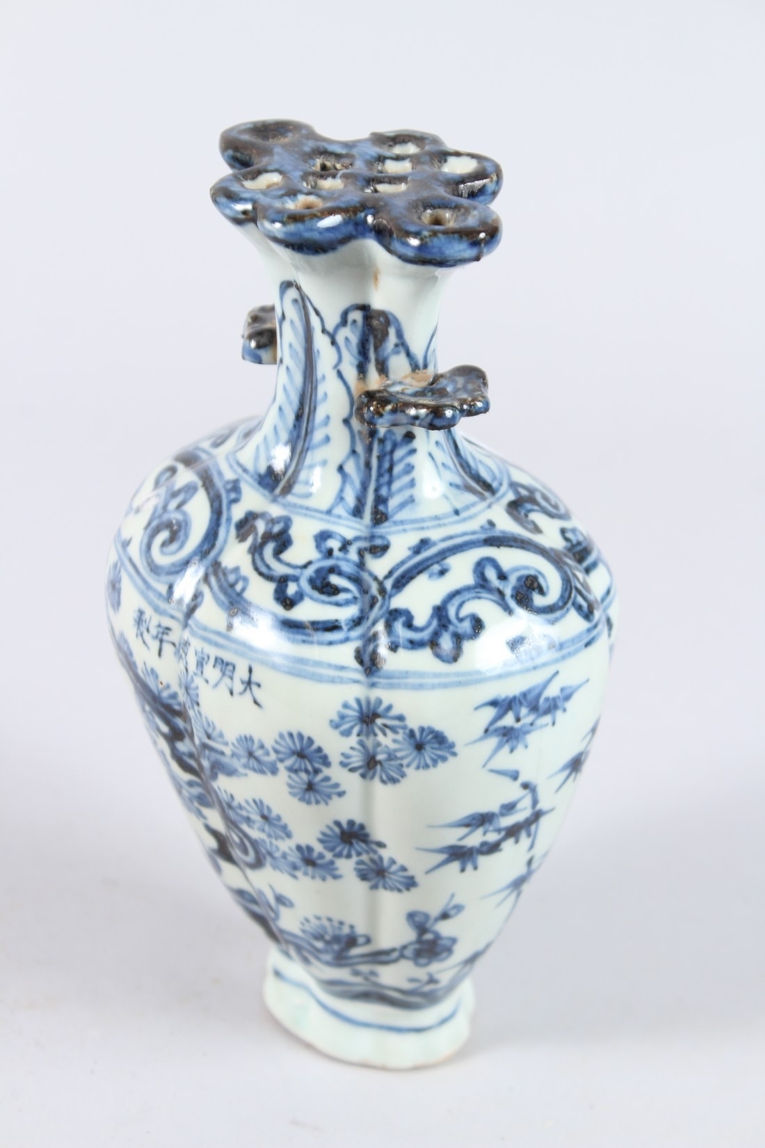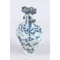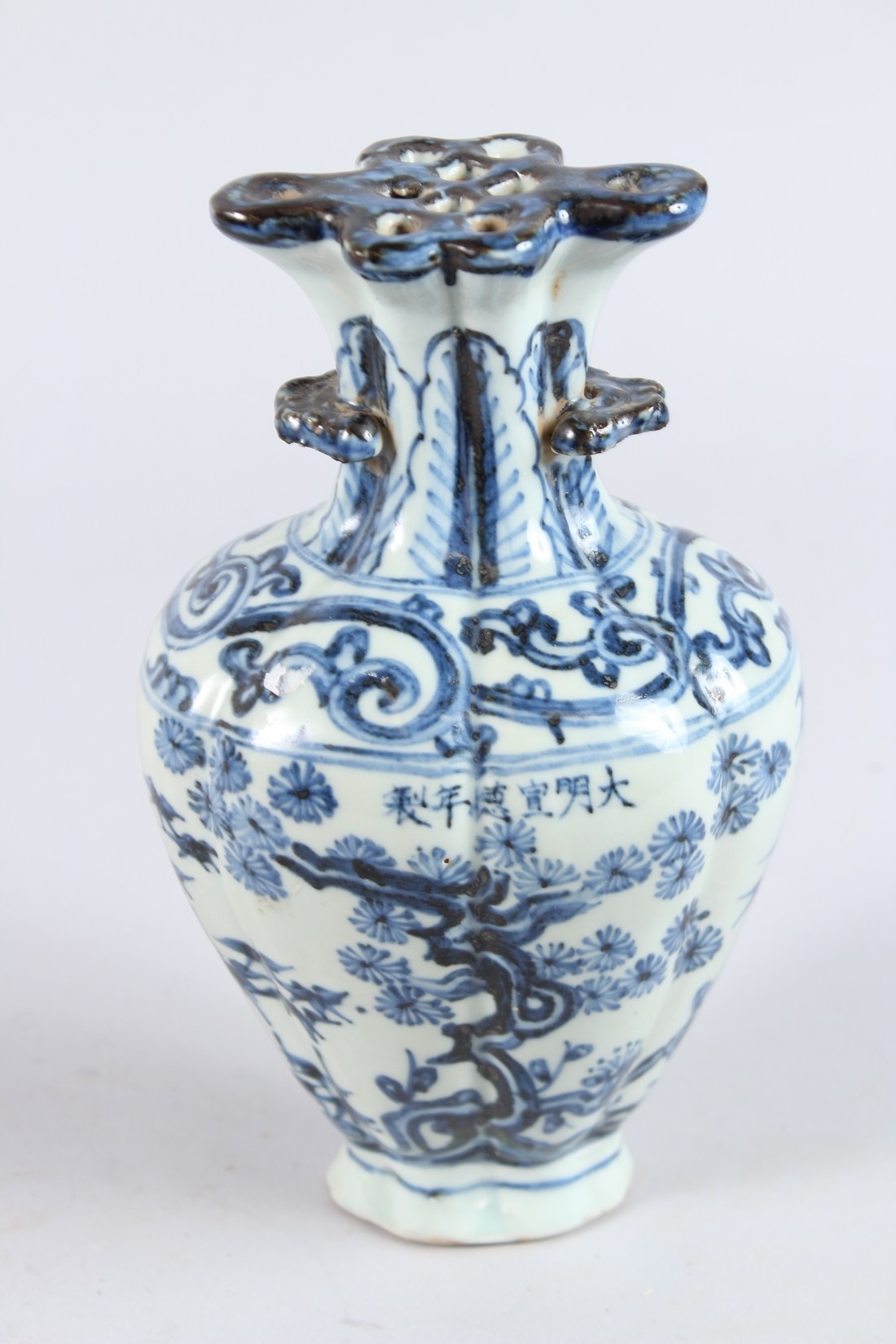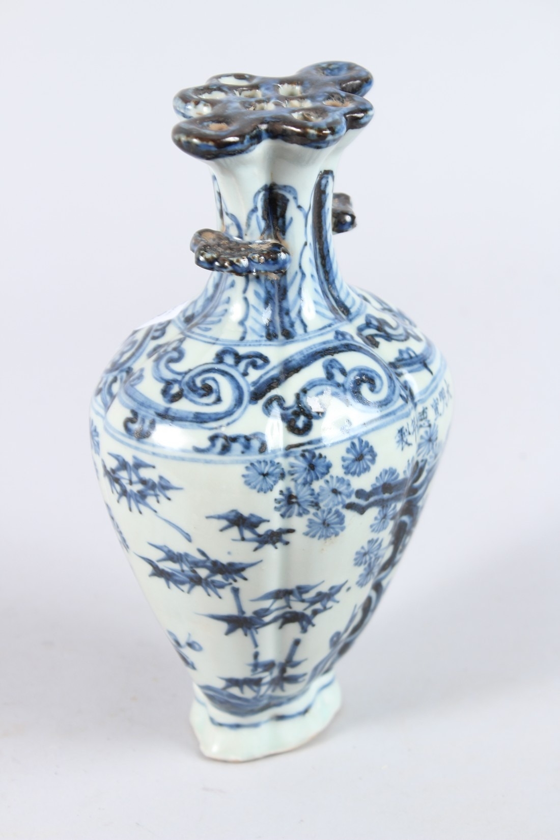 A CHINESE PORCELAIN BLUE AND WHITE VASE of moulded form, with pierced flower stem neck, painted with prunus trees.