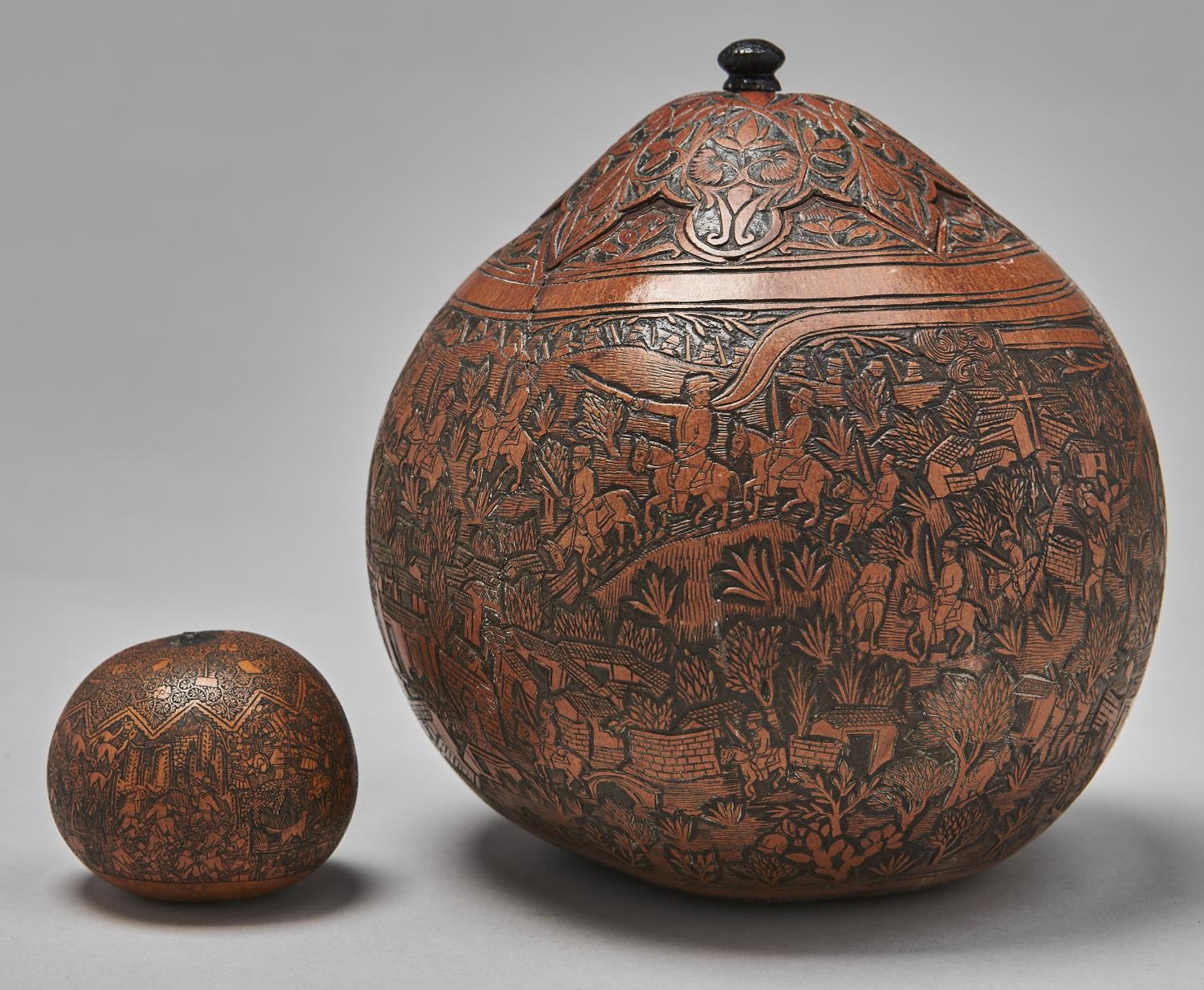 A South American pokerwork gourd, late 19th/early 20th c, intricately decorated by Hugo Ubaldo, signed, with figures and animals, 73mm diam and a larger carved gourd bowl and cover (3)