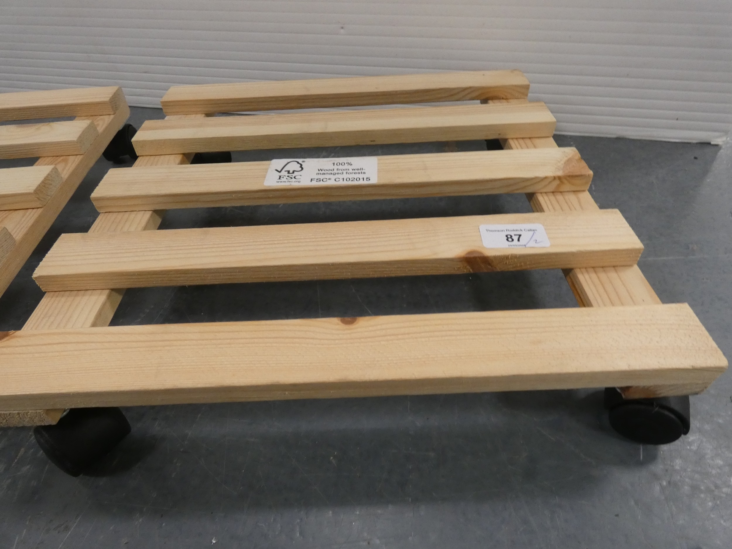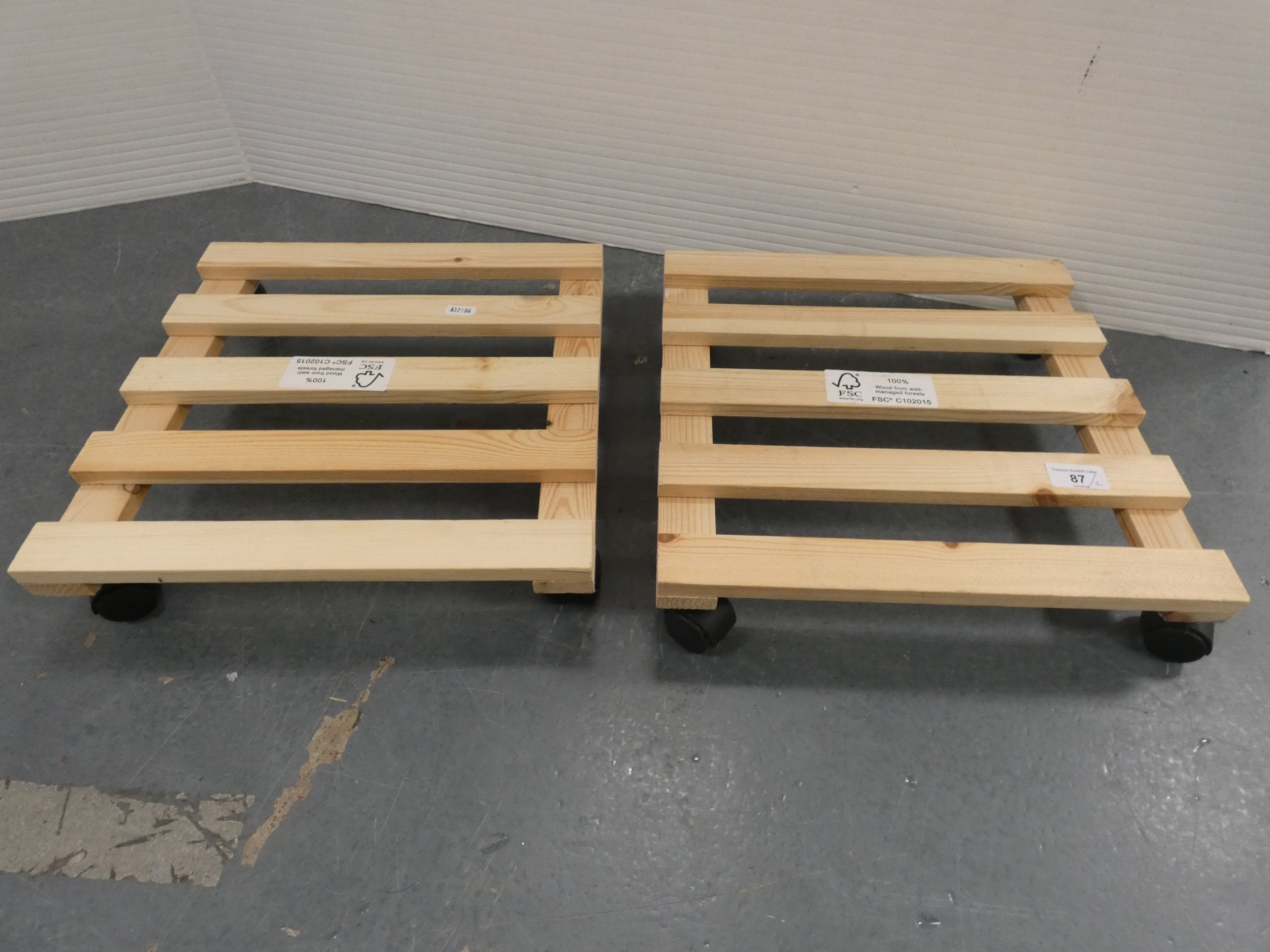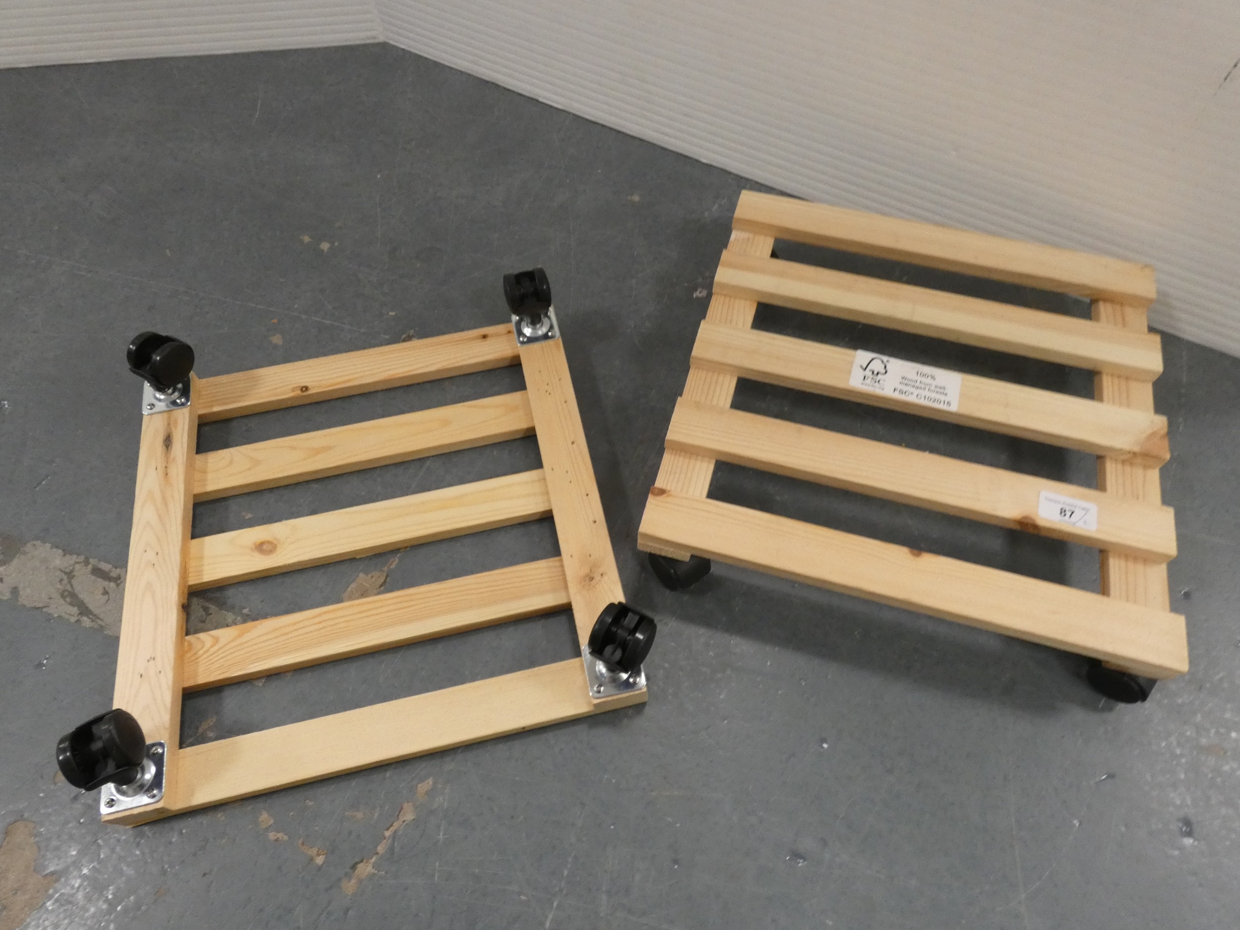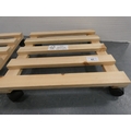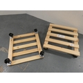 Two wooden plant pot trolleys.