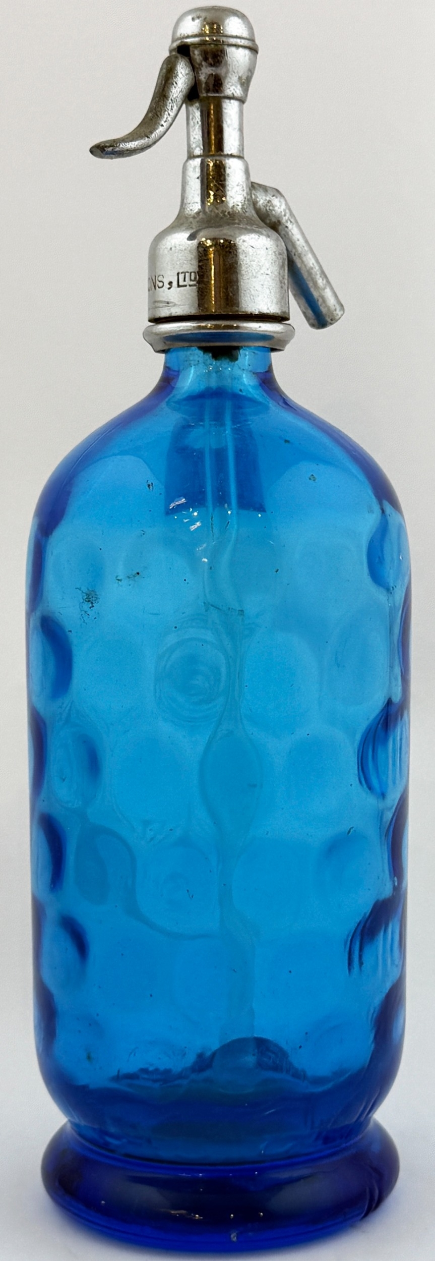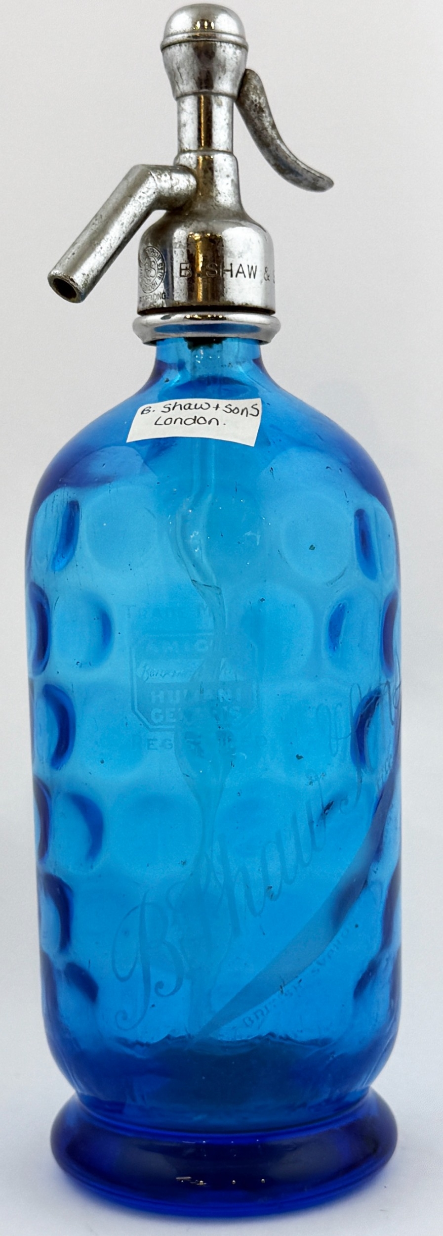 LONDON SODA SYPHON. 12ins tall. Acid etched B SHAW & SONS. Complete with trigger. Minor ding.