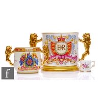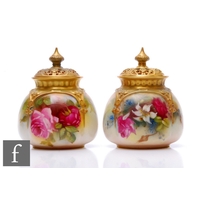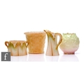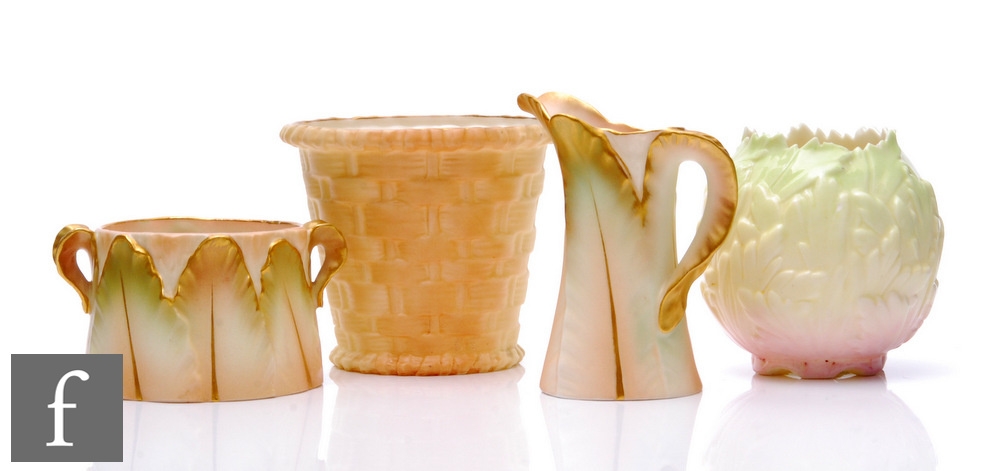 Four small pieces of Royal Worcester comprising a milk jug and sugar bowl formed from cabbage leaves with gilt and green detailing, a small fern pot formed as a basket and a cache pot of ovoid form with moulded leaves, damaged, all with printed marks, tallest 8.5cm. (4)