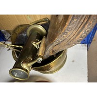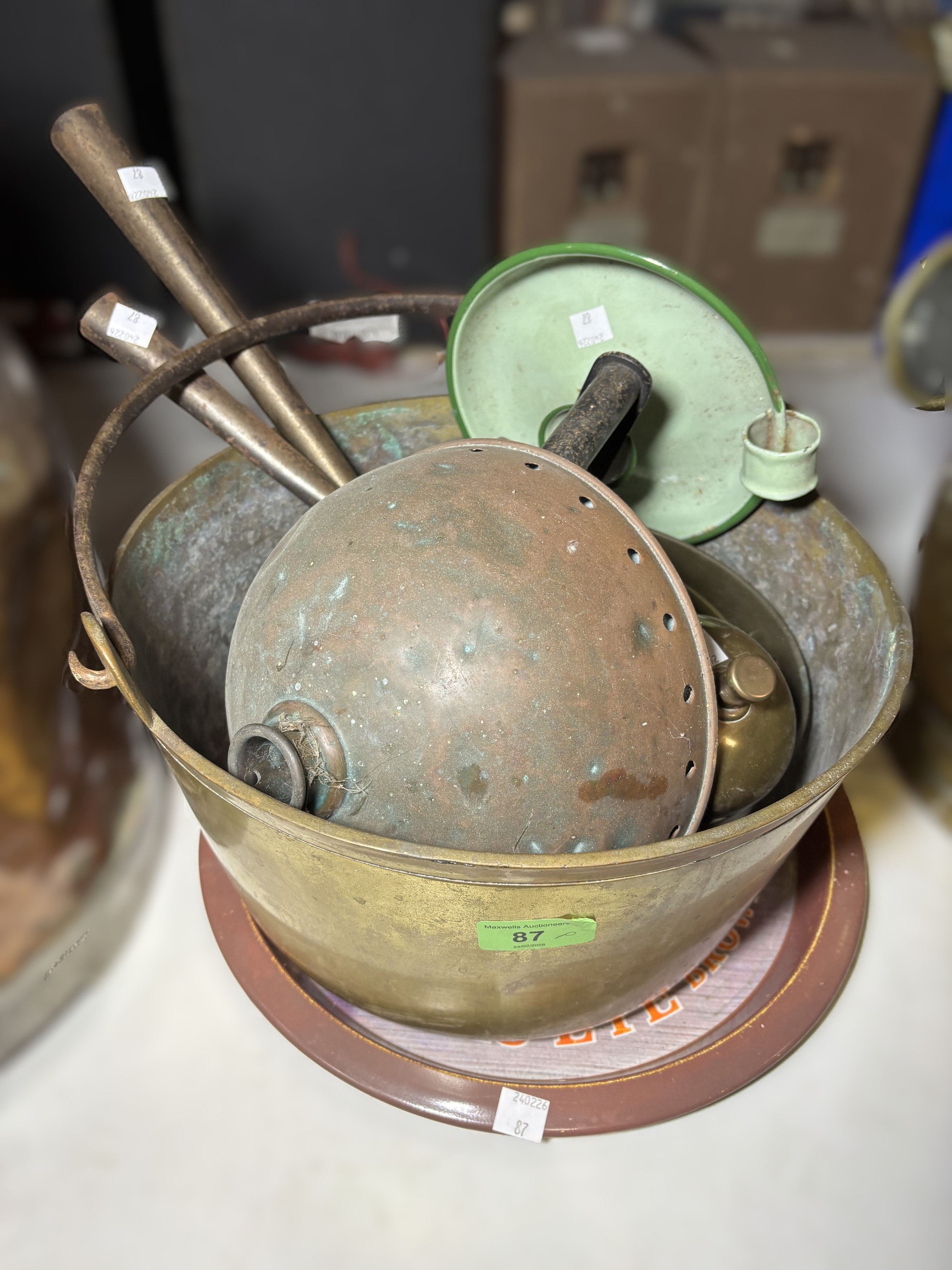 A large brass jam pan and a selection of metalware.
