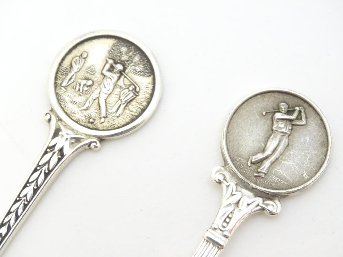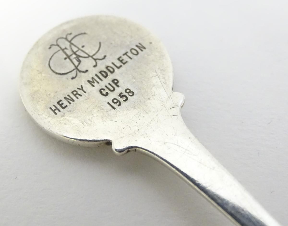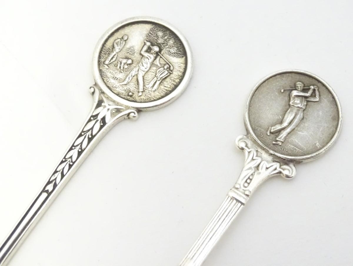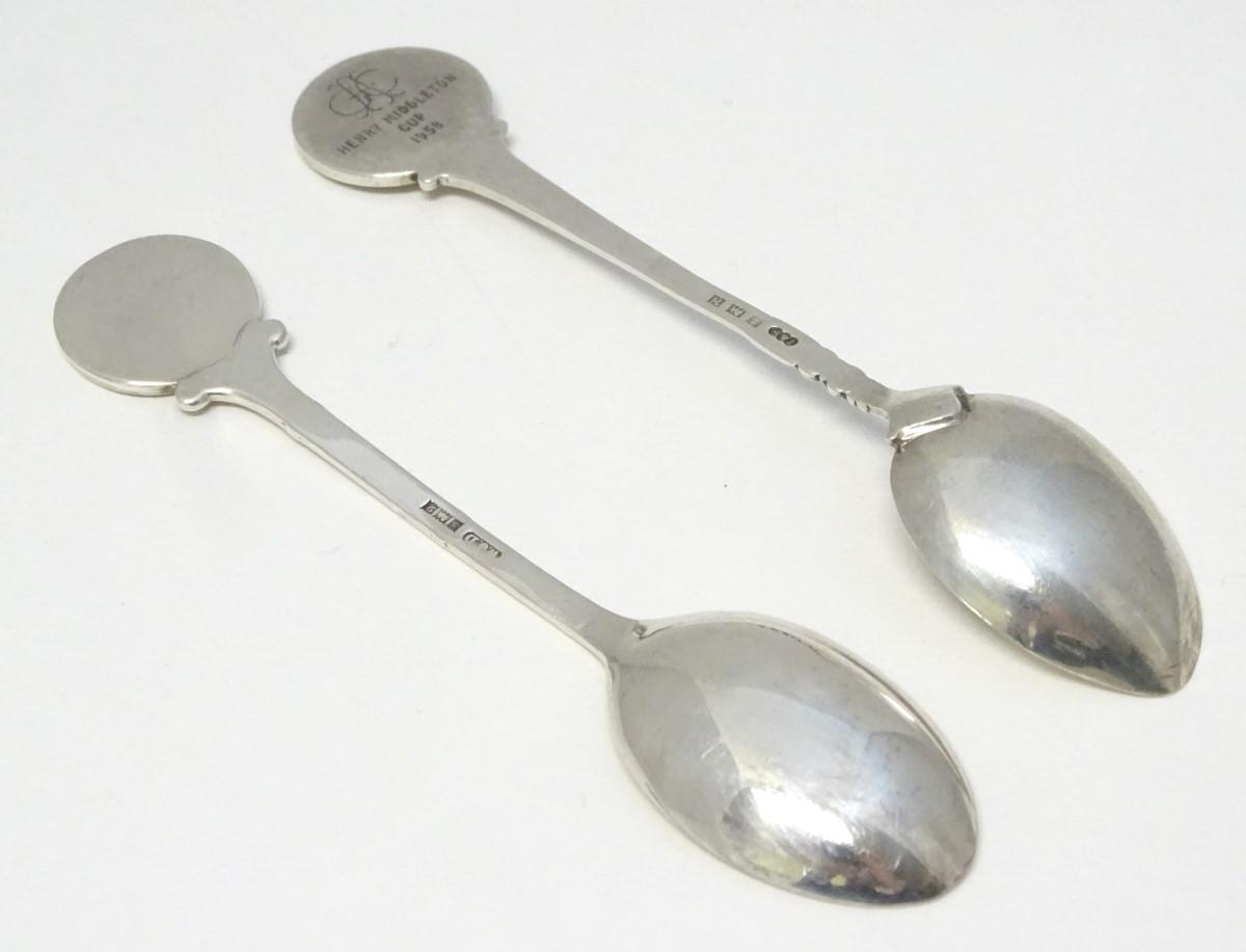 Two silver spoons, the handles decorated with images of golfers. Hallmarked Birmingham 1957 maker Turner & Simpson Ltd and Birmingham 1965 maker William James Dingley. One engraved Henry Middleton Cup 1958. Approx 4 1/2'' long
