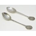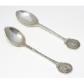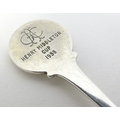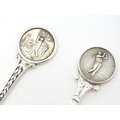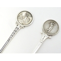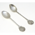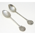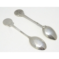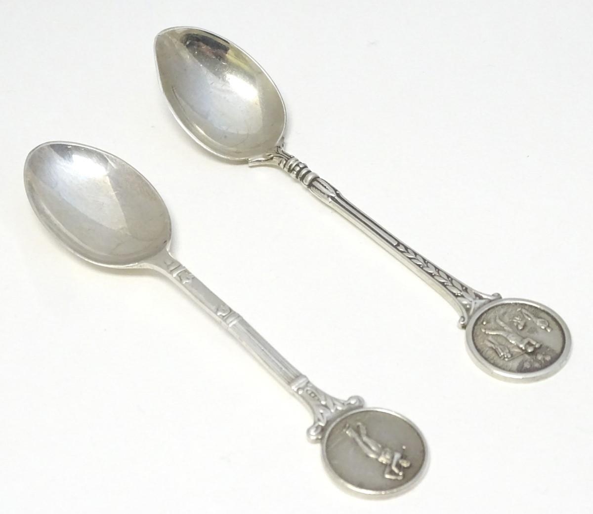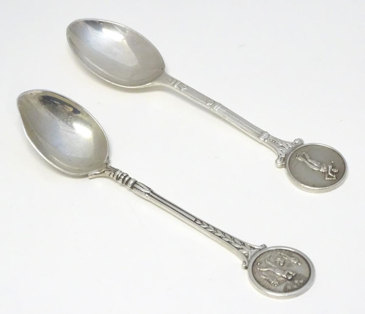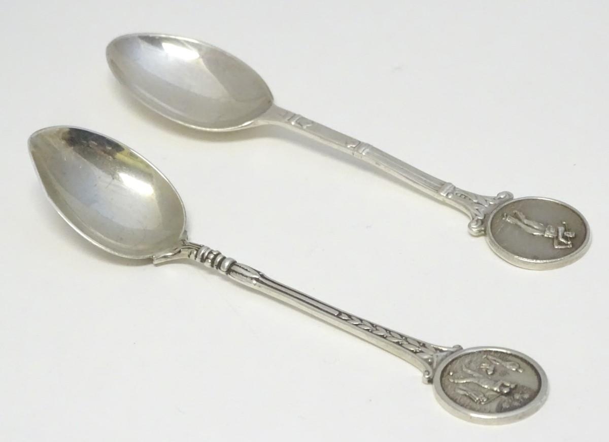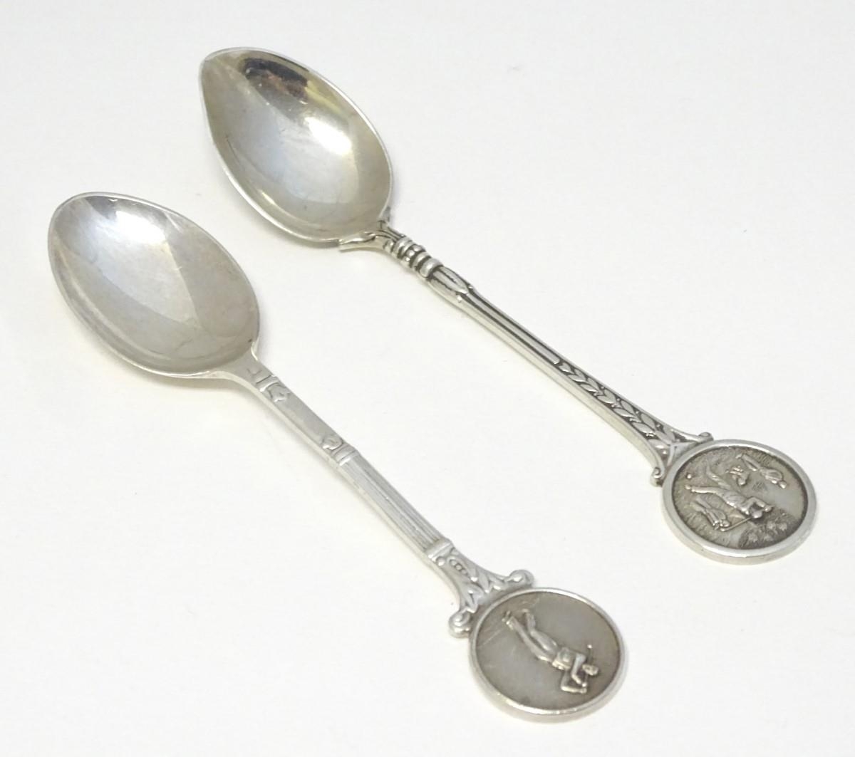 Two silver spoons, the handles decorated with images of golfers. Hallmarked Birmingham 1957 maker Turner & Simpson Ltd and Birmingham 1965 maker William James Dingley. One engraved Henry Middleton Cup 1958. Approx 4 1/2'' long