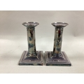 A Pair of Hallmarked Silver Dwarf Candlesticks, each column detailed in relief with ribbon tied swags and removable nozzles on square tapering bases (bases weighted), 12cm high. (2)