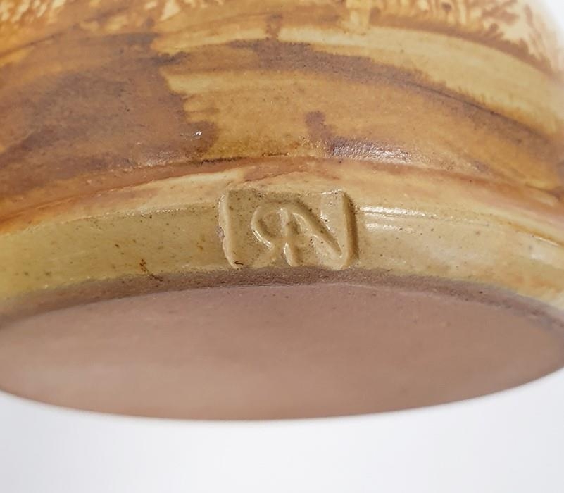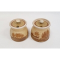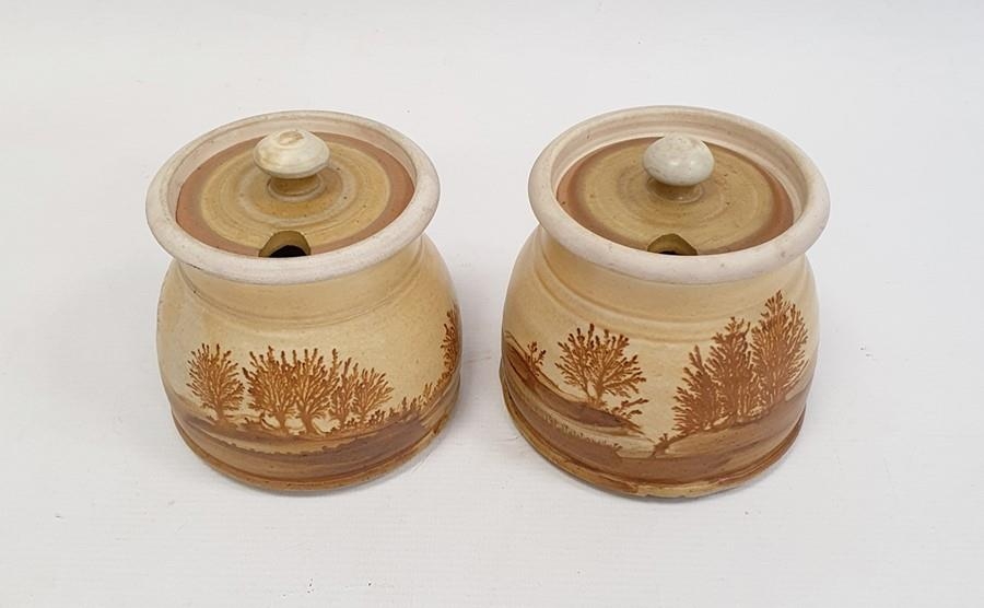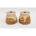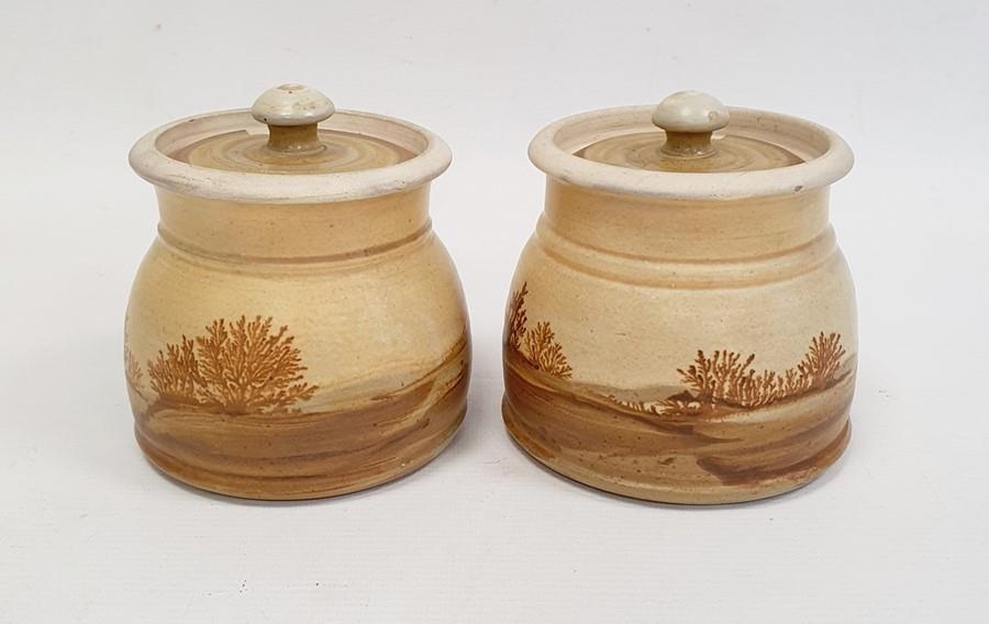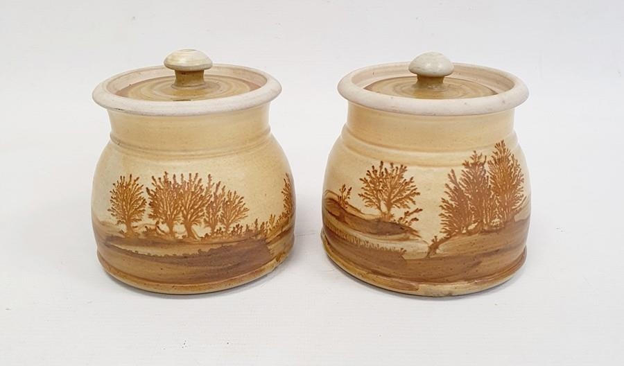 Pair of Rupert Andrews "Mocha" ware lidded preserve jars decorated with country landscapes, impressed potter's marks to base