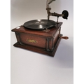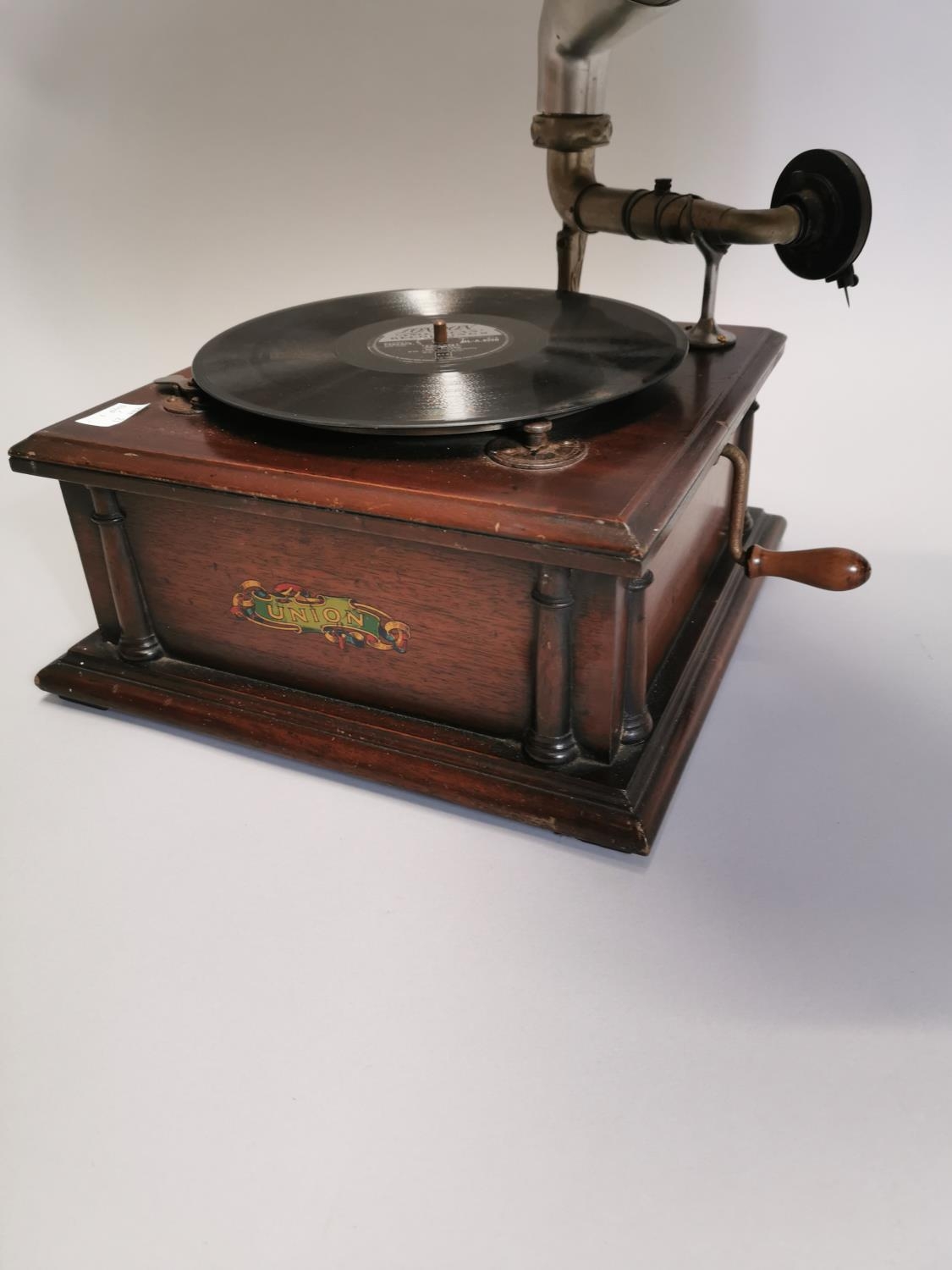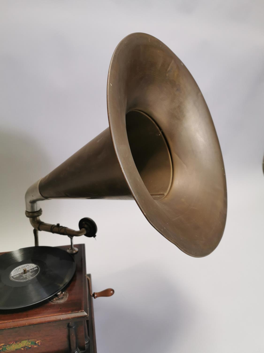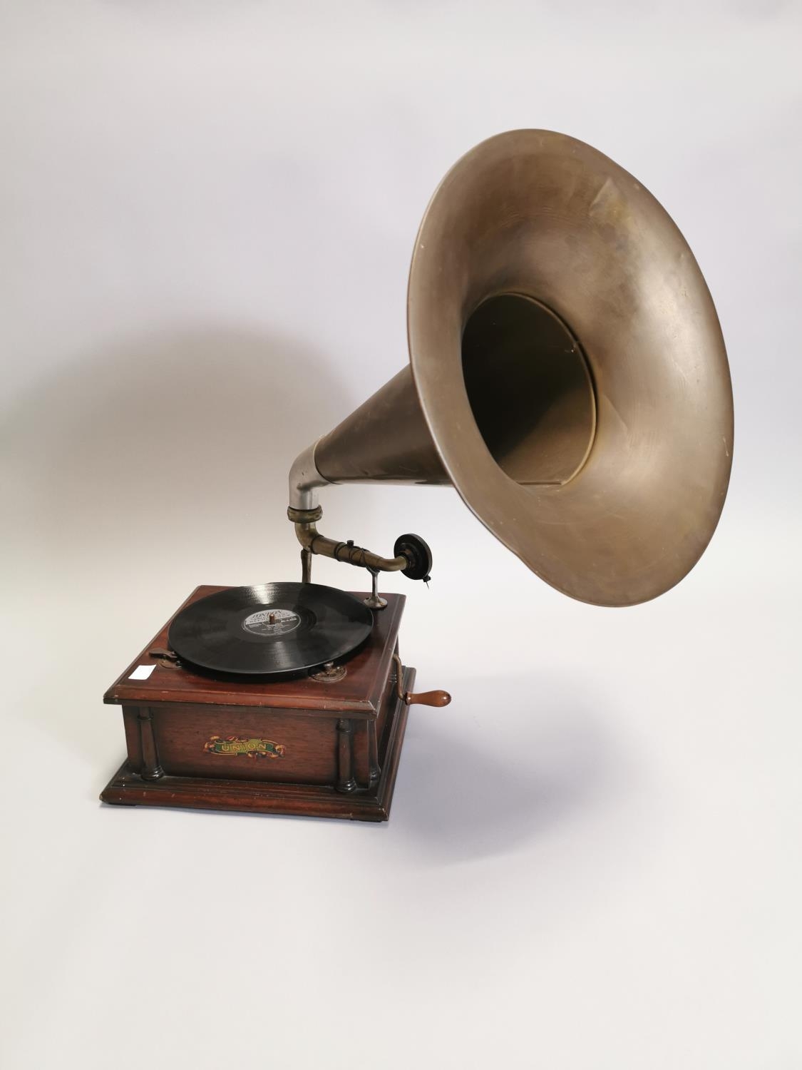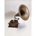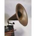 Early 20th. C. oak cased Union gramophone with horn { 72cm H X 63cm W X 56cm D }.