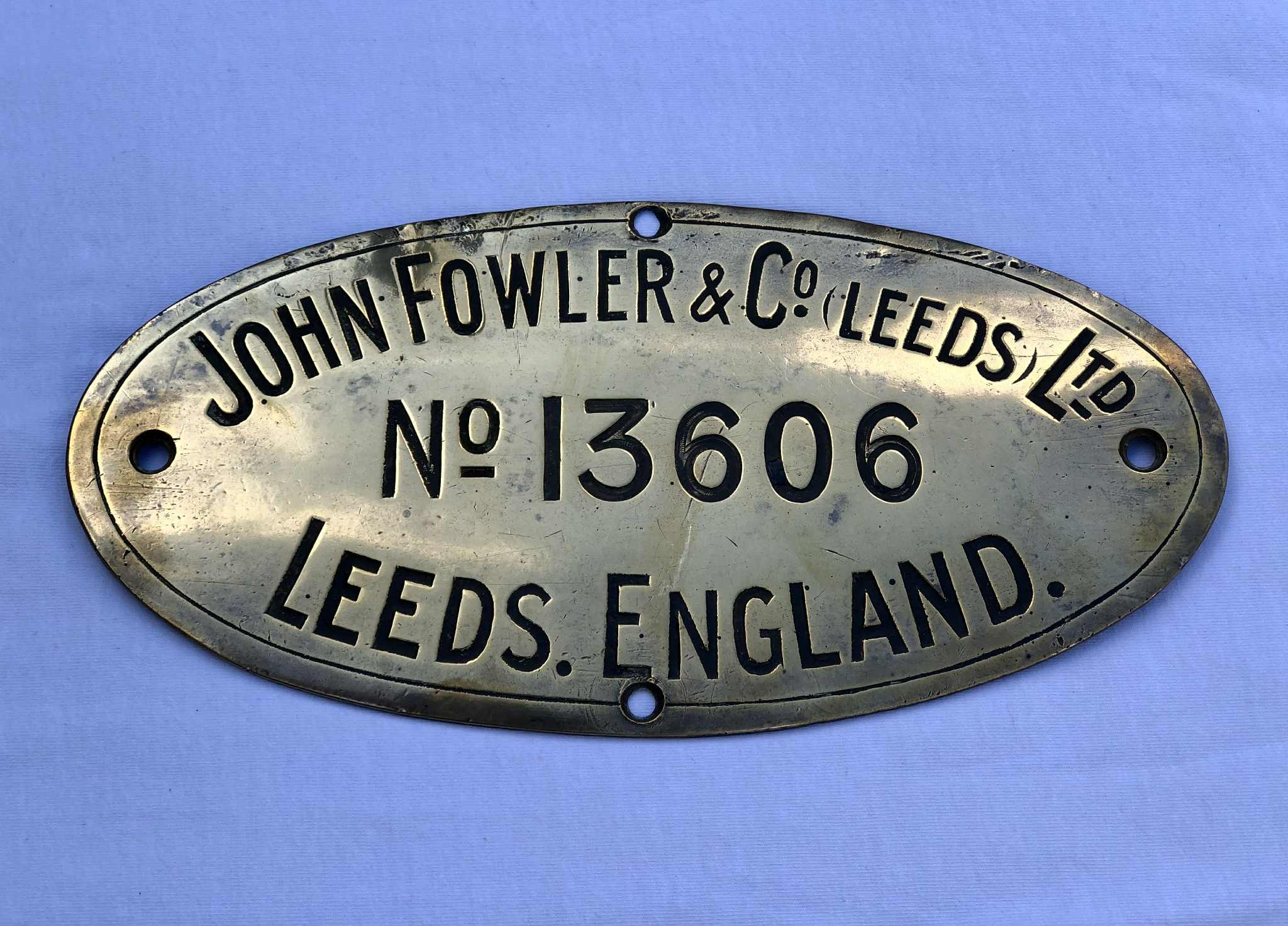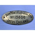 John Fowler & Co Traction Engine Works Plate No.13606. 9 3/4" x 4 7/8" With a curved radius to fit to boiler barrel. 13606 was a Class AA2 Ploughing Engine owned at various times by Cole Bros of Sleaford, Gunters of Wetherby, Hugh Kirkham of Terrington St Clement Norfolk and Frederick Thorpe & Sons Moulton Chapel Lincolnshire