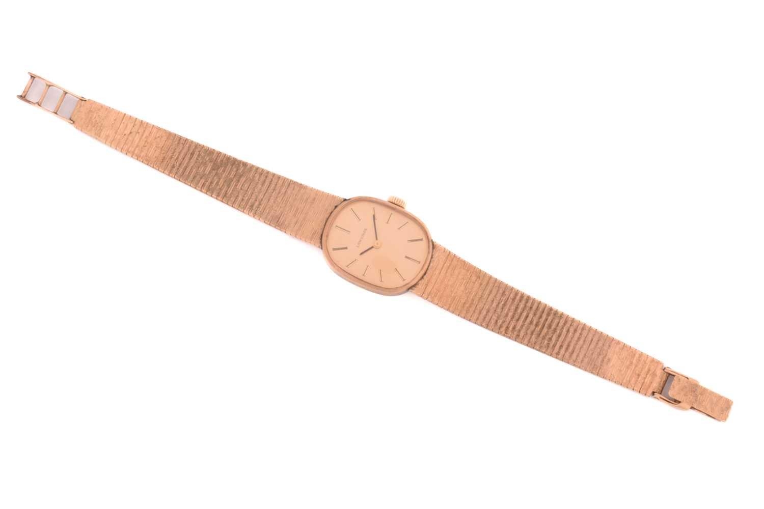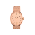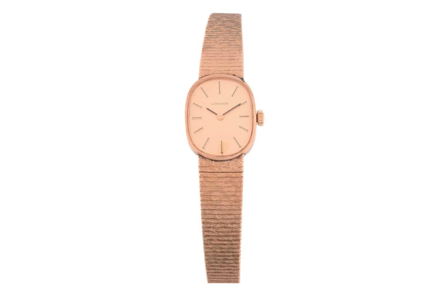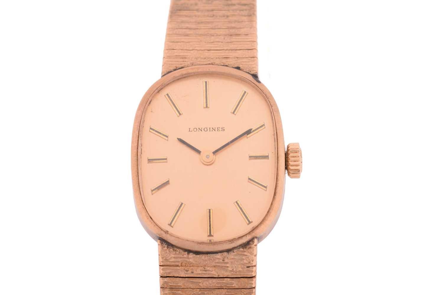 A Longines 9ct gold dress watch. Model: Serial: 51867936 Case Material: 9ct gold Case diameter: 19mm Dial: Gold Numerals: Baton Movement: Manual Calibre: 5602 Strap: Woven 9ct gold Buckle: Folding Box: No Papers: No
