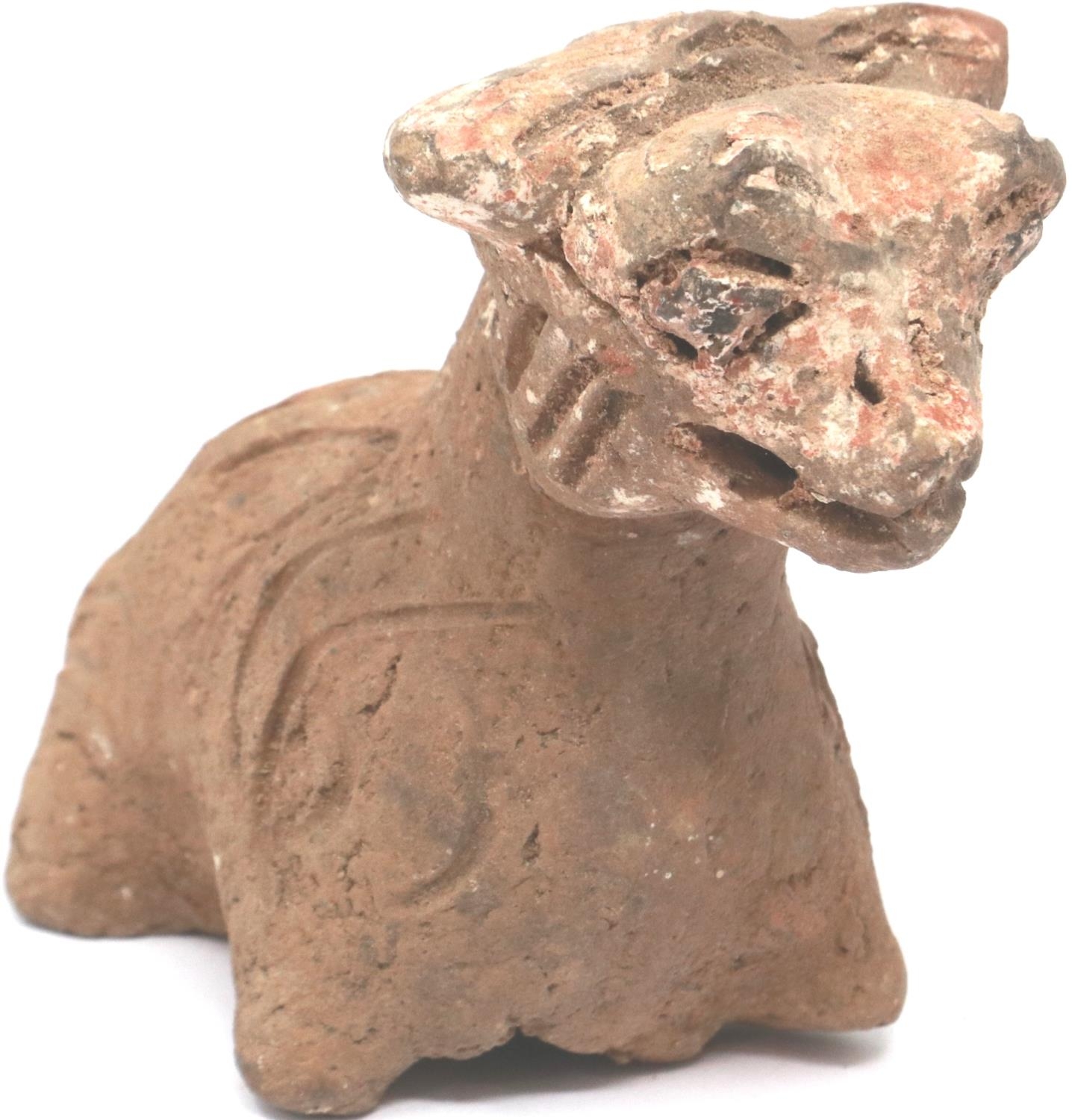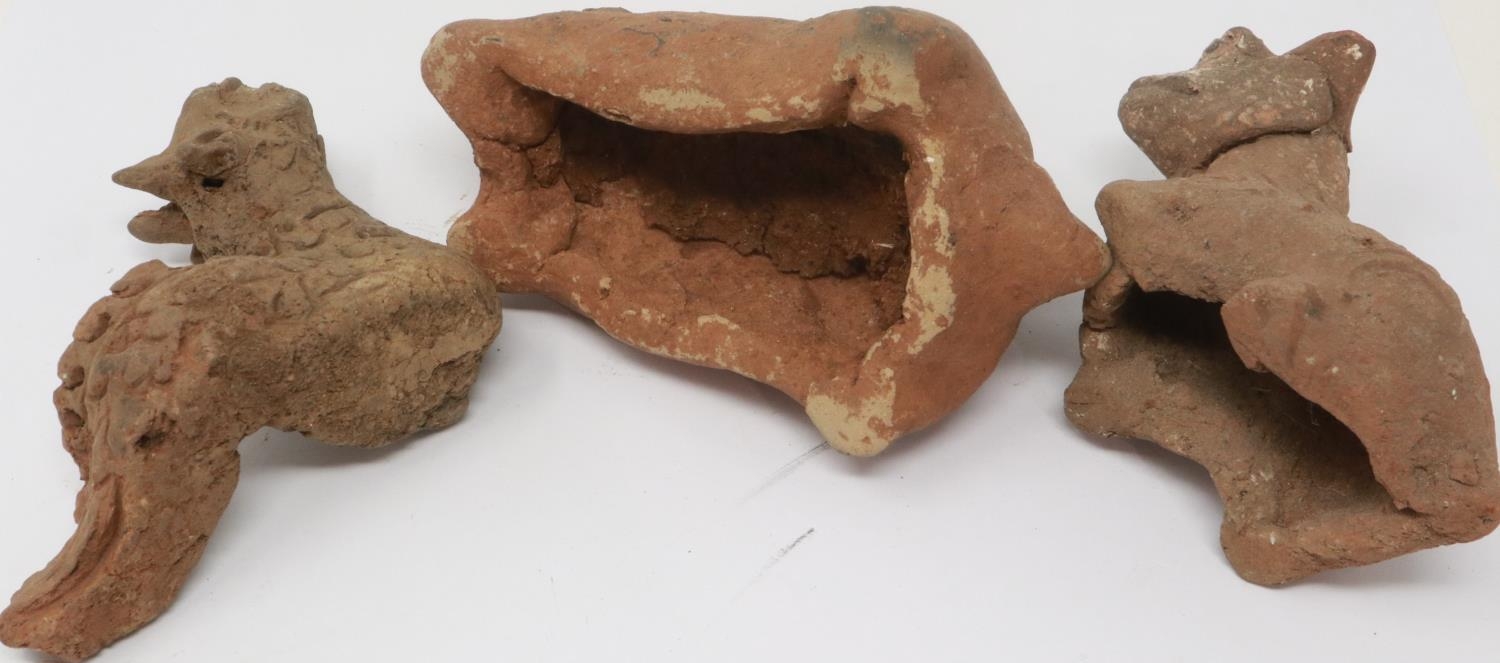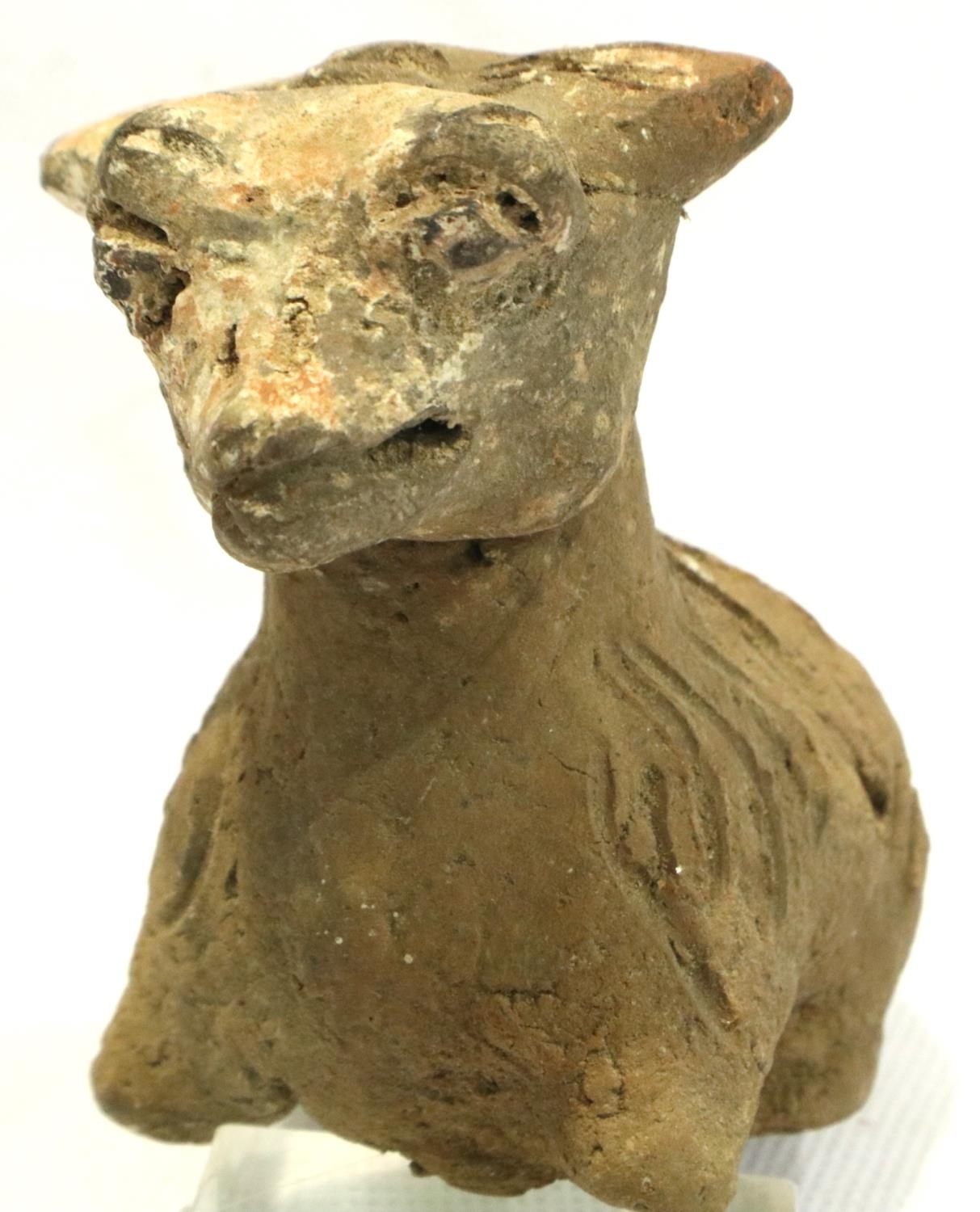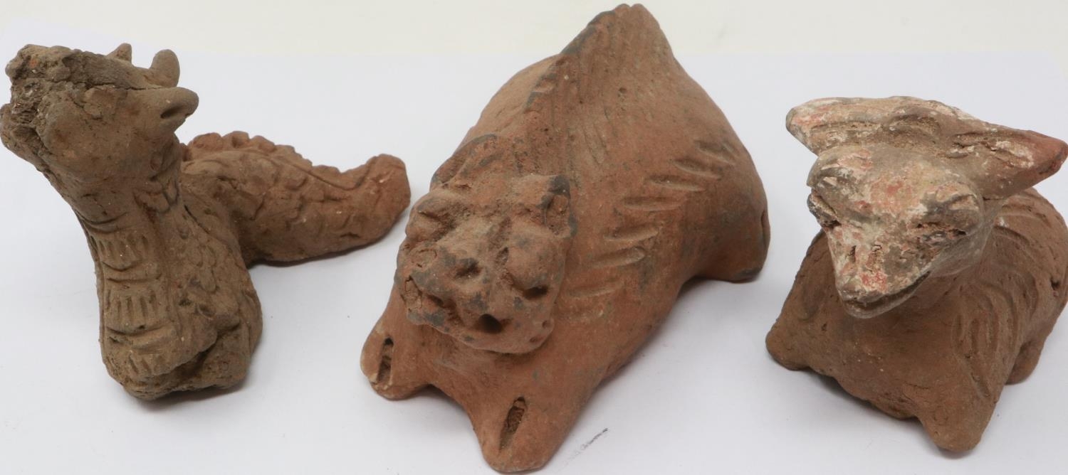 A Han Dynasty zoomorphic clay figure of a recumbent goat, serpent and another beast (3), largest H: 8 cm, L: 10 cm. P&P Group 1 (£14+VAT for the first lot and £1+VAT for subsequent lots)