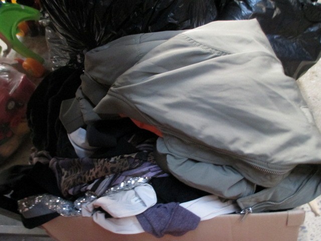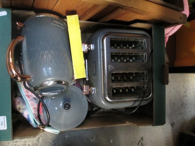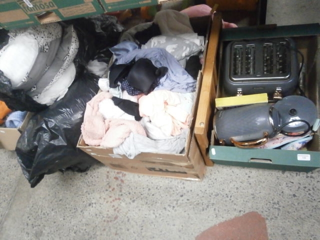 Lot inc clothing, home furnishings, toaster, kettle, etc