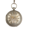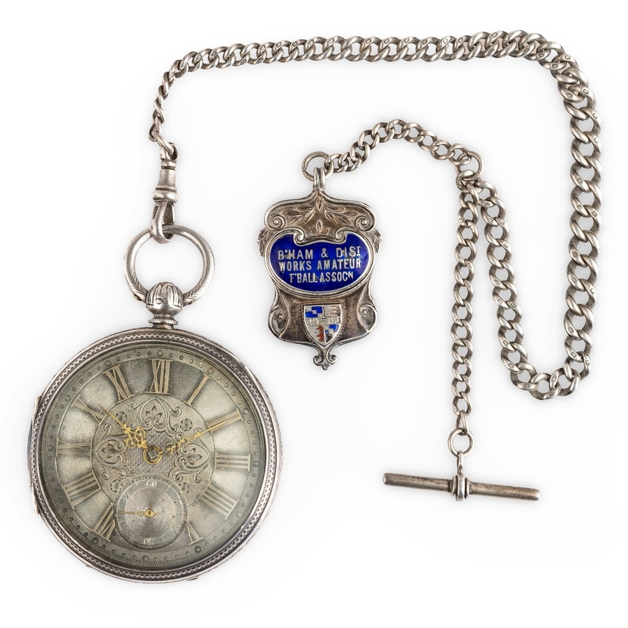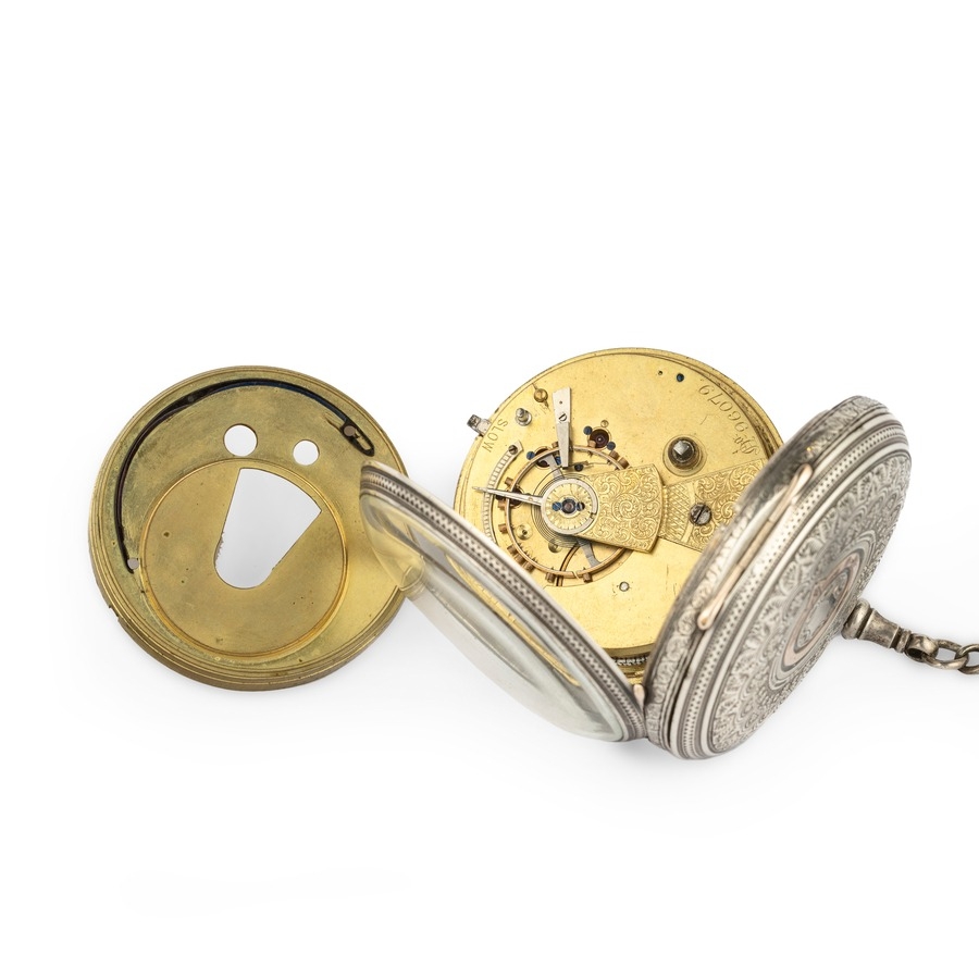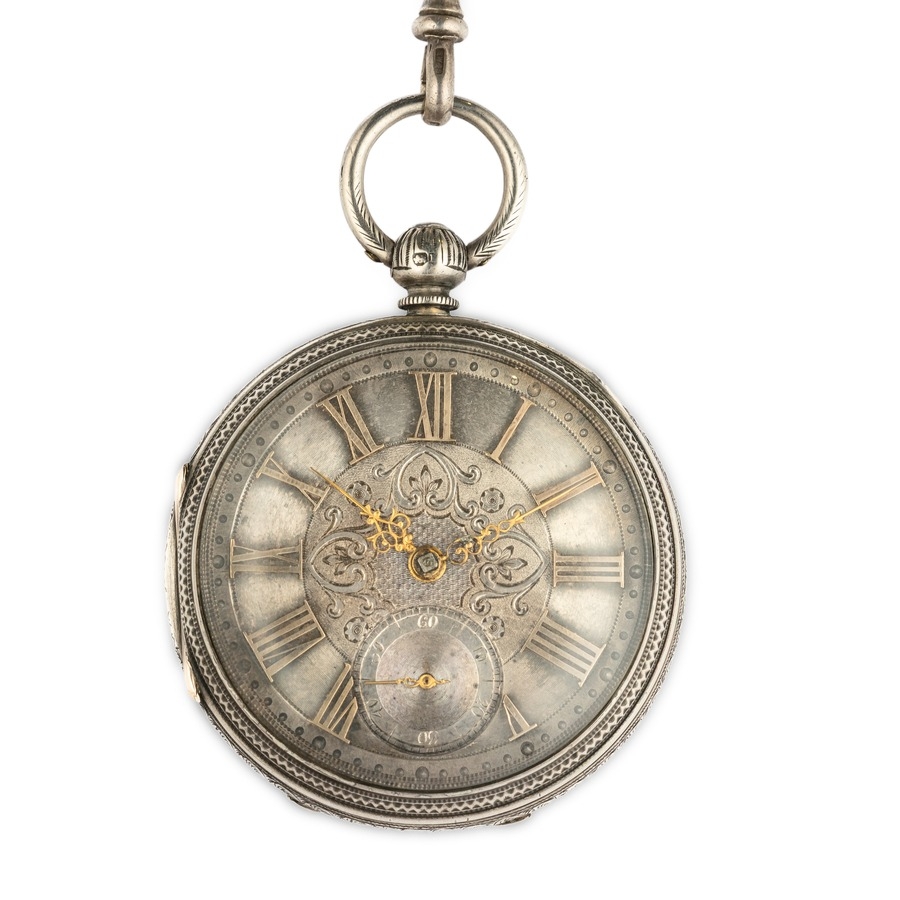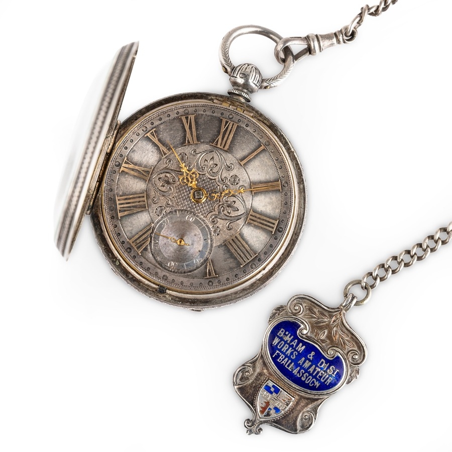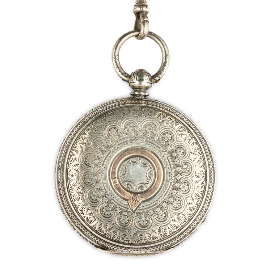 OROLOGIO DA TASCA A RIBALTA IN ARGENTO, CON CATENA E BOF IN ARGENTO, INGHILTERRA 1883