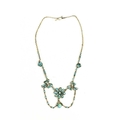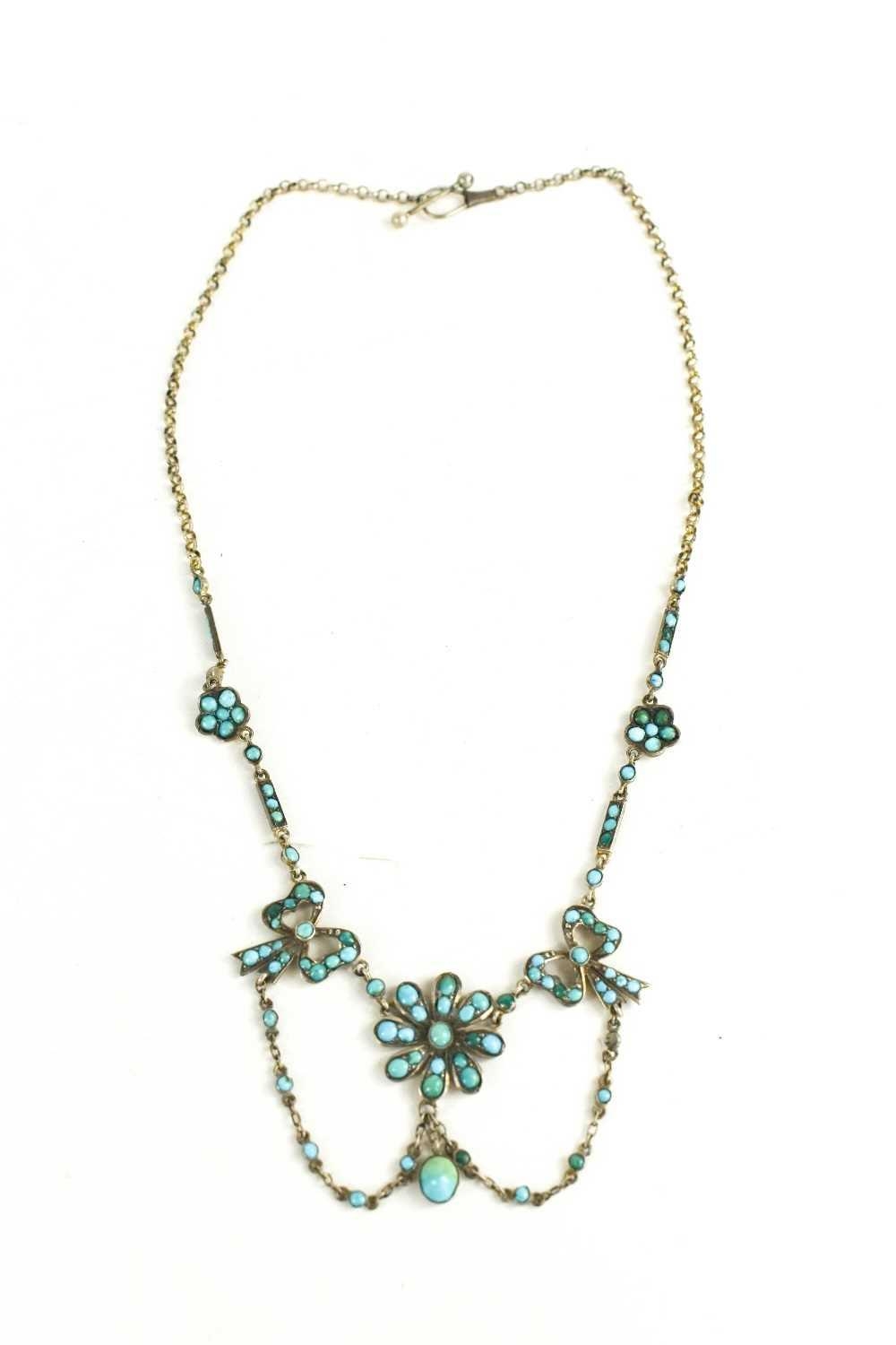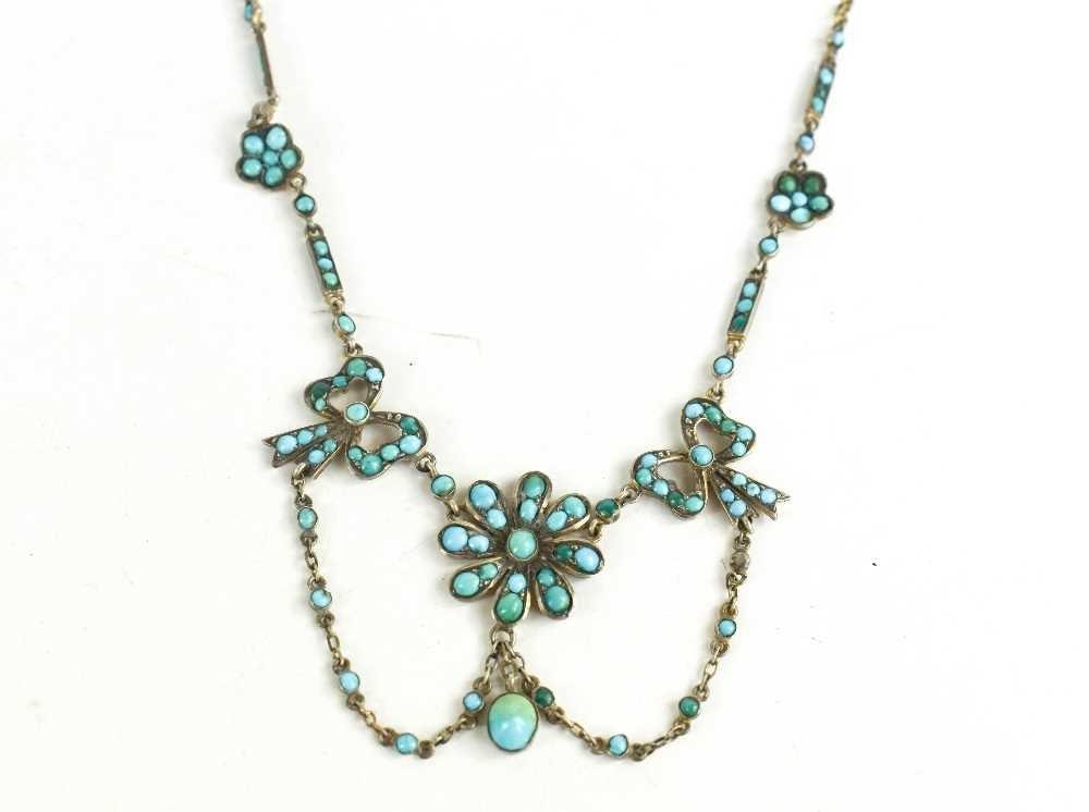A pretty silver and turquoise Art Nouveau necklace, wth flower head and bow form links, and an oval pendant with adjoining swags, bar and hoop clasp.