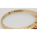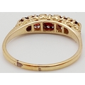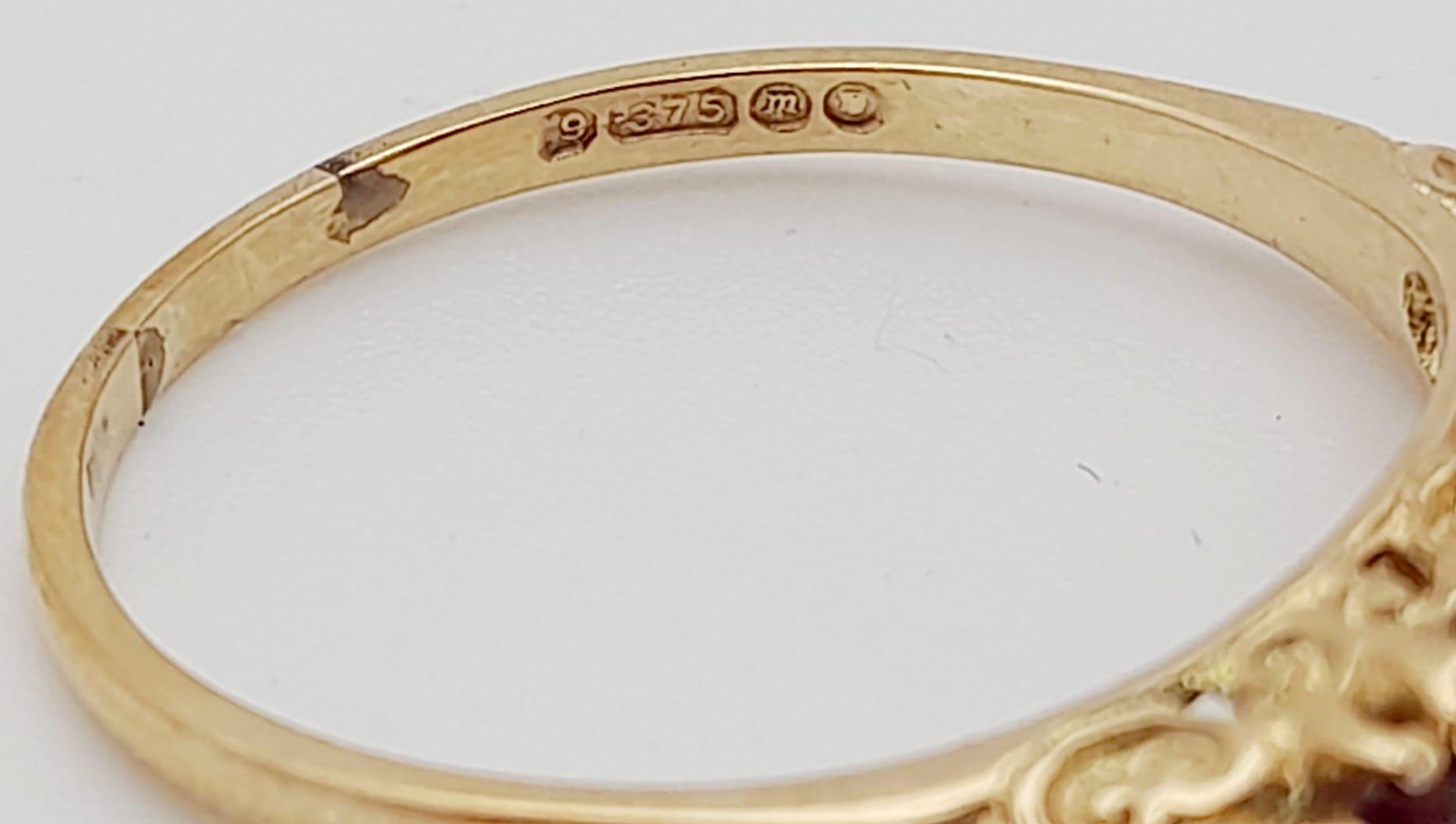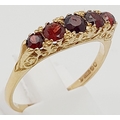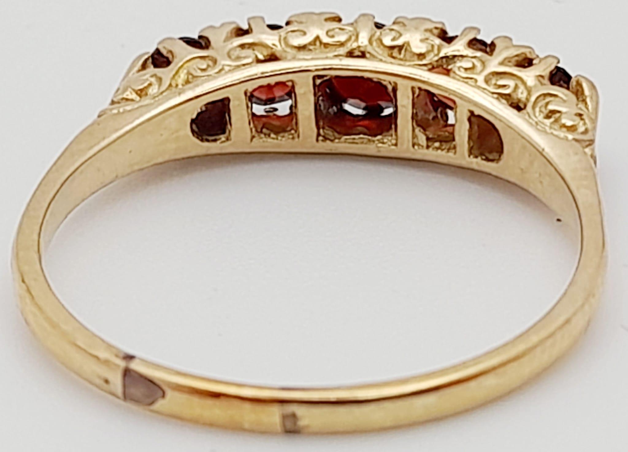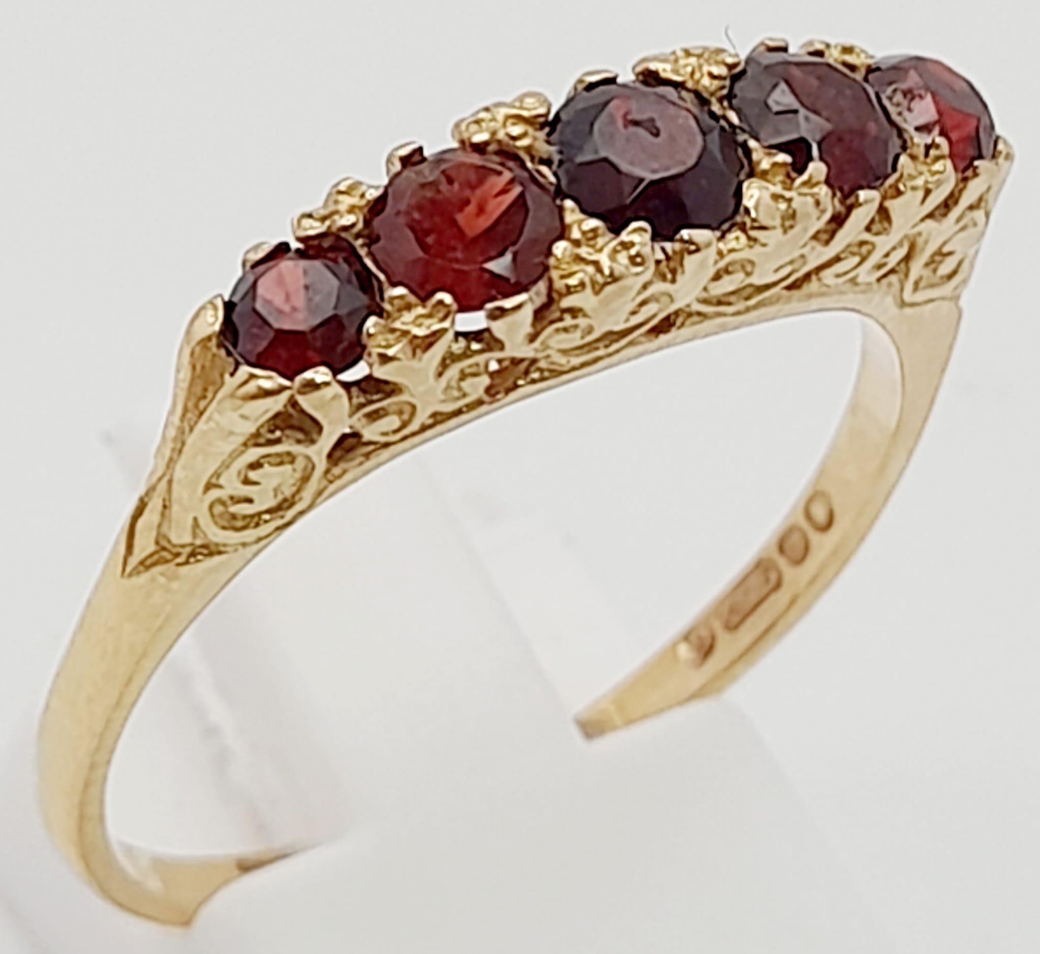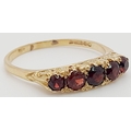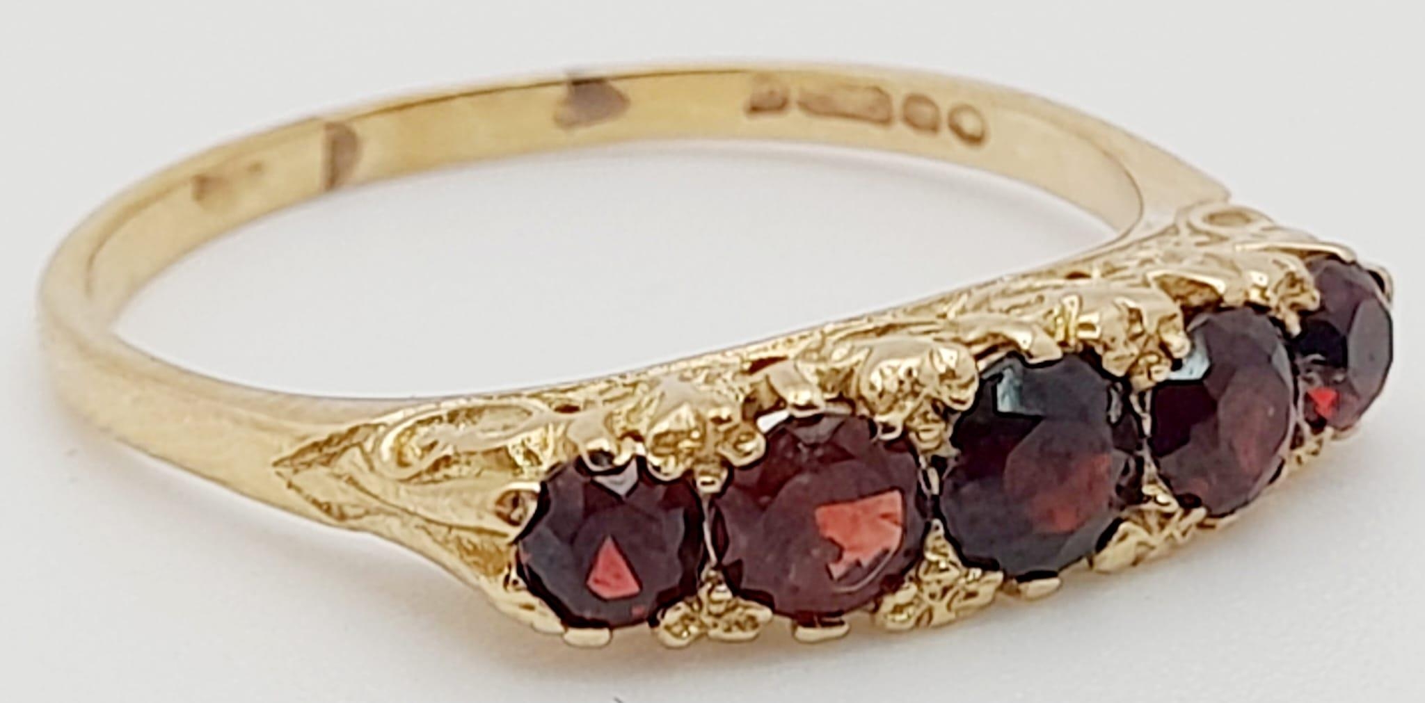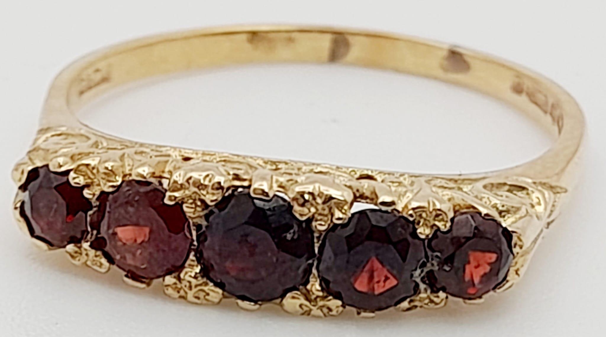9K YELLOW GOLD 5 STONE GARNET RING. TOTAL WEIGHT 3.1G. SIZE T